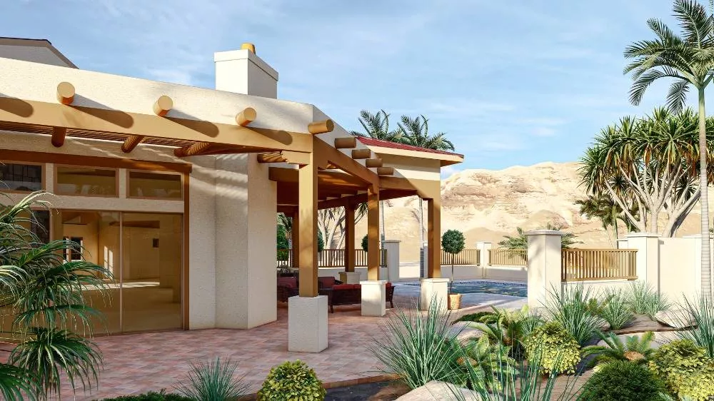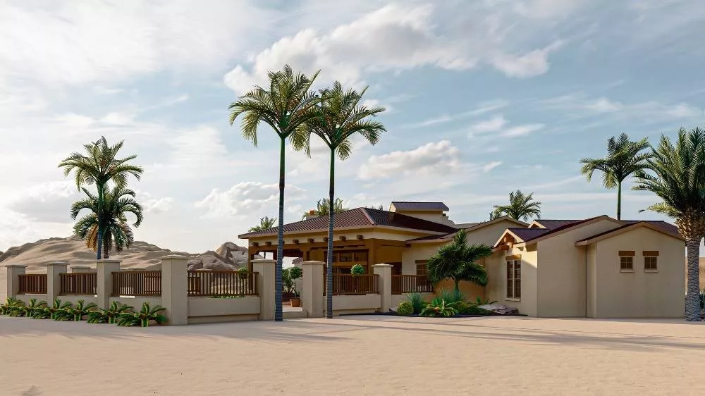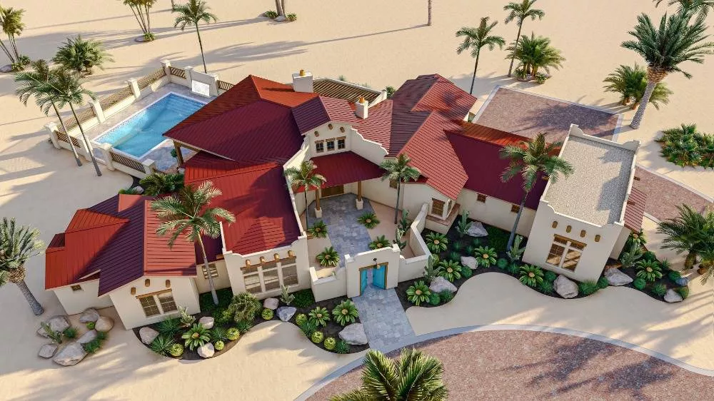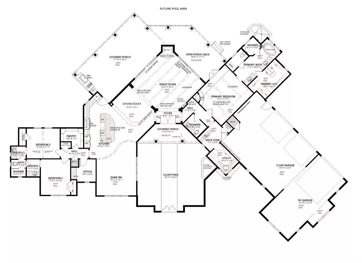 A larger version of our most popular Southwestern designs, House Plan 9887 is a sprawling V-shaped ranch offering 2,945 square feet, three bedrooms, and two-and-a-half bathrooms. But the extra square footage isn't the only major difference--it also has an RV bay beside the regular two-car garage! This unique layout welcomes you in with a spacious enclosed courtyard. Inside, the foyer connects to the beautiful beamed great room with a corner fireplace between two walls of windows straight ahead. To the right, you'll find the hallway with the primary suite, powder room, and mudroom/laundry room that attaches to the rear-entry angled side garage. Make sure to appreciate the luxury afforded by this suite with its corner fireplace, beamed ceiling, and grand five-piece bath! Take a left from the foyer and you'll come to the dining area, L-shaped island kitchen, and game/flex space. The hallway off this area is where you'll find the office and two bedrooms that share a Jack-and-Jill bath to complete the floor plan. But again, that's not all--don't overlook the amazing outdoor living space in back, complete with a BBQ kitchen, covered and open deck areas, and even an outdoor shower. This home is the perfect complement for sweeping views and a balmy outdoor- and travel-focused lifestyle!