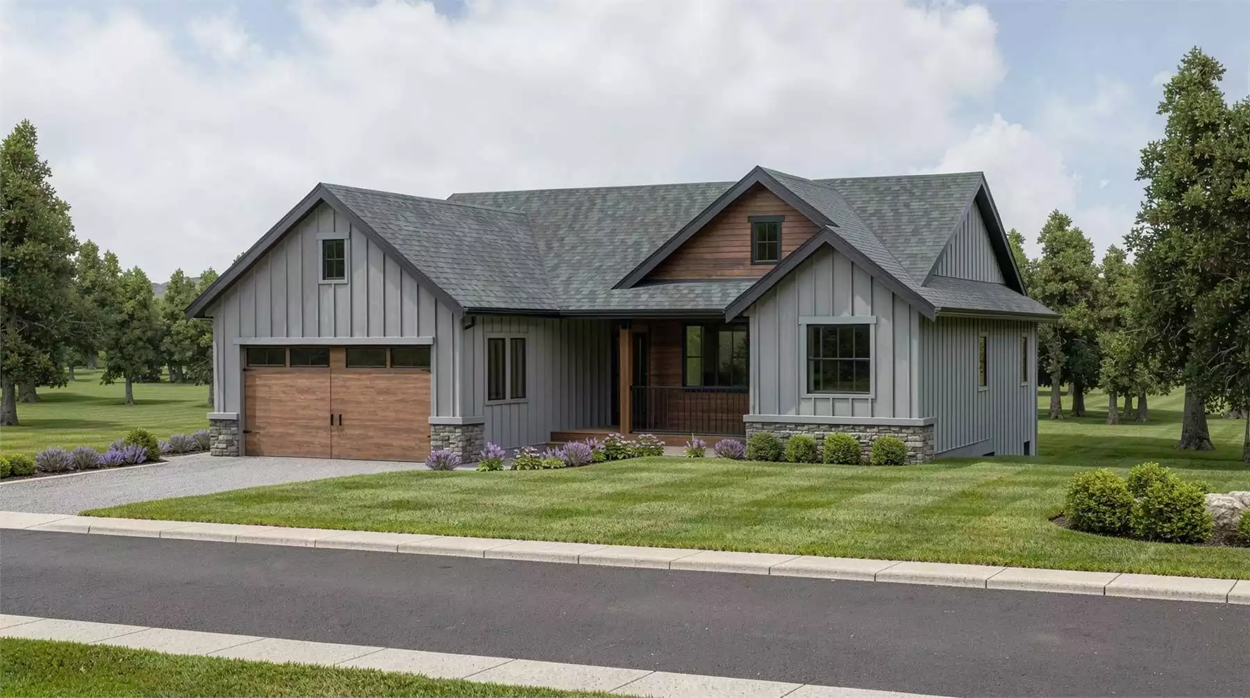 This 1,590 square foot home brings together an open floor plan, warm gathering areas, and a welcoming country kitchen designed for everyday comfort. The kitchen features an island, L-shaped workspace, and walk-in pantry, creating a natural center for meals and family time. The great room connects seamlessly to the dining area and foyer, helping the main living spaces feel open and bright. A main-floor primary suite includes a walk-in closet, double vanity, and a separate tub and shower for a relaxing retreat. Two additional bedrooms offer comfortable accommodations for family or guests, with convenient access to the second full bath. A mud room, first-floor laundry, and dedicated storage areas keep routines organized and clutter under control. With a covered front porch, expansive rear porch, and a deck that suits a sloping or view lot, this home provides a warm and inviting setting for both quiet mornings and easy entertaining.