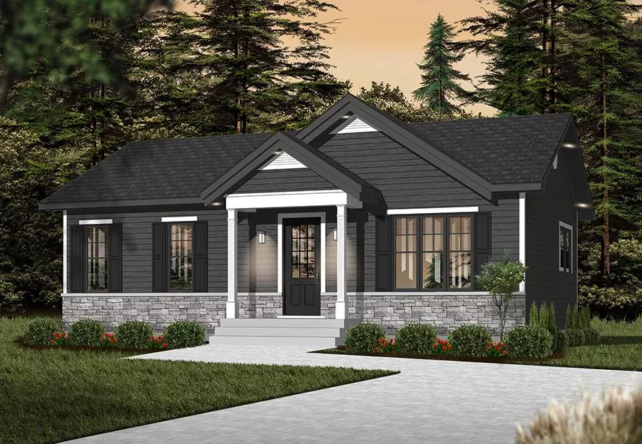 Affordable traditional house plan features 1,872 square feet with 936 square feet and 2 bedrooms on the main level. An open floor plan with a cozy dining space, L-shaped kitchen and family occupy the right side of this compact design. A convenient laundry chute is located in the main bathroom. A 936 square foot finished basement features two additional bedrooms and a family room, perfect for multi-generational families.