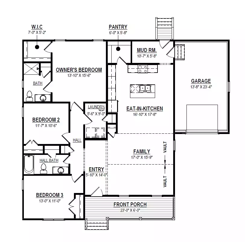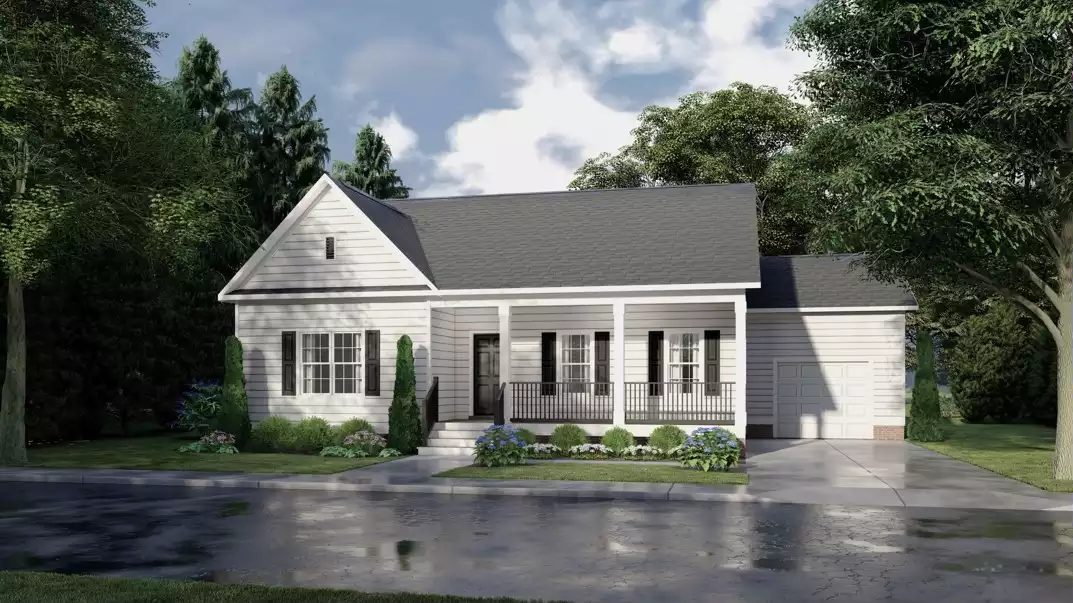 House Plan 10789 is a traditional country ranch with 1,656 square feet, three bedrooms, and two bathrooms that is designed to serve a family well. There's also a front porch with railing for the requisite curb appeal! The floor plan places the bedrooms on one side and the living space on the other. The grouped bedrooms include a primary suite and two that share a hall bath, and the laundry room is located nearby for convenience. The living spaces place the vaulted family room in front, dining area in the middle, and island kitchen in back. There's also a mudroom behind the kitchen that connects to the one-car garage!