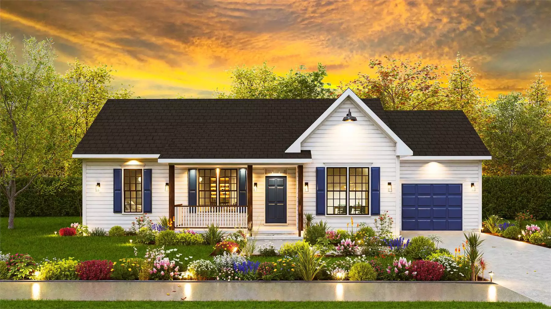 Lansdowne offers a smart and efficient 1,220 sq. ft. layout in a classic single-story traditional design. A closed floor plan separates the kitchen from the dining and living areas, creating defined, private spaces throughout. The primary suite sits privately at the back of the home and includes an en-suite bathroom and walk-in closet. Two secondary bedrooms at the front share a full bath and are ideal for family members, guests, or a home office setup. The eat-in kitchen has ample cabinet storage and opens to a cozy dining nook, while the family room offers a warm gathering space. A 1-car attached garage provides convenient access and additional storage. With timeless curb appeal and a compact footprint, Lansdowne is a perfect fit for first-time buyers, downsizers, or rental properties.