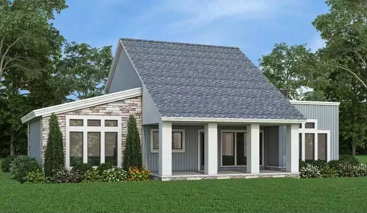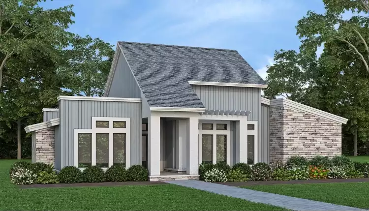 This charming modern transitional home plan seamlessly blends efficiency, affordability, and modern style, all within a compact footprint. With low-pitched roofs optimizing space and cost, every inch is maximized for comfort and functionality. Outside, the fusion of vertical siding, cultured stone, and stucco accents creates a striking contemporary facade. Large windows flood the interiors with natural light and offer refreshing ventilation, connecting you to the outdoors effortlessly. Step through the front entry, where a planter and arbor frame the porch, adding delightful detail. Inside, the foyer welcomes you with a glass shelf display, perfect for showcasing cherished memories.