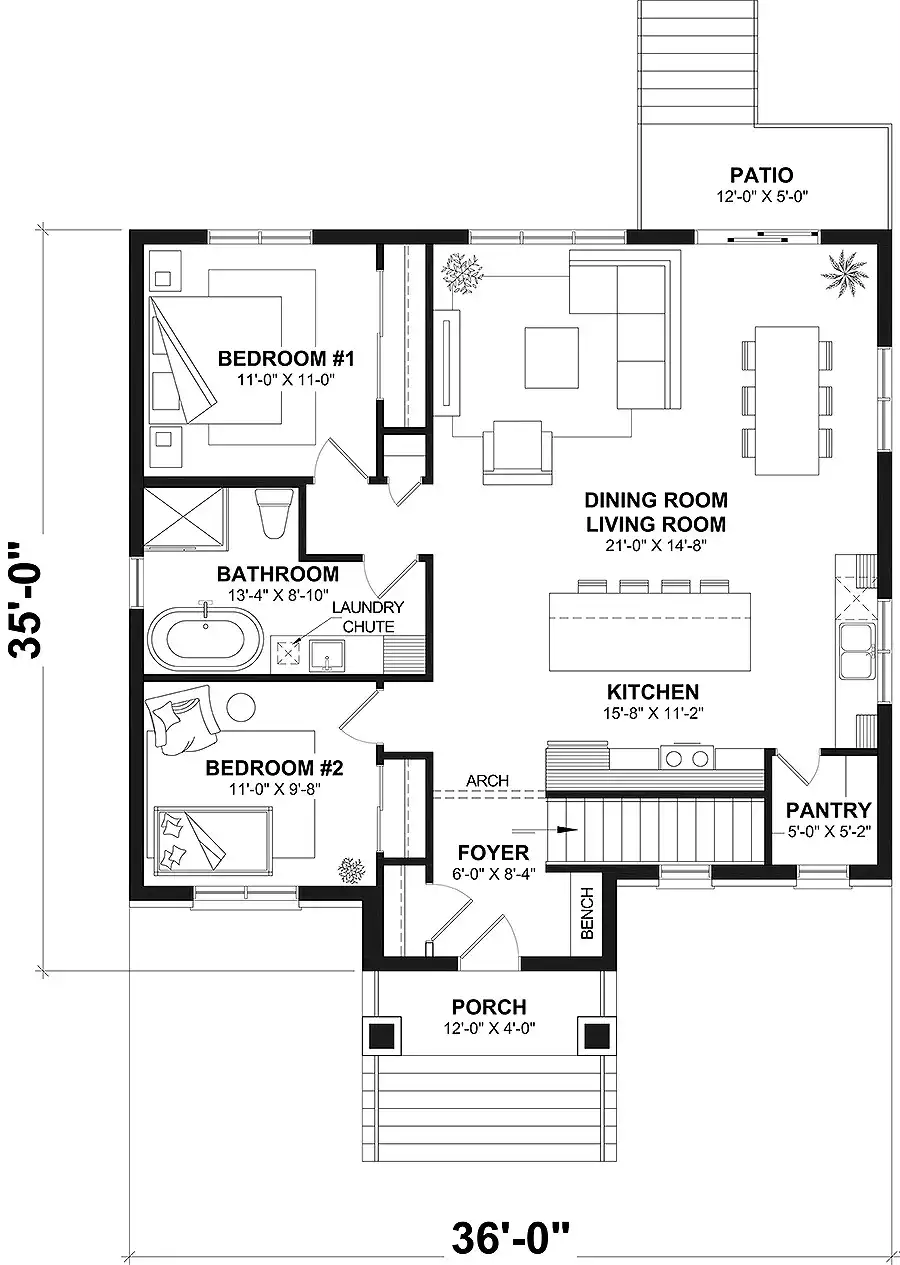 Like a bi-level layout, but don't love the stairs right at the door? Consider House Plan 10001 instead! This inverted design features a main level you enter into and a finished basement. You'll enjoy 2,334 square feet with four bedrooms and two baths evenly split on the stories. Step inside and the main level includes open-concept living, two bedrooms, and a large bathroom to share, complete with a laundry chute. Downstairs, the final two bedrooms share a hall bath that connects to the laundry. There's also a family room for additional living space.