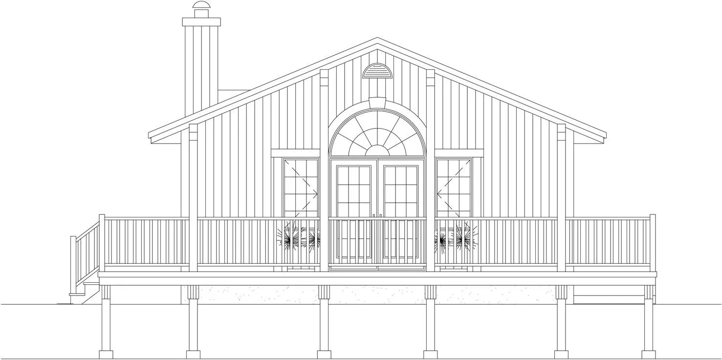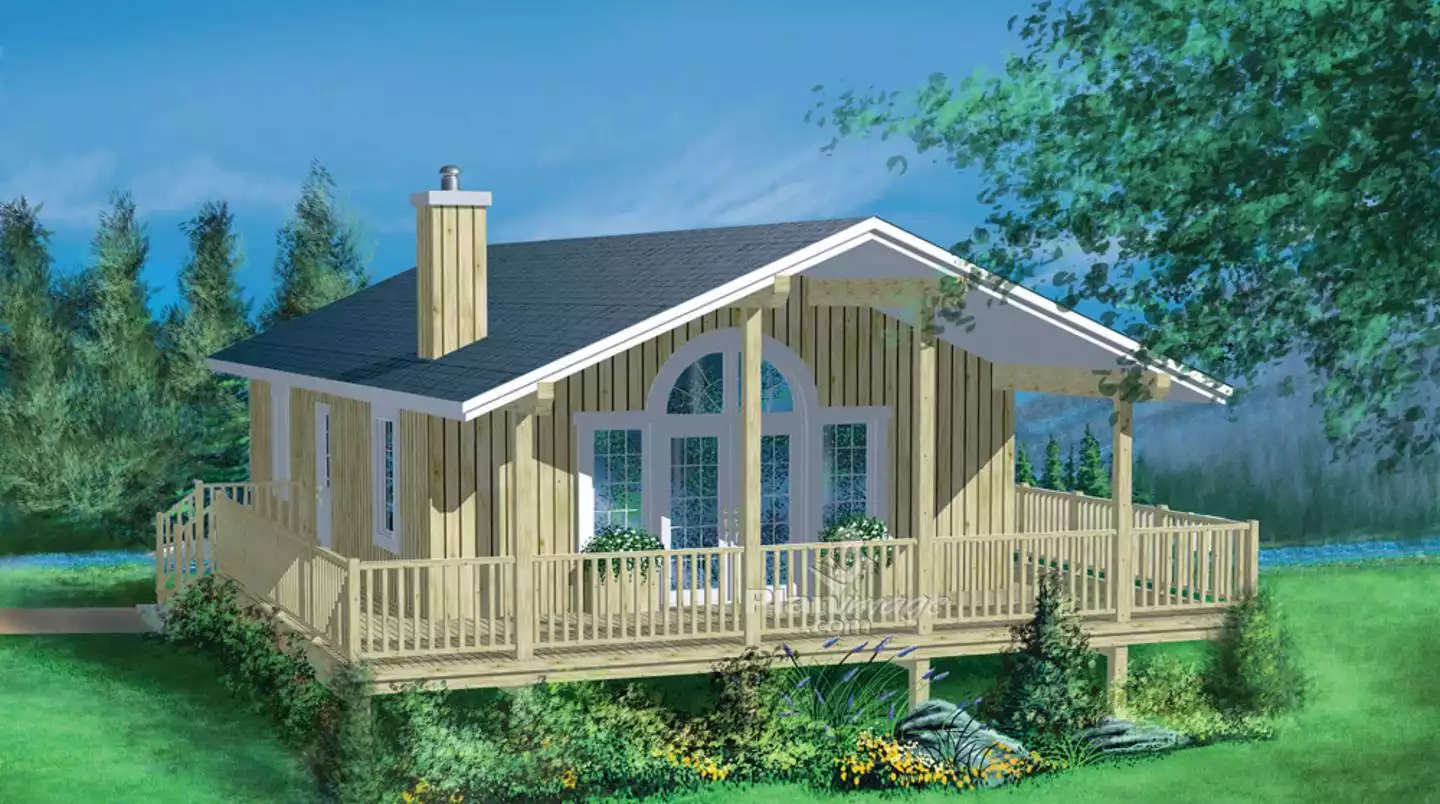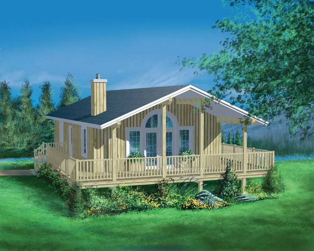 Enjoy the view in House Plan 9916, an affordable vacation home with a three-sided wrap around porch and a 19’ ft vaulted ceiling. As you enter the home through the French doors, the vaulted ceiling continues throughout the living room, including a corner fireplace. With the kitchen's U-shaped design, it provides both function and ease. The kitchen area with its lower ceiling, offers a clear view of the living room while capturing the outdoor scenery. Expand your space by finishing the unfinished basement, if you like!