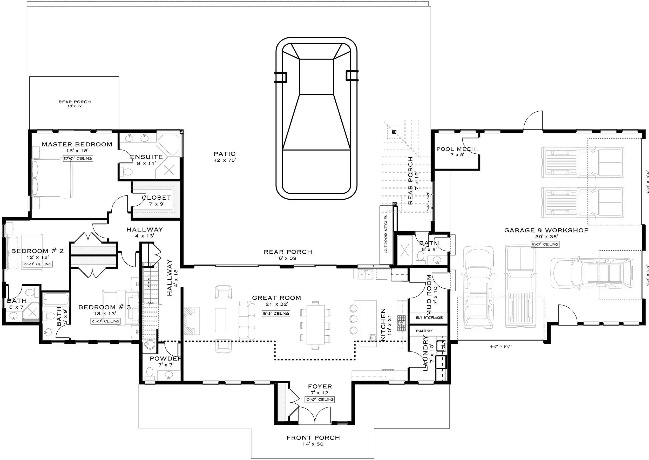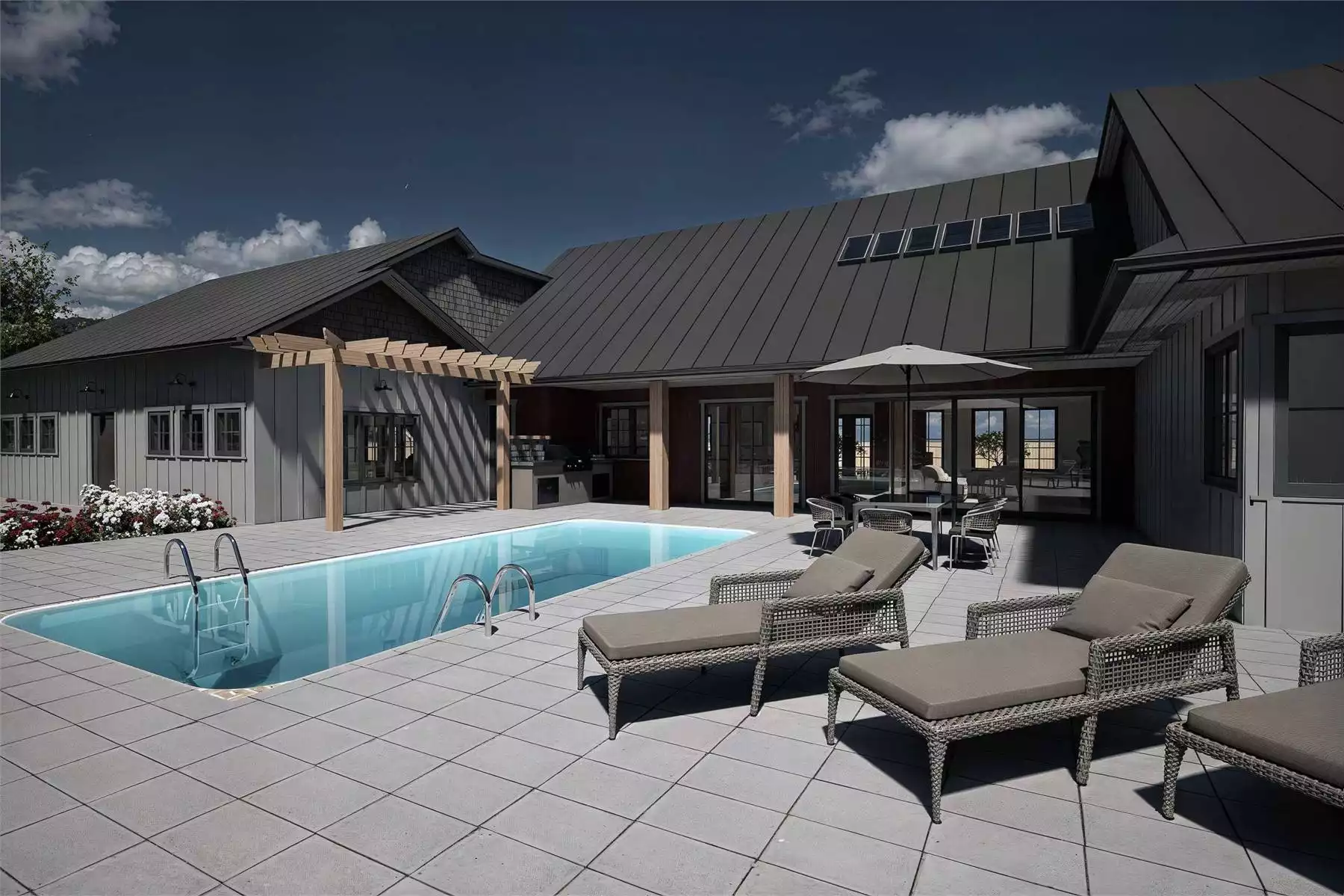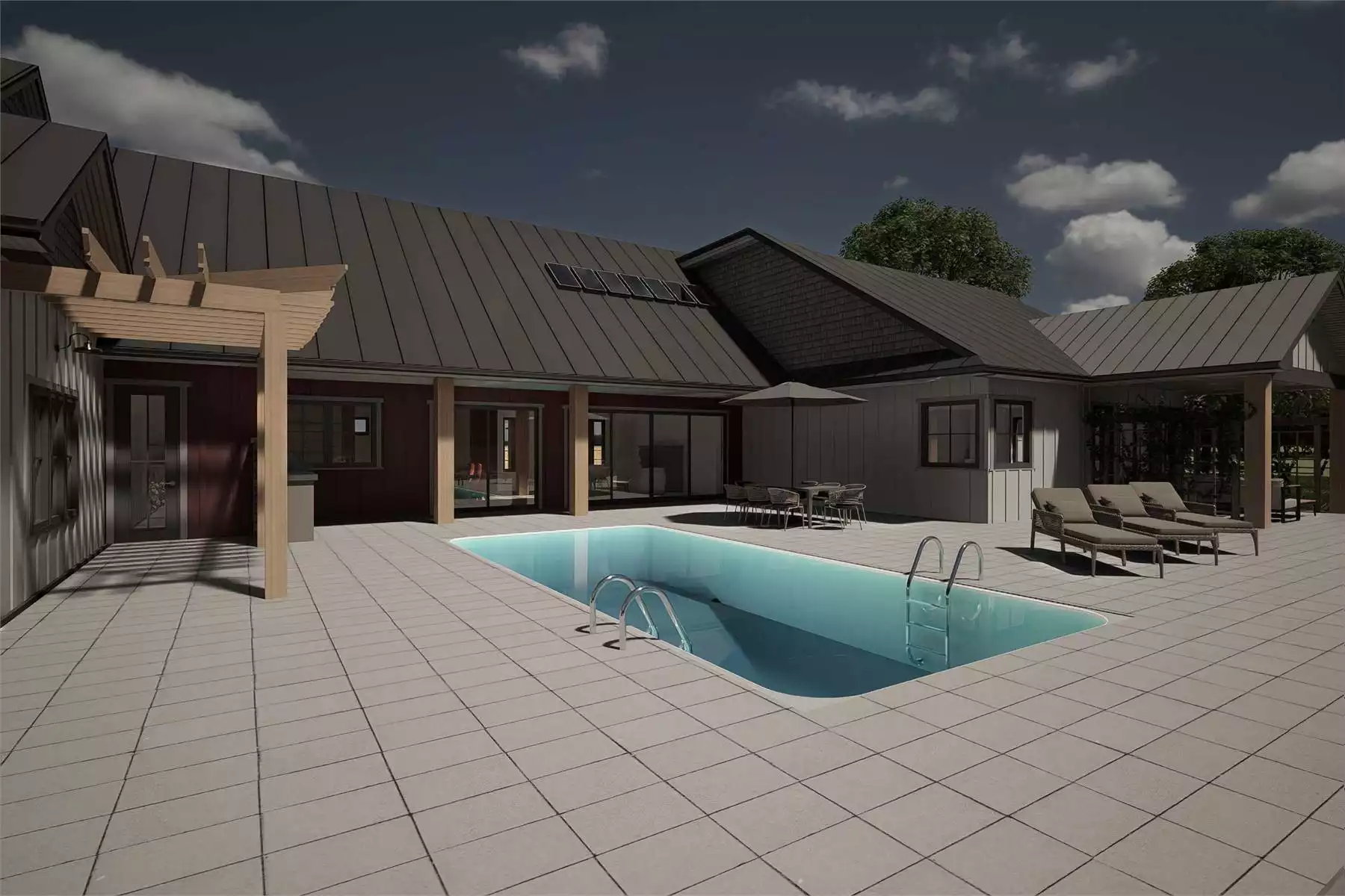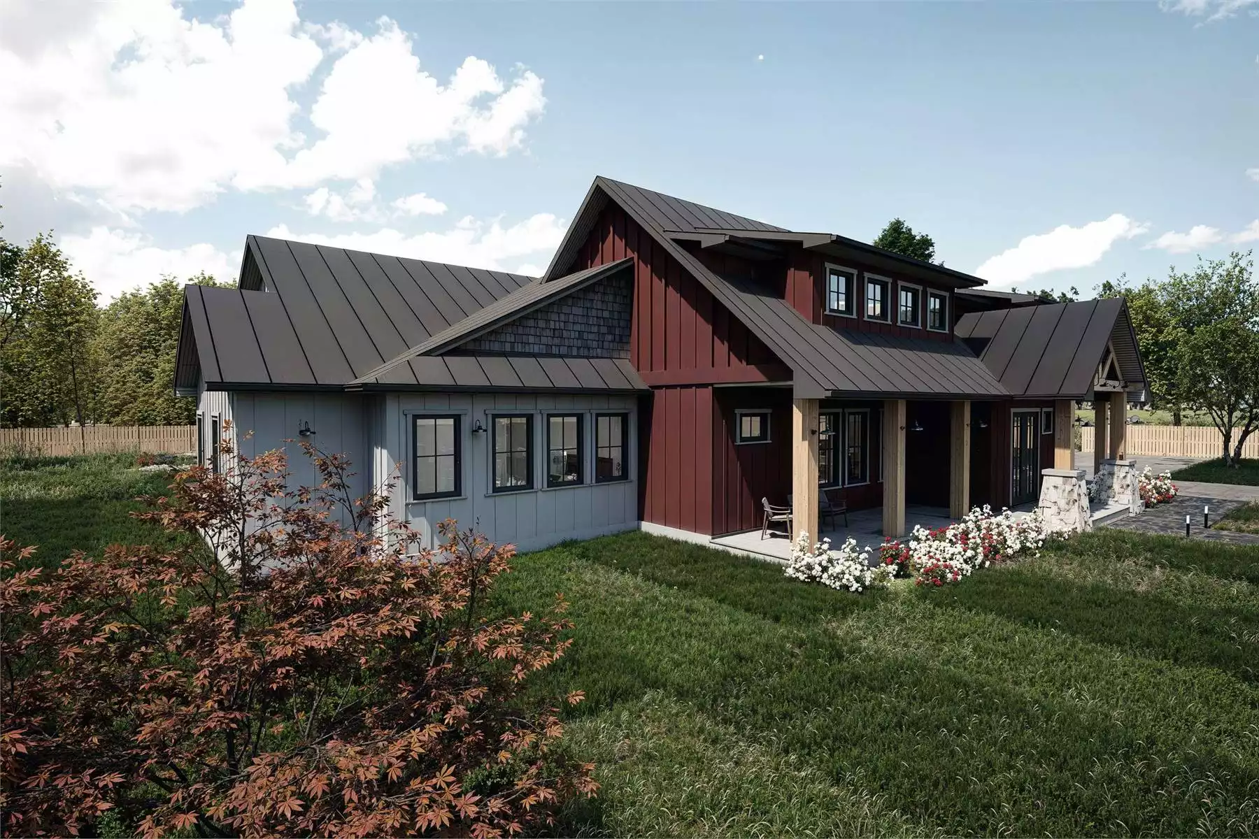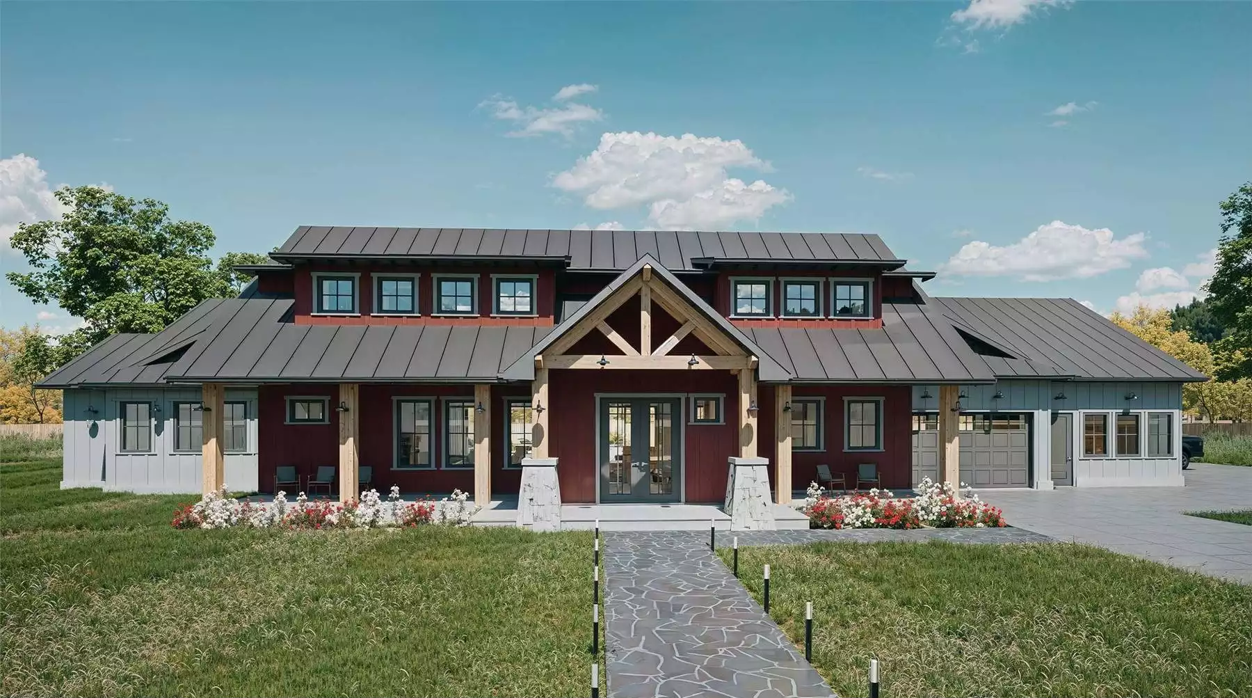 If you're looking for a spacious barndo-inspired country home that concentrates on main level living, House Plan 10611 could be a great fit! This charming design offers 3,111 square feet with 2,564 square feet including all main areas and the bedrooms on the first floor. Step inside and a foyer invites you to drop your coat before welcoming you into the totally open-concept great room. There's a U-shaped island kitchen on one side, dining space in the middle, and living space with a fireplace on the other--all beneath a two-story ceiling! You'll find the laundry room and the mudroom to the garage behind the kitchen. With 1,435 square feet and parking for five between two front bays and three side bays, plus a full bath and extra space for a workshop, this garage is a car person's dream! On the opposite side of the house, there's a hallway off the living area that includes the powder room and three bedroom suites. The primary suite has a five-piece bath and a walk-in closet while the other two bedrooms have three-piece baths and reach-in closets. Take the nearby stairs up and you'll find the last 547 square feet of this home in a loft overlooking the great room. It's imagined as two office areas connected by a catwalk, but you can do whatever you like here! Finally, House Plan 10611 offers tons of outdoor space in front and back. The plans do not include a pool, but one has been imagined in the expansive patio that the floor plan wraps around. With the outdoor kitchen and the garage bath with dual access, this setup is perfect for summer parties!