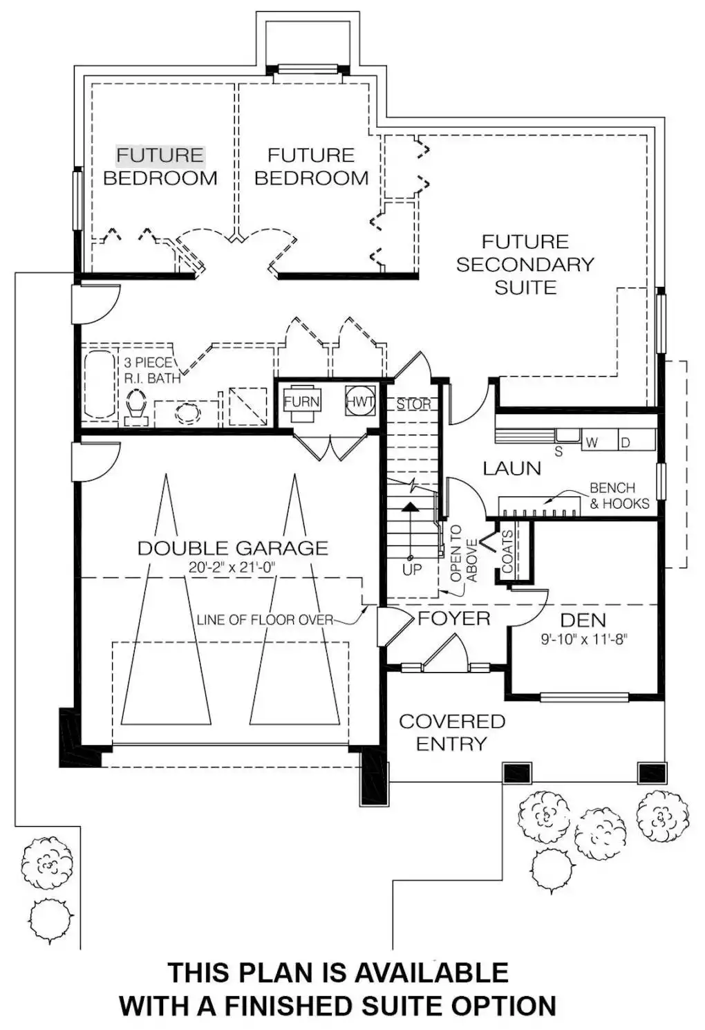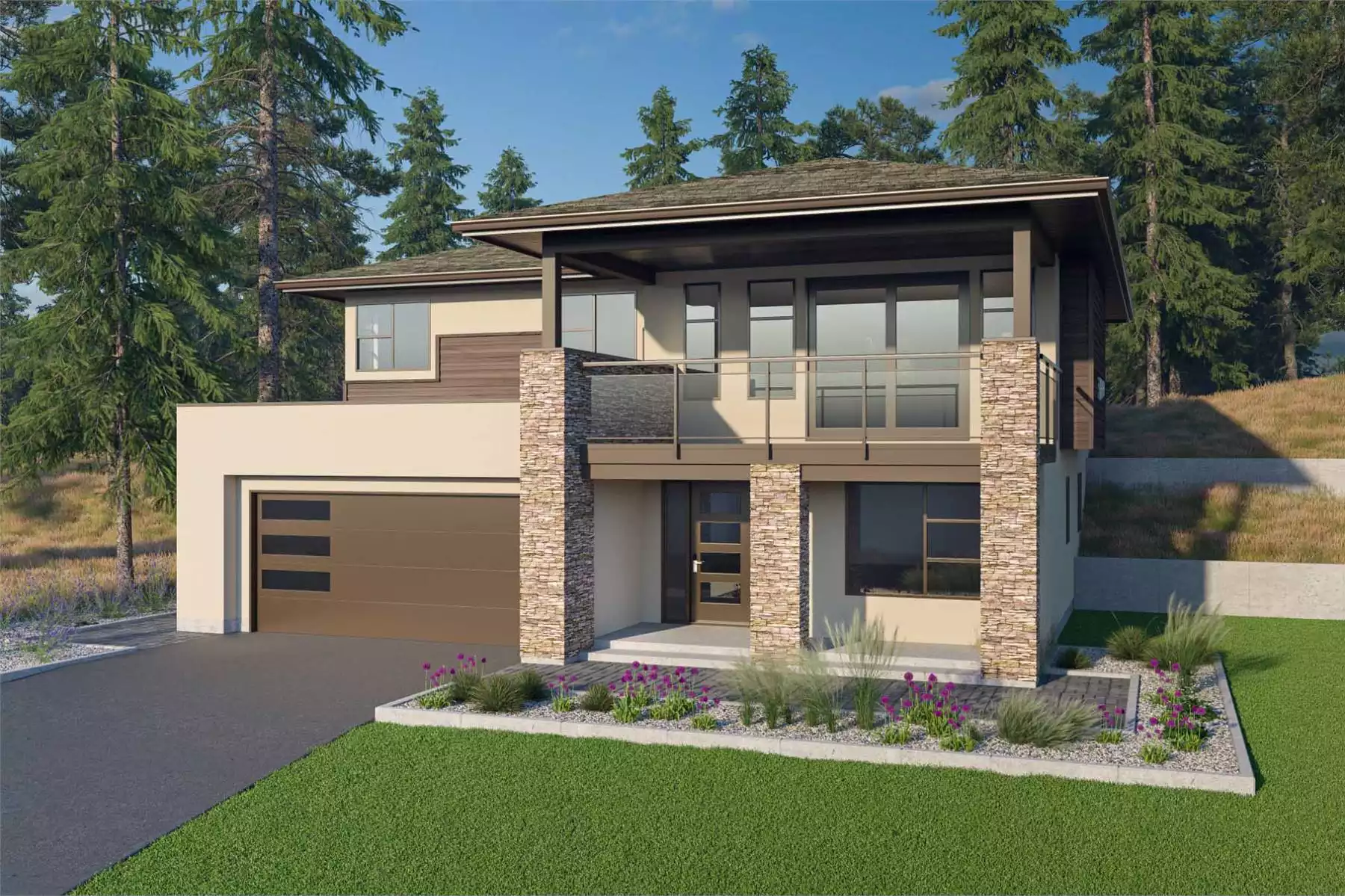 The Torani is a sleek three-bedroom family home with a contemporary design and thoughtful layout. A covered entrance with brick pilasters welcomes you into the foyer, where a spacious den doubles as an ideal home office. Upstairs, the great room boasts a coffered ceiling, a gas fireplace with built-in shelving, and sliding doors to a covered deck with a glass balustrade. The kitchen, separated from the dining area by a prep island, features a window overlooking the patio and backyard. The private primary suite offers garden views, an ensuite with a double sink and shower, and nearby linen storage. Two additional bedrooms share a three-piece bath and overlook the double garage. The ground level includes an unfinished two-bedroom suite with roughed-in plumbing, offering future flexibility. Exterior finishes of brick, stucco, and horizontal siding complete this modern gem.