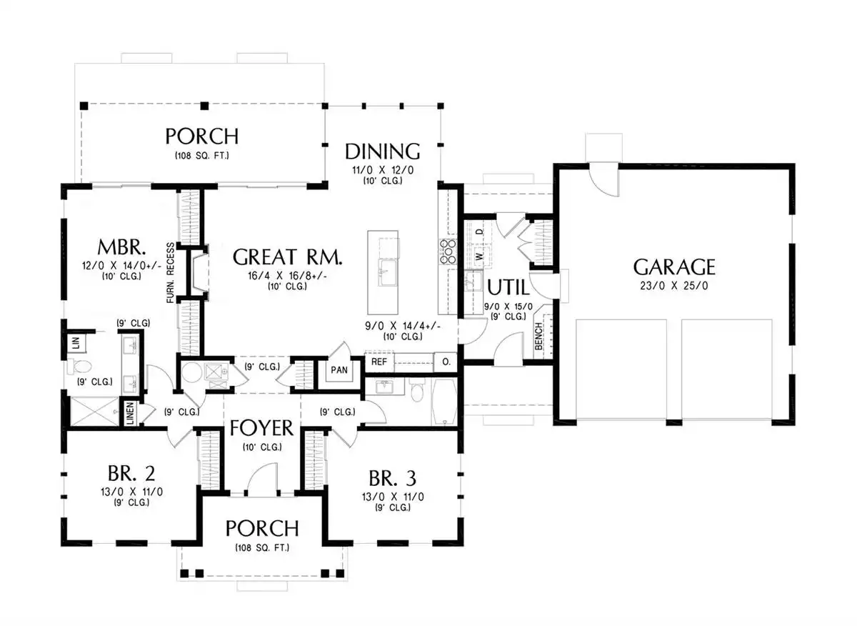 If you're looking for a cute farmhouse to make your own, House Plan 10279 offers a unique layout in 1,619 square feet. The foyer welcomes you in first, of course, and then a crossing hallway connects the three bedrooms and two bathrooms, with the primary suite and one additional bedroom on one side of the foyer and the final bedroom and the hall bathroom on the other. Every bedroom has windows on two sides for tons of natural light! The open-concept living areas farther inside include an island kitchen, sunny dining nook, and the great room with a fireplace. You'll find the laundry/mudroom off the kitchen, and it has doors to the front, rear, and two-car garage. Talk about a well-connected design!