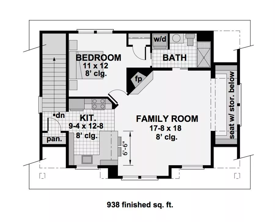 This 3- car bungalow cottage garage house plan features a full living space above with a bedroom, bath, kitchen and family room. The garage totals 988 square feet, and then the upper living area is 934 square feet. Perfect for a home addition, vacation home or rental property.