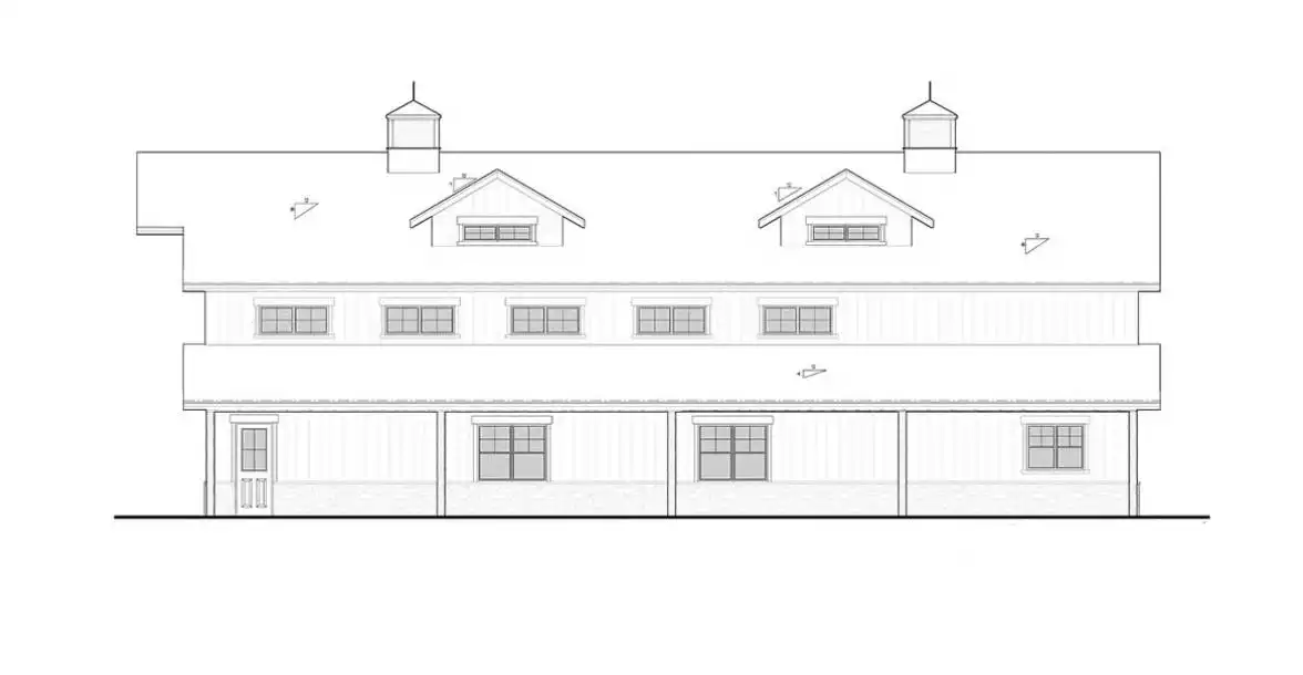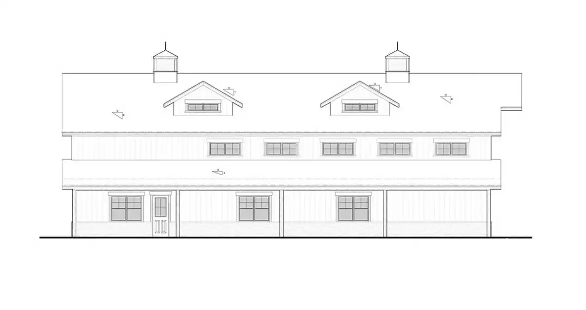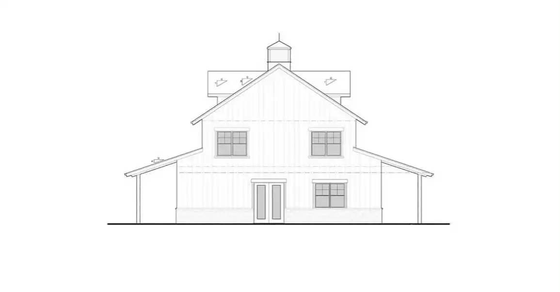 Looking to add storage and live-in potential to your property? Plan 10673 could be the design for you! This grand barn has a perfectly rectangular shape with covered porches along the long sides and a two-story ADU in back. You can access the barn space through two sets of slide-away carriage house barn doors on the front. There's plenty of room for vehicles, equipment, or a workshop! There's also a handy powder room bath in the barn, as well as a mezzanine above the doors--accessible up the stairs inside and through French doors outside, so it's primed to be a hay loft! The ADU apartment has exterior access on two sides and 1,554 square feet with two bedrooms and one-and-a-half baths. The main level has the totally open living areas, including the L-shaped island kitchen on one side and the family room with a corner fireplace on the other. There's also a powder room and stacked laundry beneath the stairs. Upstairs, two bedrooms share a divided Jack-and-Jill bath. It's a great setup for guests or staff!