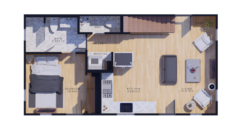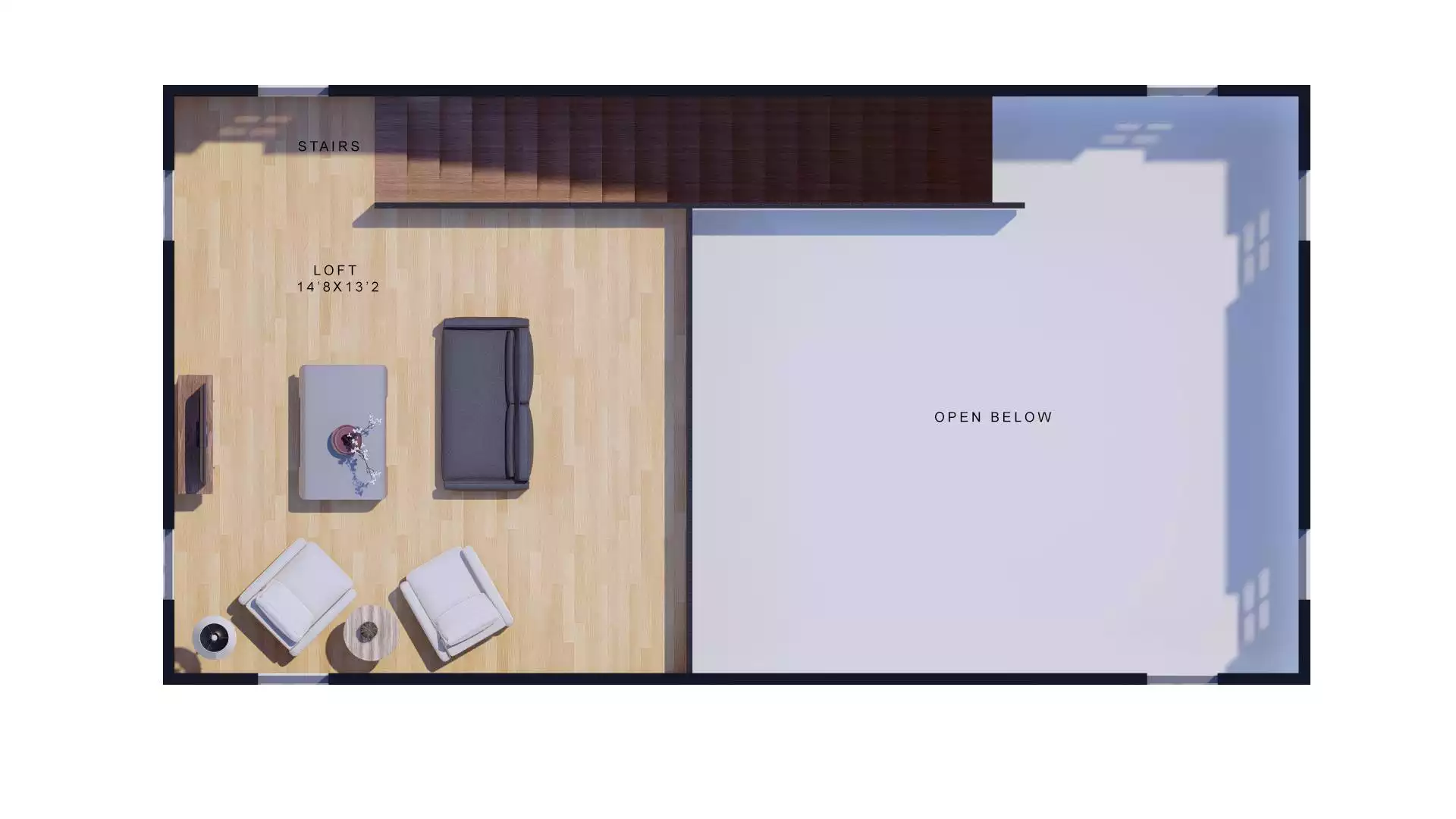 The Mount Forrest is a charming 778 square foot Barndominium-style home with two stories and a flexible layout. It features one bedroom with a spacious ensuite bathroom on the main floor, along with a laundry area, an L-shaped kitchen, and a large open living space. Upstairs, a versatile loft adds extra room for work, play, or storage. With no garage, this compact design is perfect for small lots, first-time homebuyers, or as a guest suite, in-law unit, or additional living space.