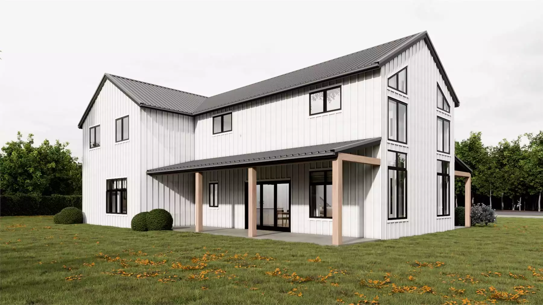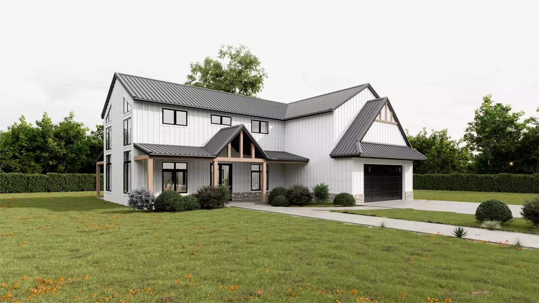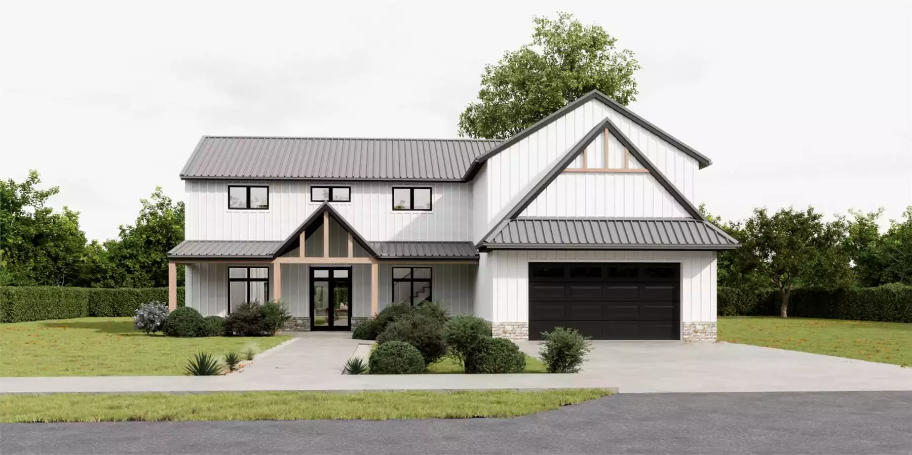 At 2,587 square feet, Windfall Acres is a classic barndominium-style home offering 4 bedrooms, 3.5 bathrooms, and a 2-car garage in a bright, open layout. A wide covered front porch welcomes you into the spacious living room with a cozy fireplace and access to the rear covered patio. The adjoining dining area flows into an L-shaped kitchen with a central island and pantry, perfect for gatherings. The main level includes a private primary suite with a large walk-in closet and spa-like ensuite featuring a soaking tub. Upstairs, a loft and media/game room provide plenty of space to relax, along with three additional bedrooms and two full baths. A mudroom connects directly to the garage for everyday convenience.