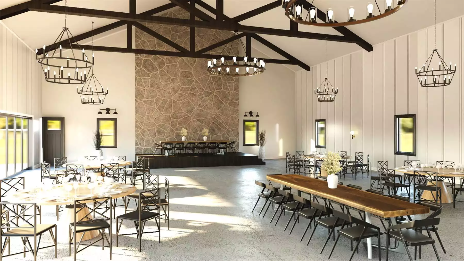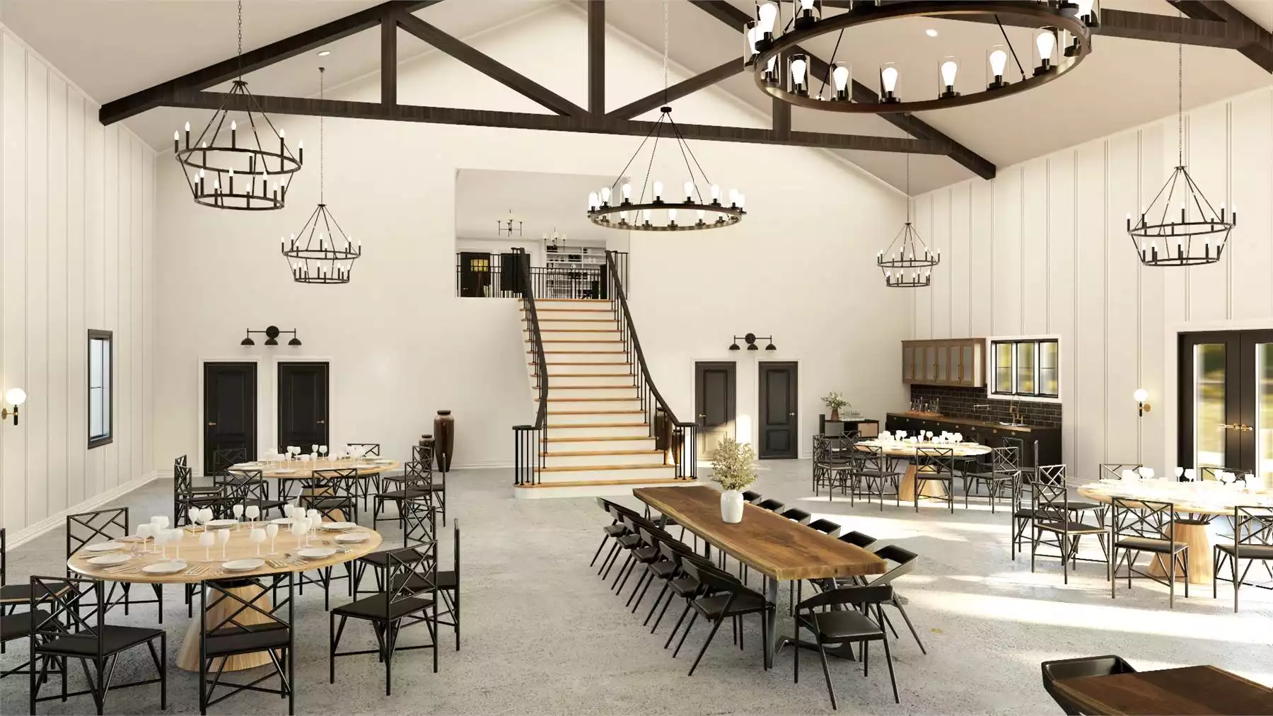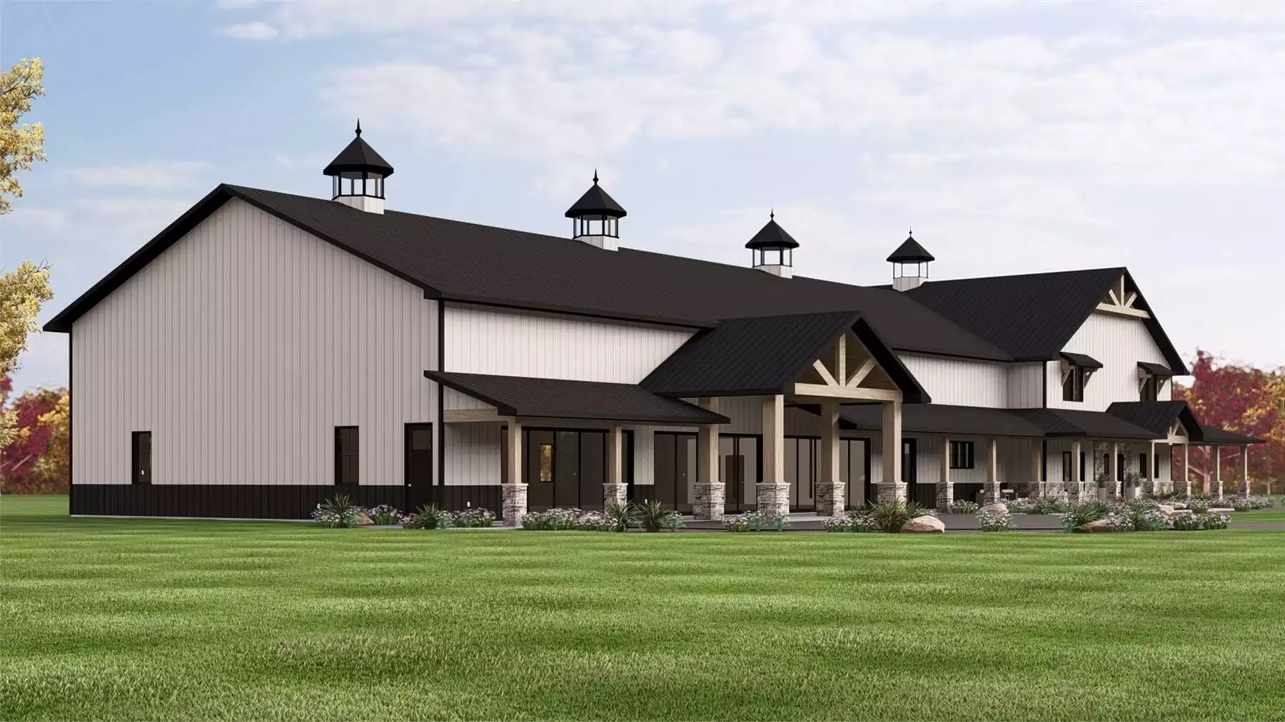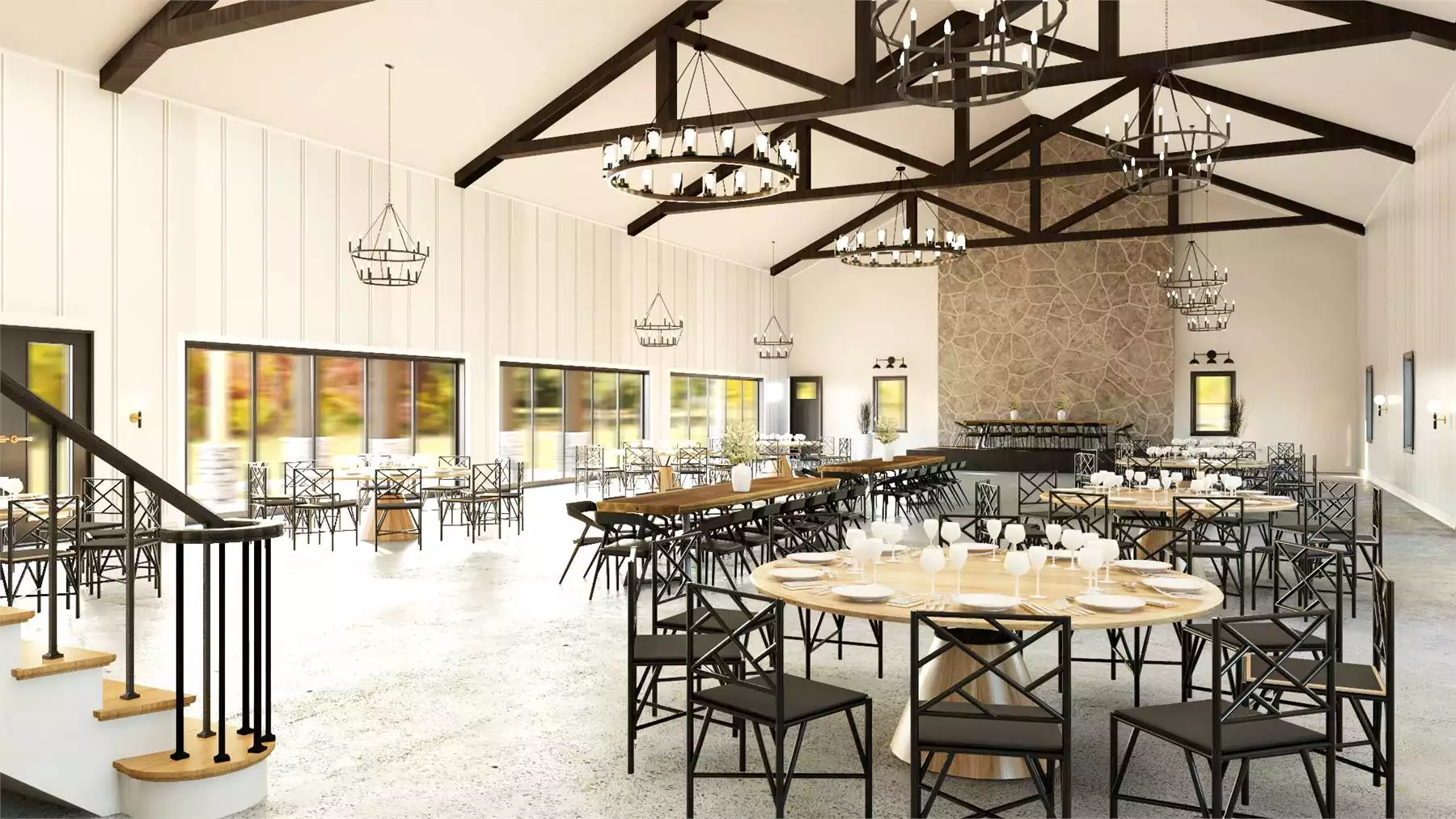 Springfield Ridge is a striking barndominium-style design that blends residential comfort with large-scale entertaining potential. The centerpiece of the plan is a massive event center offering over 5,000 square feet of open space, complete with a stage, multiple covered porches, and excellent flow for gatherings, celebrations, or community events. Adjacent to the event space, a private residential wing includes a comfortable lounge, kitchenette, storage room, and a welcoming lobby area with direct access to outdoor living spaces.