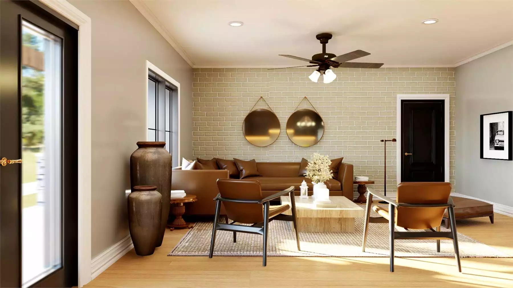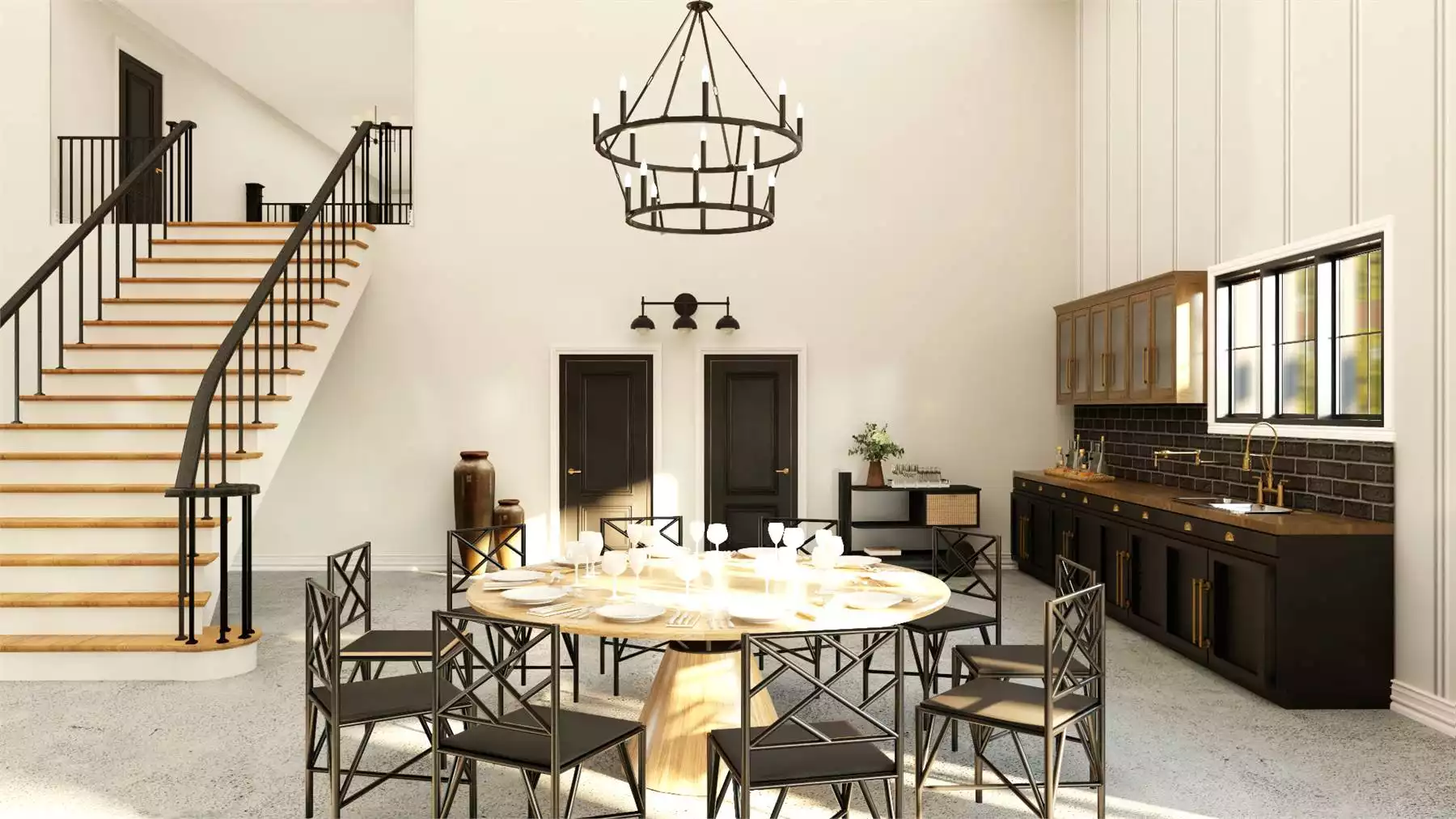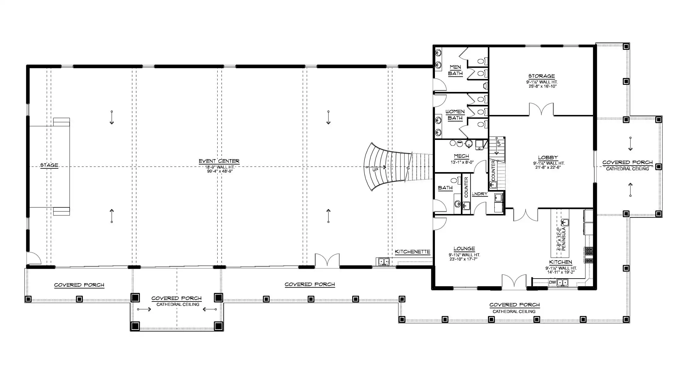 Springfield Ridge is a striking barndominium-style design that blends residential comfort with large-scale entertaining potential. The centerpiece of the plan is a massive event center offering over 5,000 square feet of open space, complete with a stage, multiple covered porches, and excellent flow for gatherings, celebrations, or community events. Adjacent to the event space, a private residential wing includes a comfortable lounge, kitchenette, storage room, and a welcoming lobby area with direct access to outdoor living spaces.