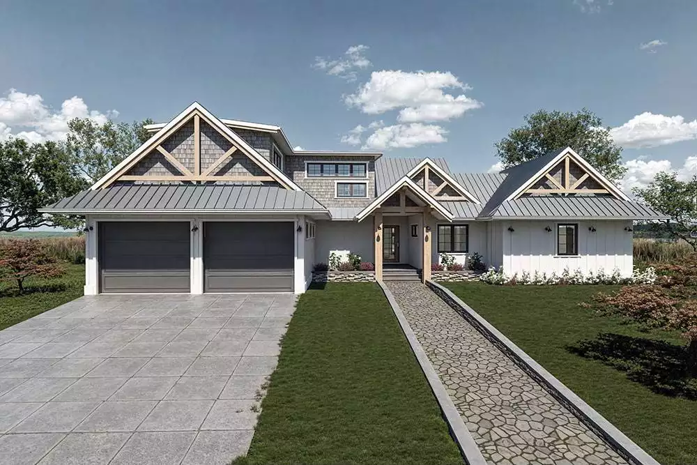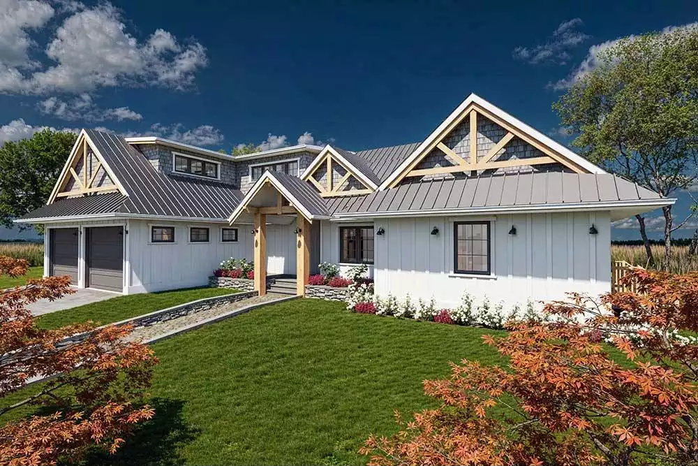 Perfect for a beachy lot with a view, House Plan 11009 offers 2,048 square feet with three bedrooms and two-and-a-half bathrooms across two stories. The facade welcomes you home with a front-entry two-car garage, gables with Craftsman decorative millwork, and a front porch flanked by planters leading to the entry. The main level places a closet by the foyer for convenience. The hallway to the side includes the powder room, den, and the primary suite that enjoys rear views, a walk-in closet, a four-piece bath, and its own private side porch. The great room spreads out in front of the foyer and boasts a vaulted ceiling and fireplace in the living area and an island kitchen beside casual dining space. This whole area connects to the rear porch for seamless indoor/outdoor living! The walk-in pantry and the laundry/mudroom that connects to the garage can be found behind a pocket door in the kitchen. Head upstairs to find two bedrooms that share a hall bath. It's a great layout for year-round or vacation living!