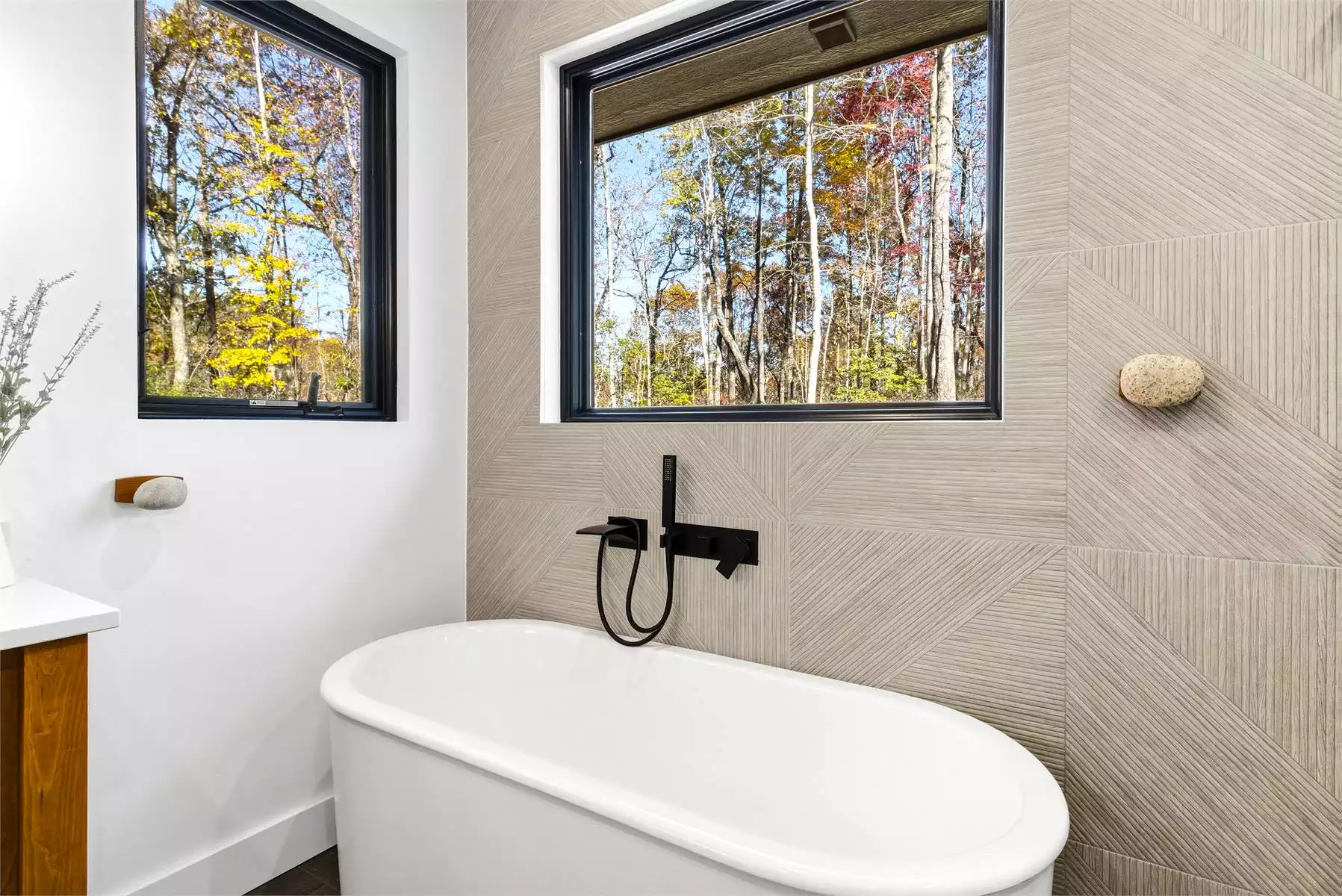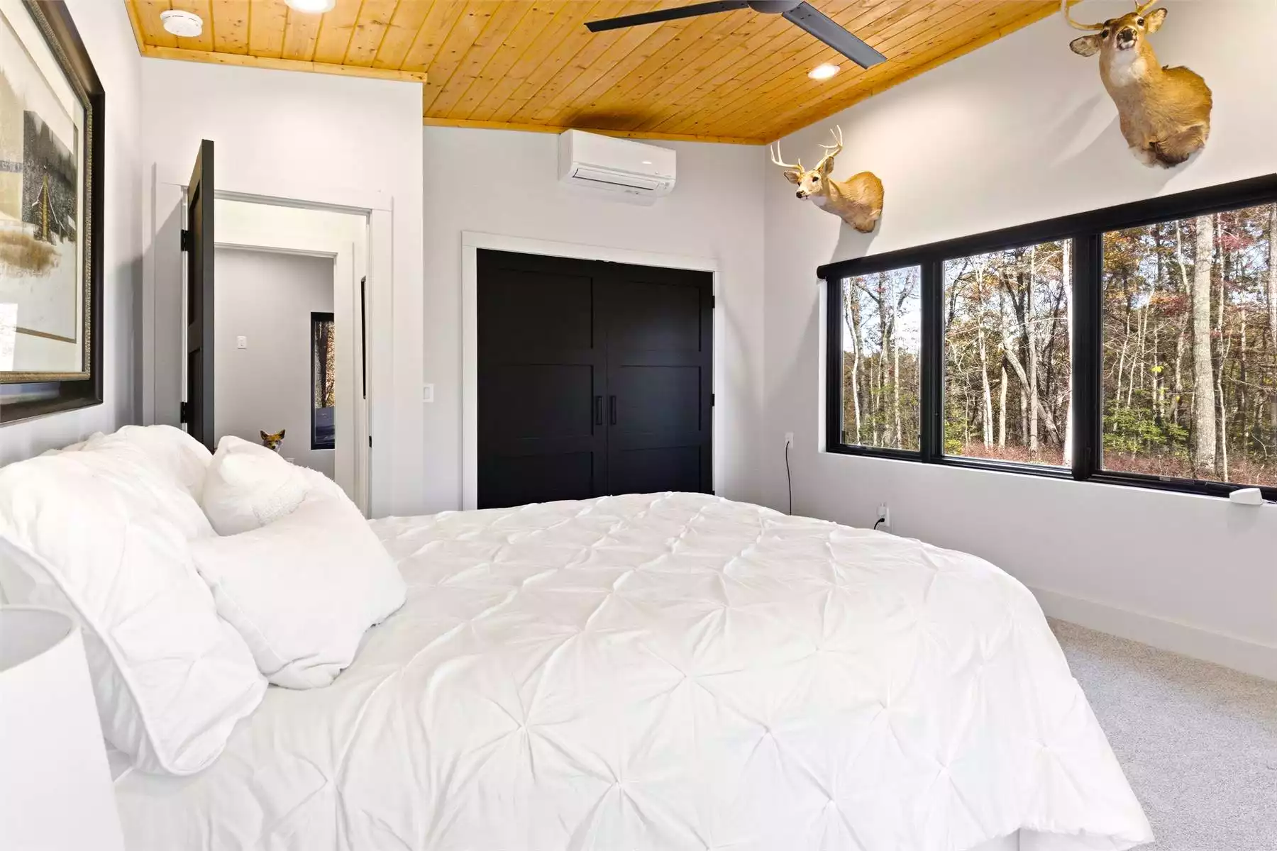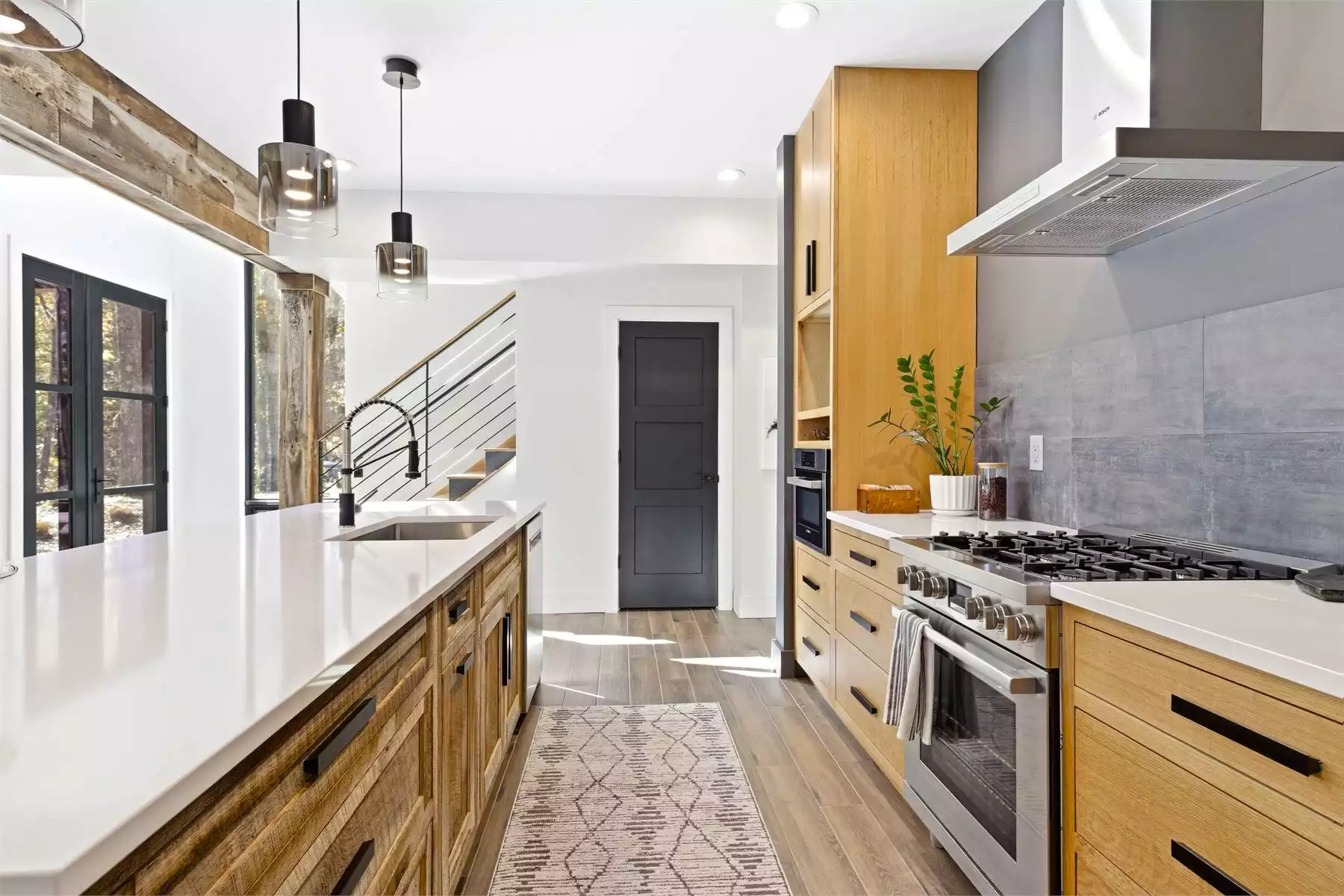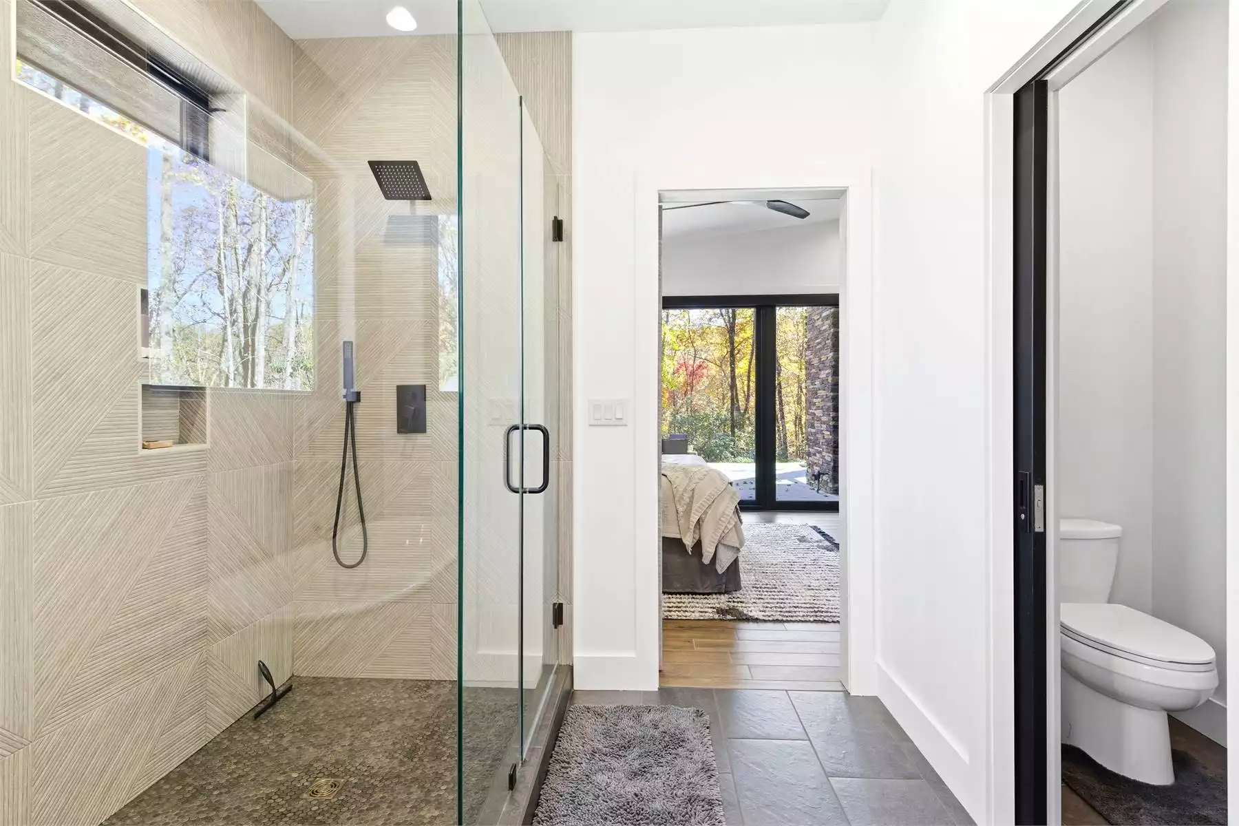 House Plan 11879 is a unique contemporary home perfectly suited for year-round or vacation living with its view-capturing design. It offers 2,102 square feet with three bedrooms and two-and-a-half baths split on two levels, so it also checks the boxes for most families. Step inside and the great room is front and center with a two-story vaulted living space with floor-to-ceiling windows. The island kitchen and dining area overlook the living area to share in the views, too! The primary suite is placed on one side and boasts indoor/outdoor connection with patio doors and transom windows in the front bedroom as well as large windows in the rear five-piece bath. The powder room and laundry/mudroom that connects to the side-entry rear garage round out this level. Head up the stairs by the front entry and you'll come to a landing hallway with a bathroom and the final two bedrooms. The rear-facing bedroom looks out over the garage while the front bedroom has side windows and opens up to look over the great room when you slide the barn door away!