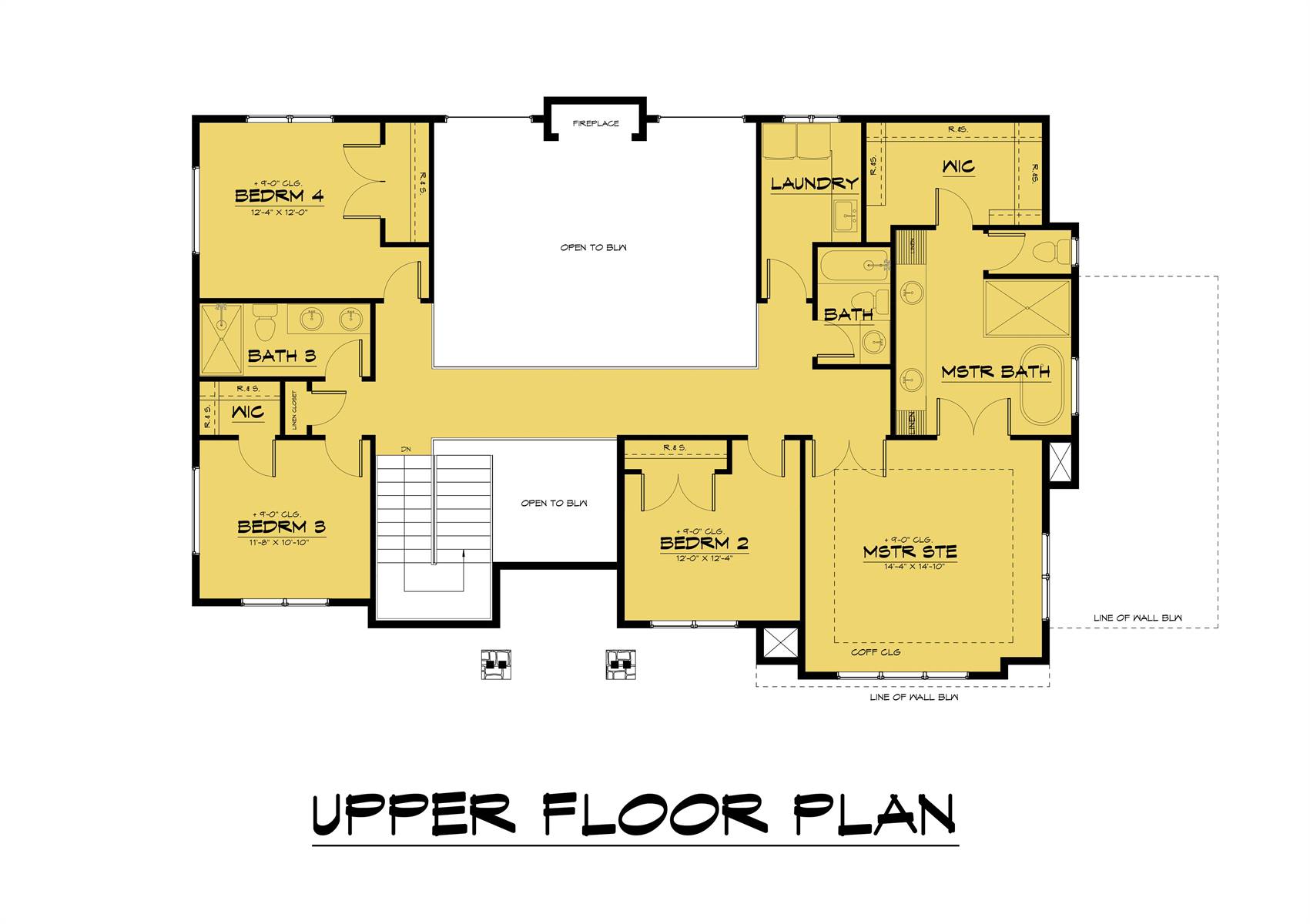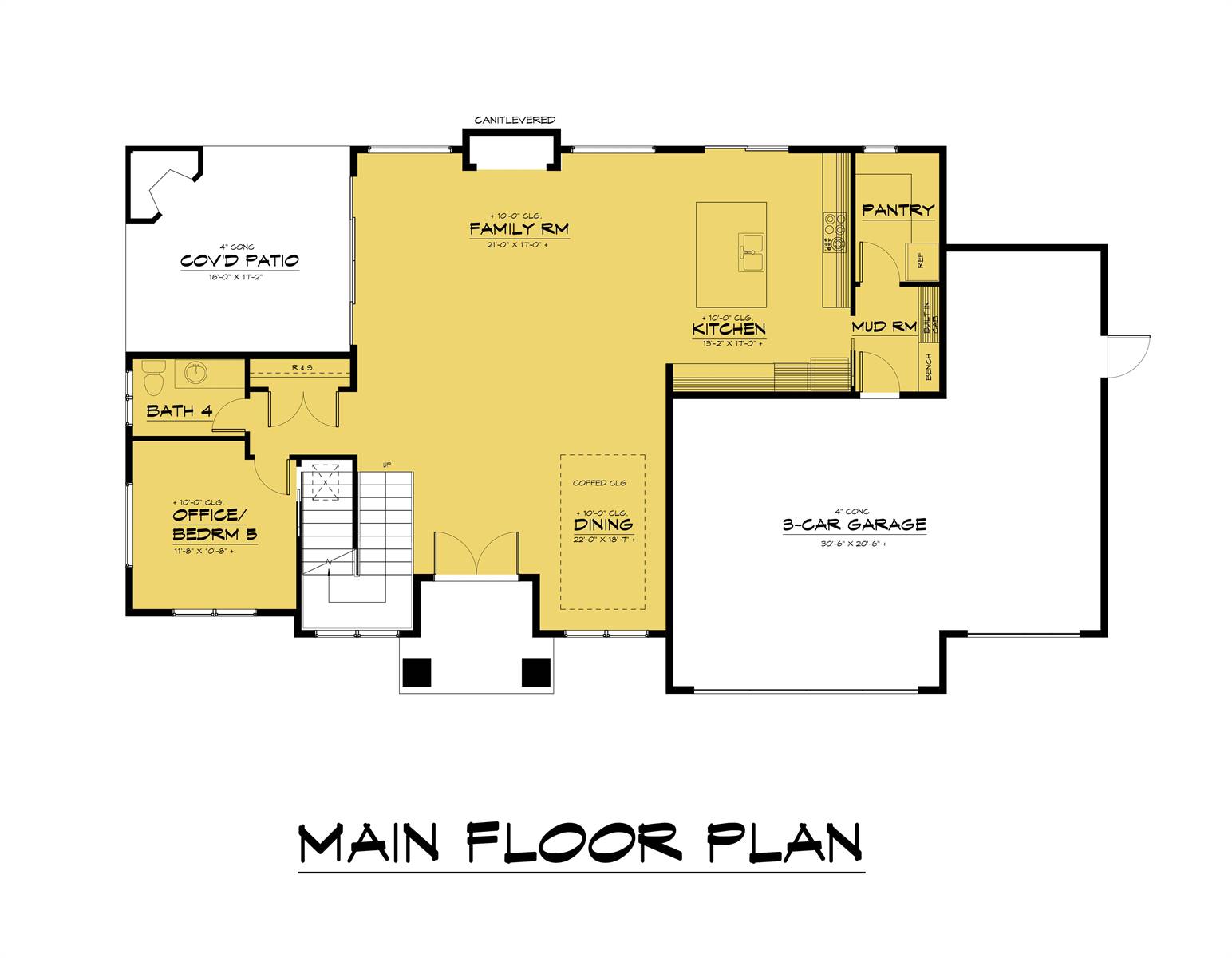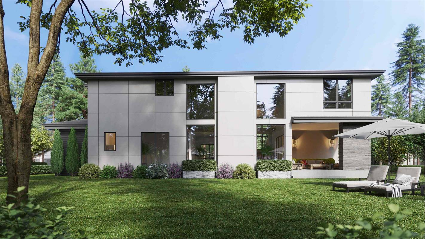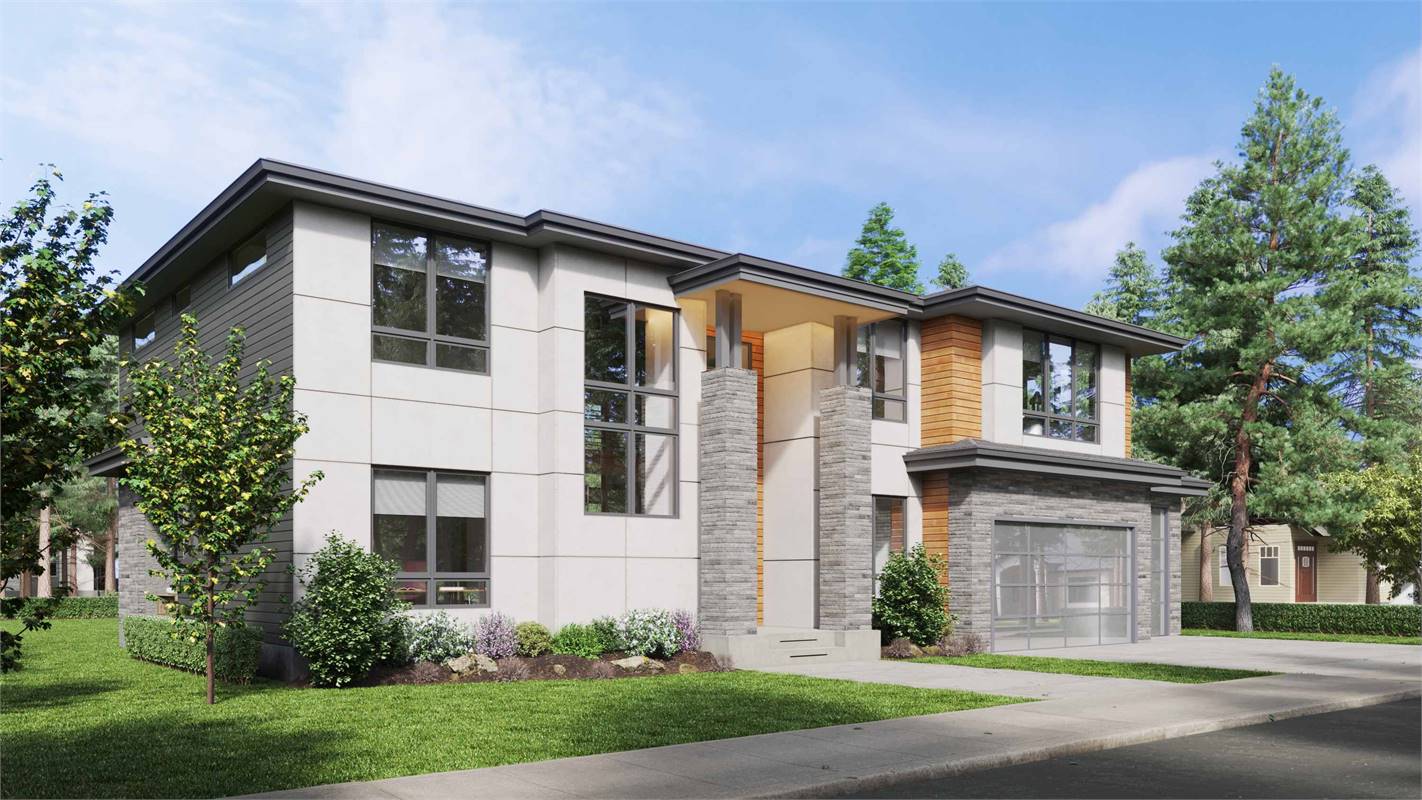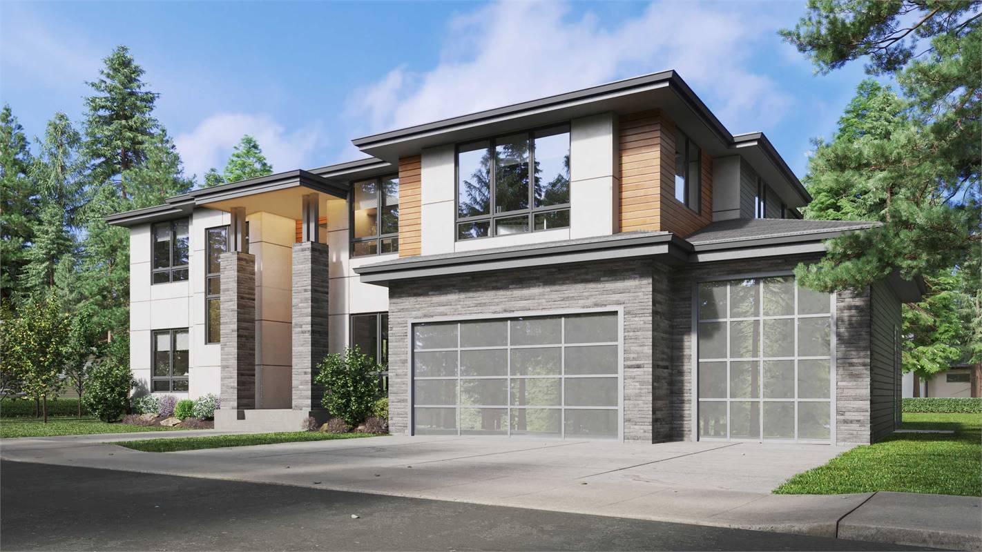 Beautiful blend of stone and concrete panels highlight this 5-bedroom contemporary house plan featuring 3,000 square feet. The kitchen opens to a two-story family room and fireplace with large windows that expands to a covered patio. The main level offers a home office or optional 5th bedroom. Upstairs are 4 bedrooms, including a large master suite and laundry room.