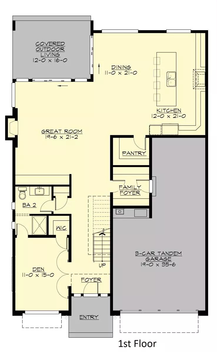 Perfect for a neighborhood thanks to its compact two-story shape and straight sides, House Plan 6985 is sure to be a family's modern dream house! This 3,422-square-foot design boasts four bedrooms, three bathrooms, and a wonderful mix of additional areas that provide all the flexibility you need. Enter through the front door and you'll find a den off the foyer. This den connects to a full bath, so it would make a nice guest suite, too. You'll find a handy coat closet by the hall access to this bathroom. The family foyer that connects the tandem three-car garage to the interior also has built-ins to store your outerwear! The open living spreads out at the back of the house, with an island kitchen beside dining space and a great room with a fireplace. The dining and great room both open to the covered outdoor living for a breezy feel! All the bedrooms are located upstairs. The primary suite has a luxurious five-piece bath and a walk-in closet while the other bedrooms share a divided hall bath. But that's not all! The laundry is also up here for convenience, and there's a sizable bonus room that would make a lovely secondary living room, playroom, game room, or whatever else you may need.