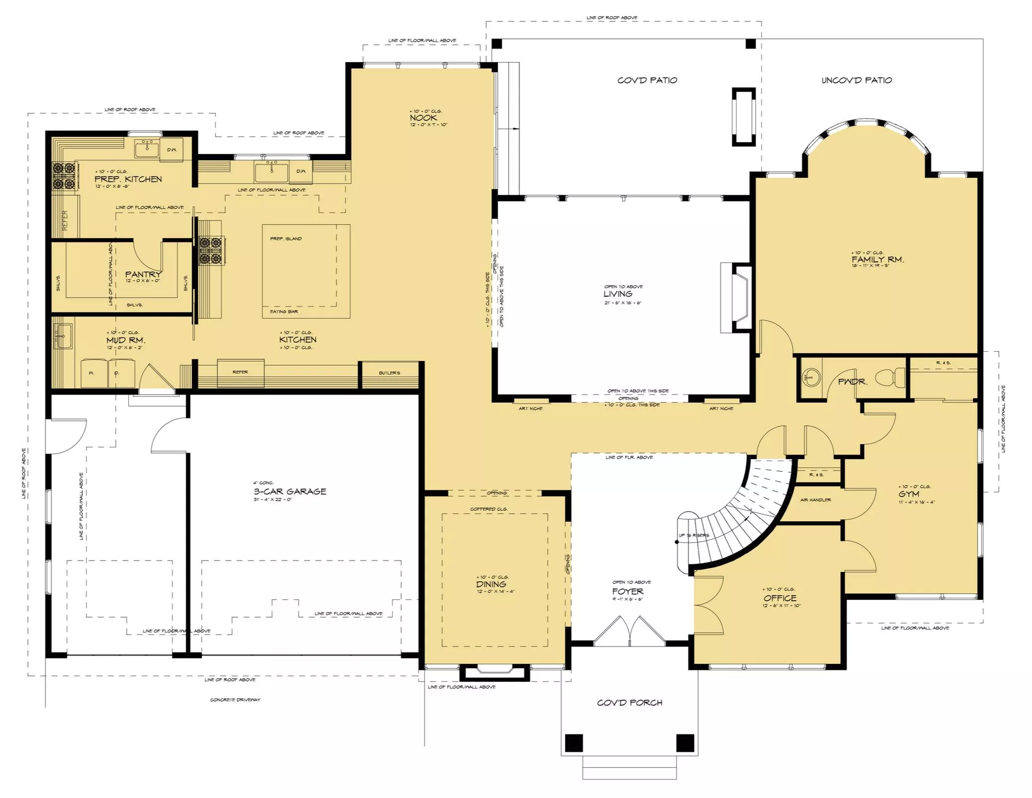 Lovers of grand contemporary architecture look no further! House Plan 4213 is a stunning example boasting a mix of modern and traditional features wrapped up in a bold exterior with chic, low-pitched roof lines and large window displays that bring surroundings inside. And with 5,260 square feet, five bedrooms, and three-and-a-half bathrooms among other great amenities, there's plenty for the whole family to enjoy! Enter through the front door and you'll find a voluminous foyer with a curved staircase flanked by an office and the formal dining. Further back, there's a gym and a large enclosed family room with arched windows on one side while the open-concept living areas spread back from the center to behind the garage. Between the two-story living area, sunny nook, and large island kitchen with a secondary prep kitchen and a huge walk-in pantry, you know this home is ready to host! Head upstairs to find all the bedrooms--the bright and luxurious master suite is isolated on one side of the bridged hallway while you'll find a pair of Jack-and-Jill bedrooms, two more that share a hall bath, and a bonus on the other. This setup maintains clear zones for living and sleeping quarters while also giving the owners privacy. House Plan 4213 has so much for the modern family to appreciate!