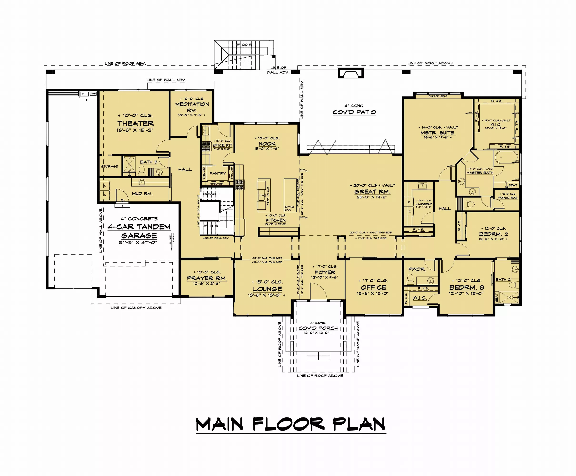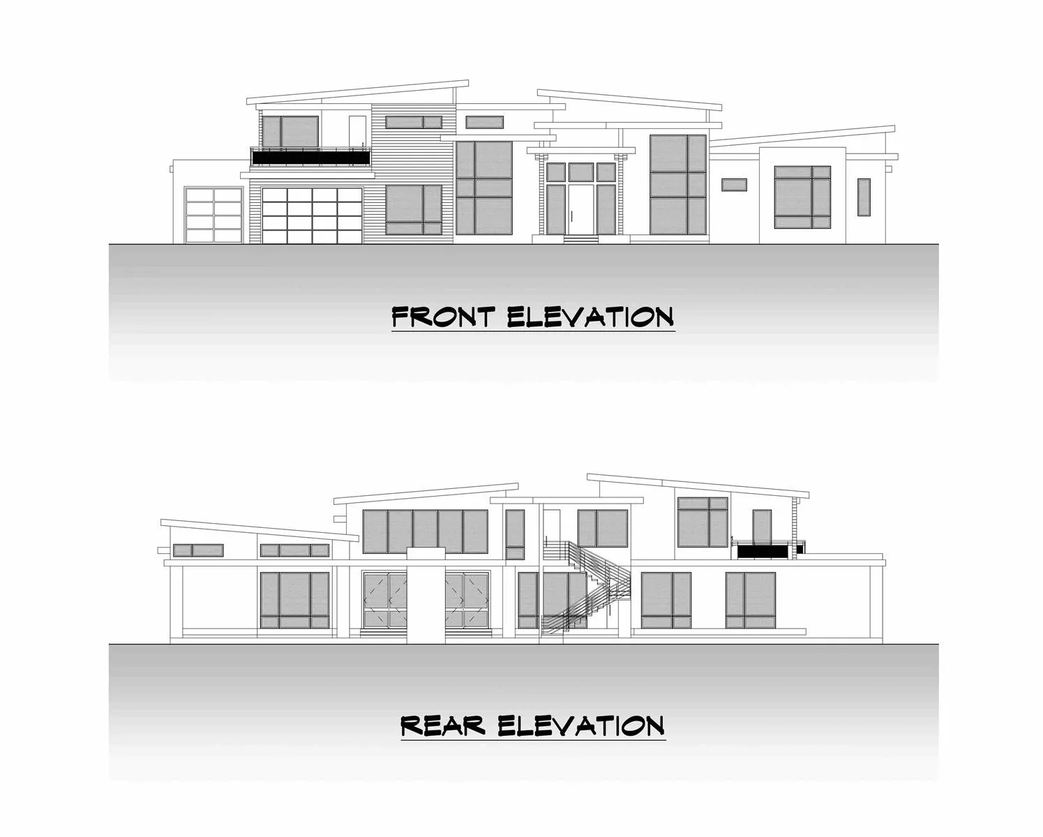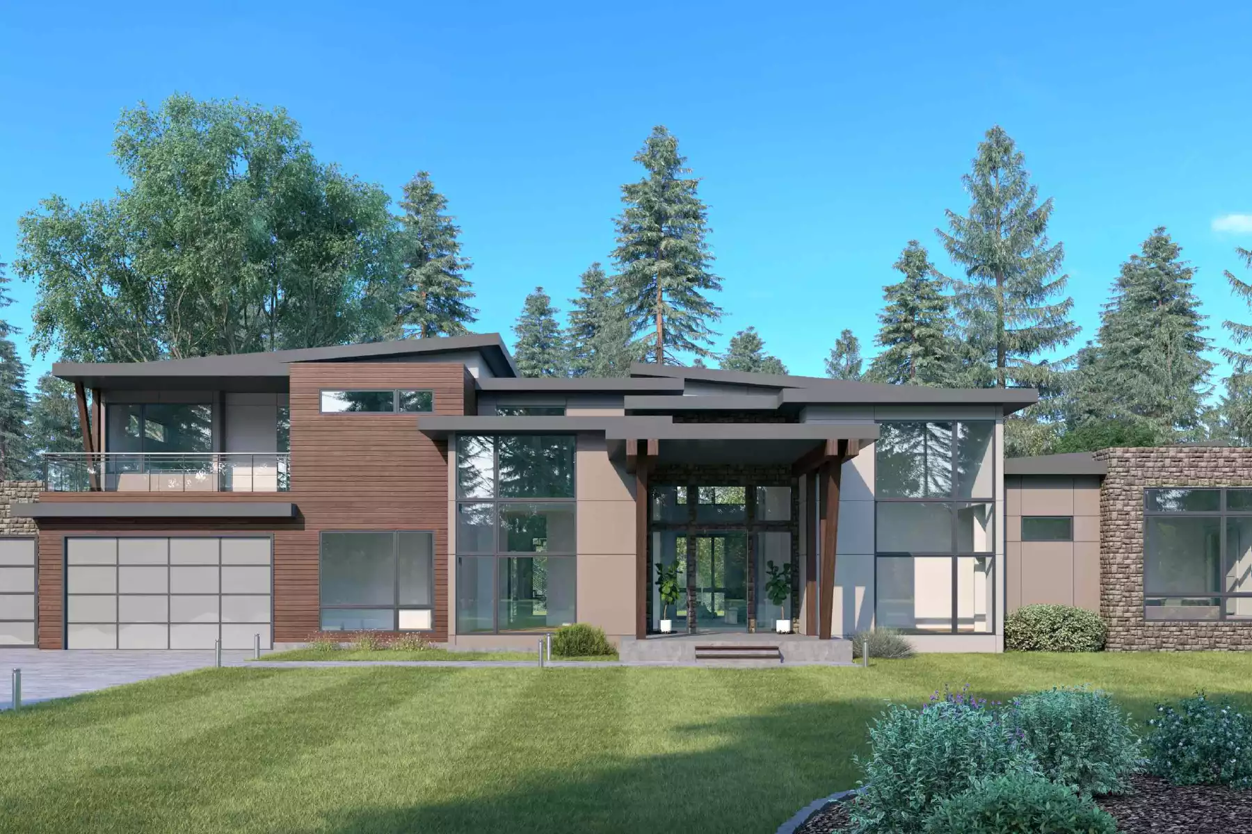 Where to begin with House Plan 1715! This exceptional contemporary design packs so much to appreciate in its 6,312 square feet beyond five bedrooms and five-and-a-half bathrooms. You're sure to be wowed by the variety of spaces it offers across two levels, the fact that it provides grouped and split bedrooms to appeal to families of all ages, and the great range of outdoor areas that add plenty of fresh air to the design. When you enter, the foyer is flanked by the office and a lounge area that makes the perfect formal living room. Cross the gallery hallway that spans the width of the house and you'll find the kitchen and great room in back. The kitchen boasts an L-shaped layout with two islands, a casual nook, and a separate spice kitchen with a walk-in pantry and direct patio access in back--ideal for hosts! The great room is open and spacious with a two-story ceiling, tons of windows, and direct connection to the cozy back covered patio with a fireplace through foldaway doors. Back to the gallery hallway, three bedrooms are located on the main level, and they're all grouped to the right side of the house. There's a pair of Jack-and-Jill bedrooms as well as the luxurious vaulted primary suite with a five-piece, Euro-style bath. Don't miss the panic room hidden in the toilet closet! There's also a laundry room and a powder room in this hallway for convenience. Follow the gallery hall to the other side of the house and you'll find a prayer room, the mudroom with another washer and dryer, a full bath, a meditation room, and a theater. The four-car garage connects to the interior through the mudroom. Take the U-shaped staircase nearby to access the second level, where there are two lovely and private bedroom suites with three-piece baths, walk-in closets, window seats, and their own weatherdecks. But that's not all, by far! There's also a bonus with a bar, another powder room, another laundry room, another panic room, a sunroom that opens to stairs down to the patio, and even a dedicated doggy room. Talk about a house that really covers the bases!