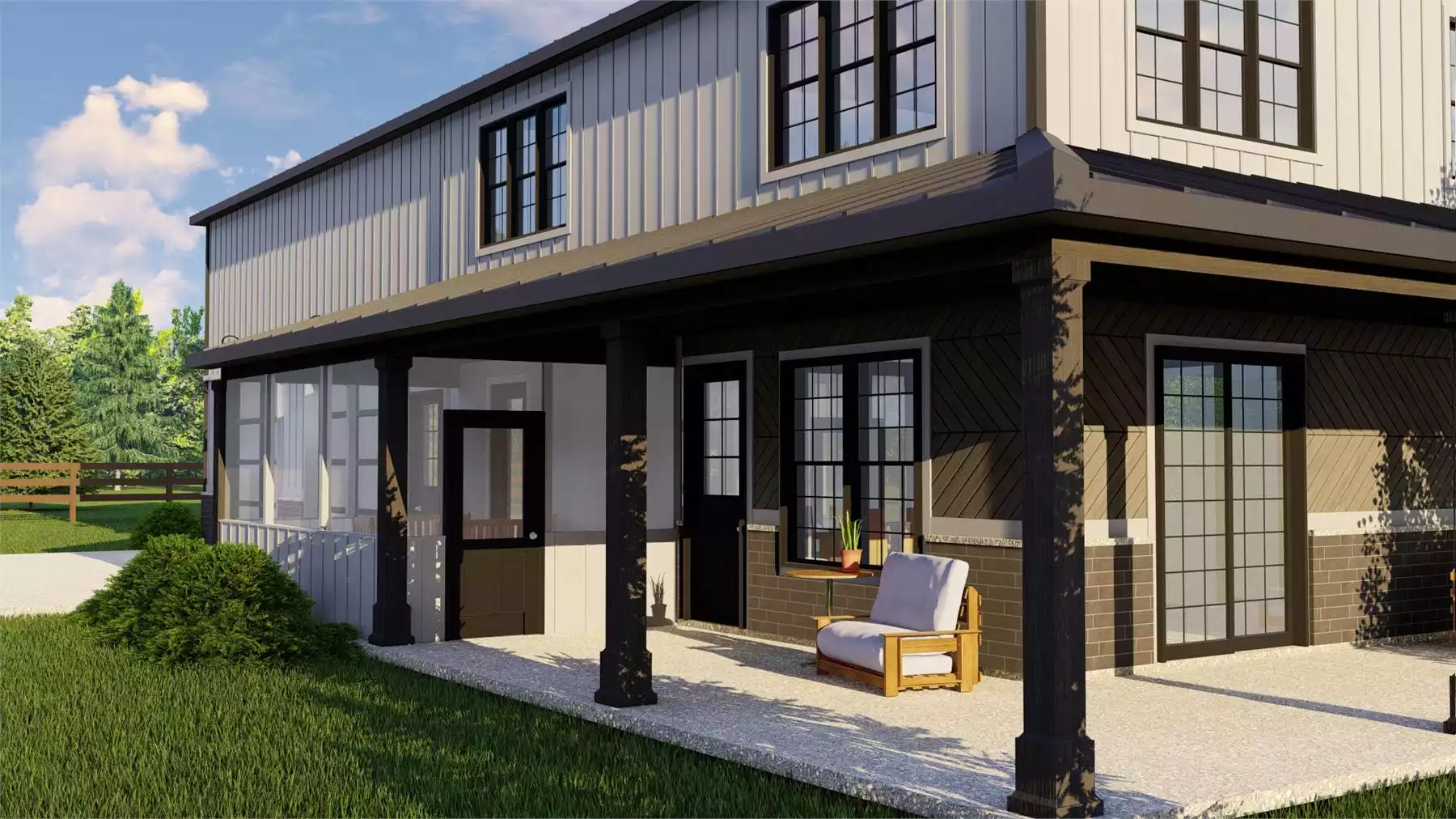 Dover Mill is a thoughtfully designed barndominium house plan offering 2,311 square feet of heated living space with an open, modern layout. The main level features a vaulted great room that flows seamlessly into the kitchen and dining area, creating a bright and inviting space for everyday living and entertaining. A kitchen island, walk-in pantry, and breakfast nook add both function and casual gathering space. The primary suite is located on the main floor and includes a walk-in closet and a private bath with dual vanities. Two additional bedrooms are located upstairs alongside a loft and home office, making this layout ideal for families or those who work from home. Outdoor living is emphasized with a covered front porch, covered rear porch, and screened porch for year-round enjoyment. An oversized, side-entry garage completes this versatile barndominium design, blending rustic appeal with contemporary comfort.