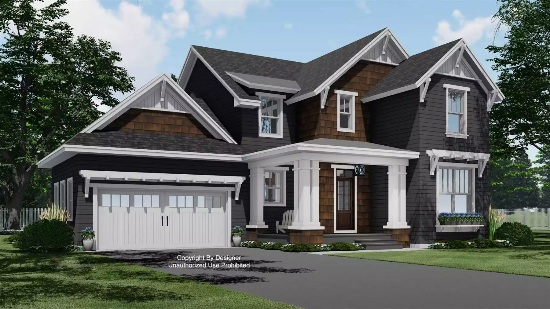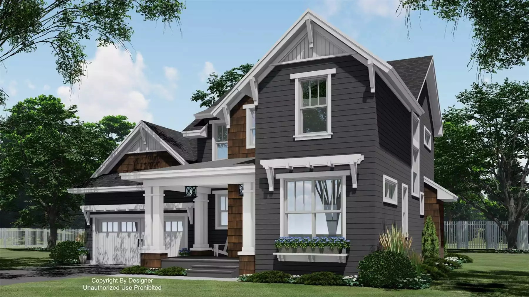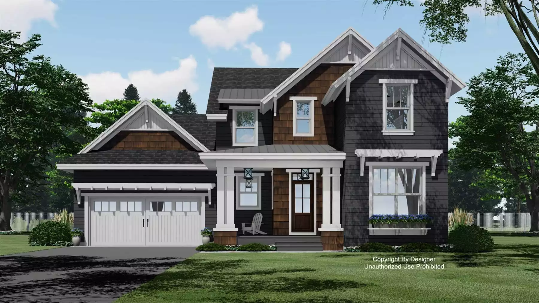 Fairstone Corner is a charming 1,973 square foot Craftsman-style home with wood and shake siding, offering 3 bedrooms, 2½ bathrooms, and a 2-car garage in a warm, inviting layout. From the wood-pillared front porch, step into the elegant foyer leading to an open-concept living space that includes the great room, kitchen, and dining area. The great room features a cozy fireplace framed by stately built-ins and brightened by multiple windows. The kitchen centers around a generous island with seating for three, a sink, and a dishwasher, plus abundant cabinetry and a spacious walk-in pantry. The dining area, located just steps away, offers backyard access for easy indoor-outdoor living. The private master suite includes a large bedroom, bathroom with dual vanities, a step-in shower, and a pocket-door toilet area, as well as a walk-in closet. Two additional bedrooms, a dedicated laundry room, a home office with windows on two walls, and a mudroom with built-in lockers complete the thoughtful design.