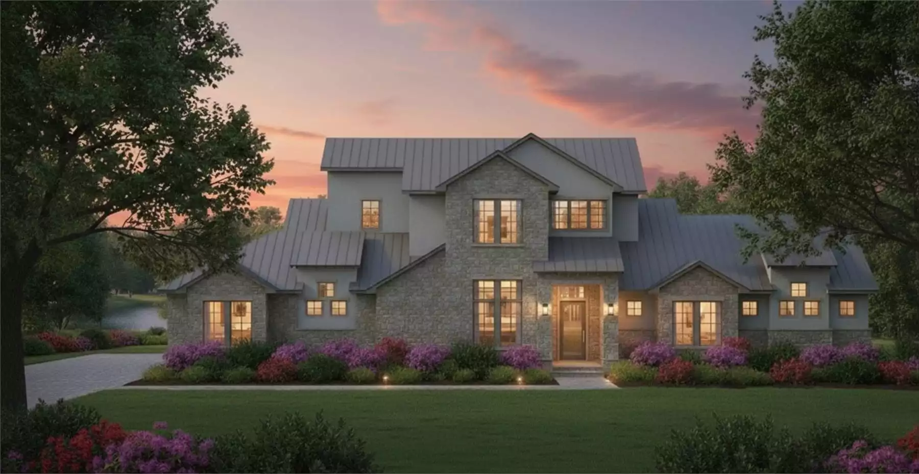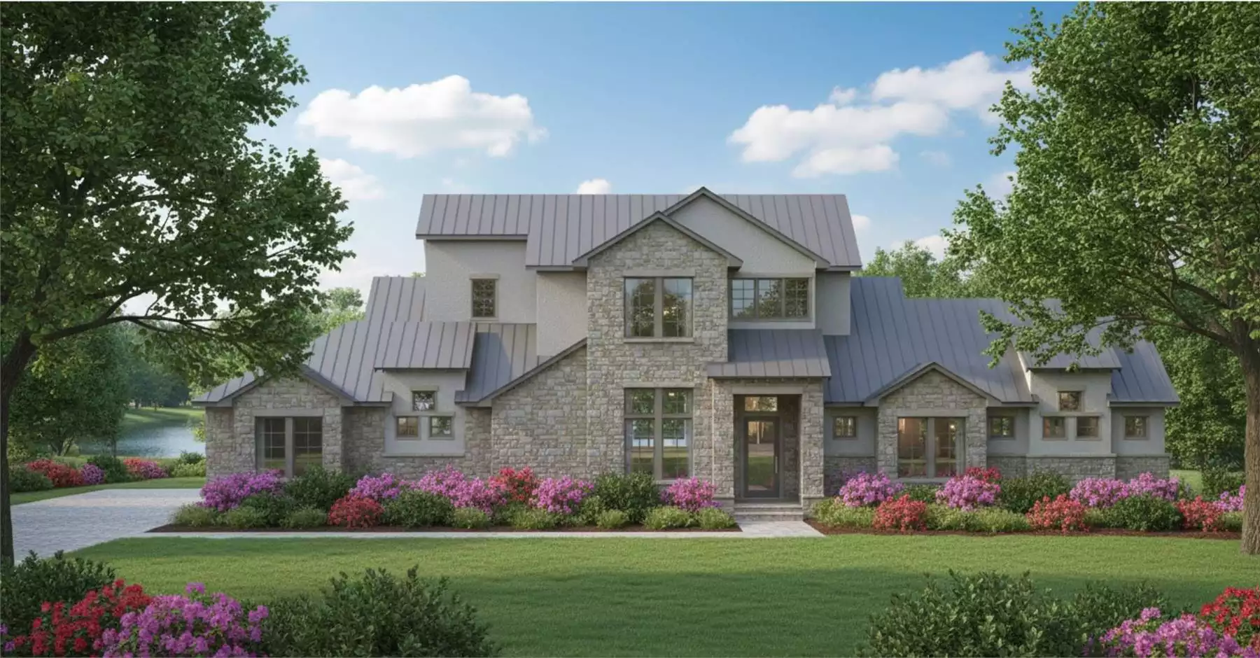 This 4789 square feet, 2 story home plan offers 5 bedrooms and 5.5 baths in a spacious open floor plan designed for luxurious family living. A welcoming foyer leads into the great room, where a soaring 12 foot ceiling and fireplace create an impressive central gathering space. The country kitchen features an L-shaped layout with a large island, peninsula with eating bar, breakfast nook, and walk-in pantry, flowing seamlessly into the main living areas for effortless entertaining. The primary bedroom is conveniently located on the main floor and includes a walk-in closet, double vanity sink, and separate tub and shower for a relaxing retreat. A home office and dedicated exercise room add flexibility for work and wellness. Upstairs, additional bedrooms and a loft or balcony provide expanded living space for family or guests. Covered front and rear porches, along with an outdoor kitchen and outdoor living area, extend entertaining outdoors. The attached front-facing garage with side-entry option completes this well-appointed design.