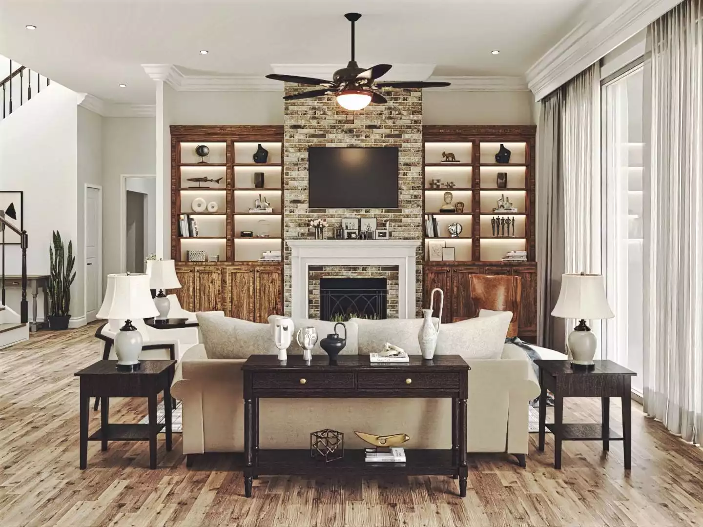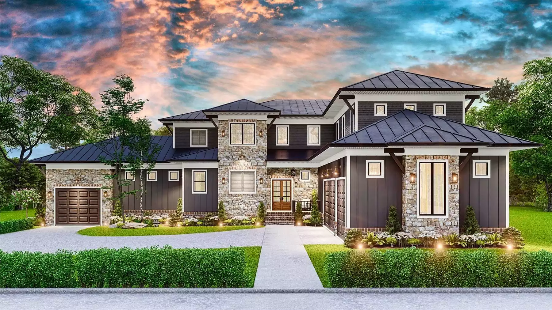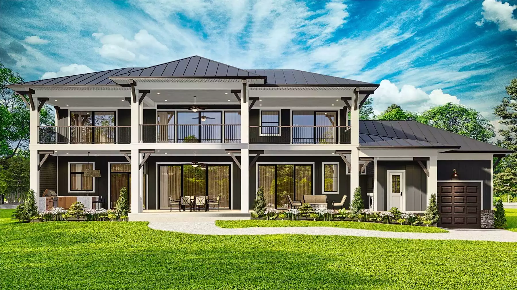 Evercrest is a spacious layout includes a 5-car garage and an inviting two-story foyer that leads into the heart of the home. The main level features a cozy family room with built-ins and fireplace, an open kitchen with bar seating, a wine room, office, mud room, laundry, and a covered rear porch—ideal for lakeside living. The luxurious main-floor master suite includes a private foyer, dual walk-in closets, and a spa-inspired bath. Upstairs, you’ll find a game room, safe room, study, a second covered porch, and four additional bedrooms—each with its own bath and walk-in closet. This plan blends functionality and comfort in a warm and welcoming Craftsman design.