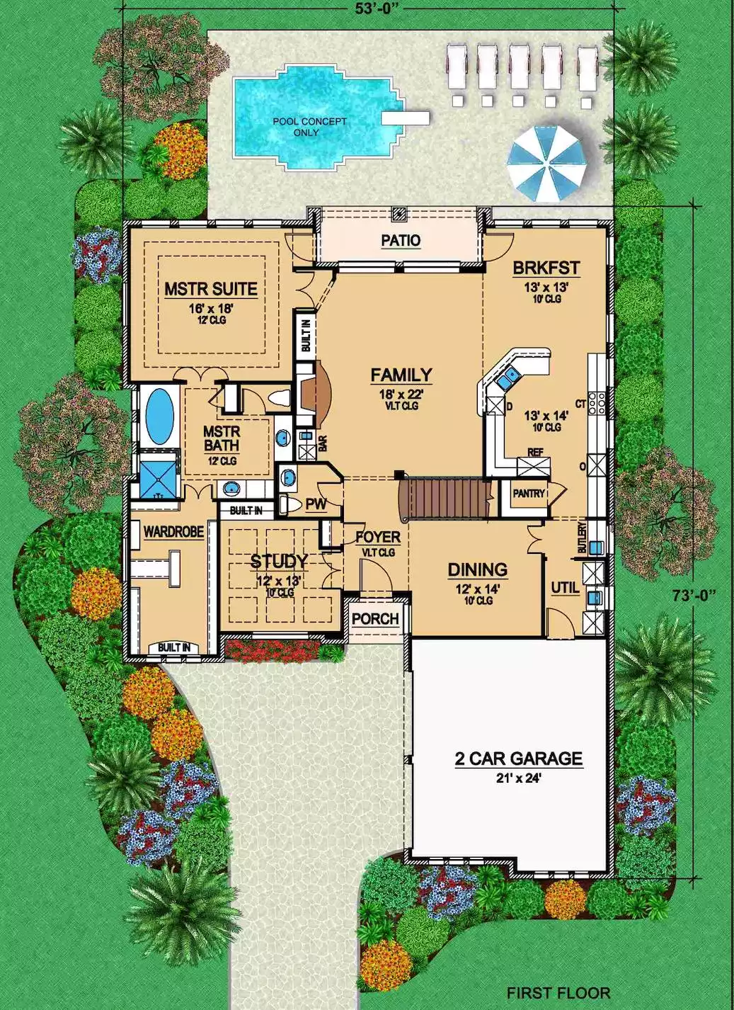 This home offers a two-story vaulted foyer flanked by a study with built-ins and a coffered ceiling and an elegant dining room. The dining room has direct access to the butlery, pantry and kitchen for ease in serving. An eating bar serves the family room and breakfast area. The master suite includes a tray ceiling, and a spacious bath boasting his and hers vanities, separate shower, tub and large walk-in closet with built-ins. There are banks of windows in each room to the rear of the home. Access the patio from the master suite or breakfast area. Two bedrooms with walk-in closets and full baths reside upstairs and share space with a loft.