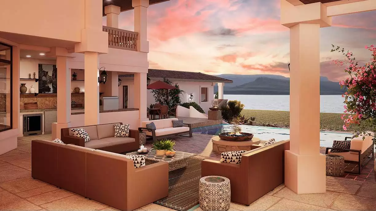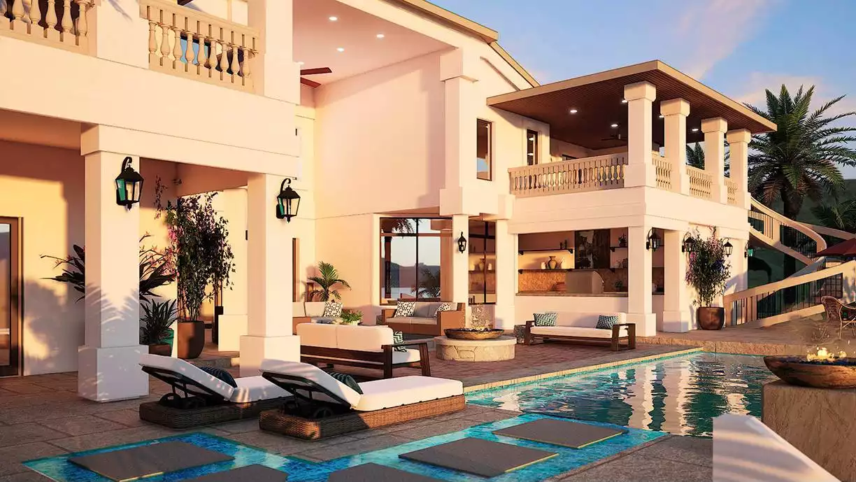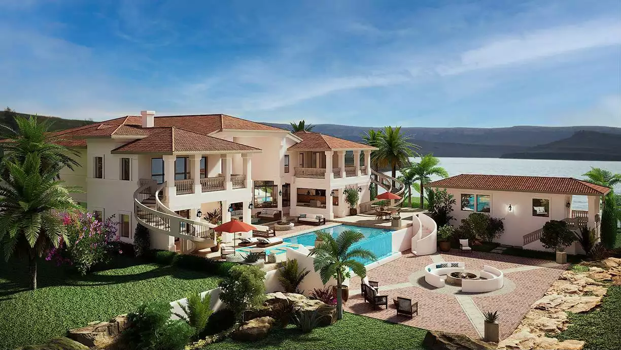 Emerald Springs is an exquisite 8,513-square-foot Mediterranean-style estate that redefines luxury living. A grand front porch opens into a breathtaking vaulted foyer, setting the stage for a thoughtfully designed layout. The private owner's wing includes a serene patio, wet bar, spa-style ensuite with a sauna, and a dream-worthy walk-in closet complete with a center island and dedicated shoe and hat storage. A front study provides privacy for work or reading. At the heart of the home, a soaring great room with ornate beams opens to a chef’s U-shaped kitchen with island seating, an oversized pantry, and an elegant dining space—all with direct access to a covered outdoor lounge. Upstairs are four spacious bedrooms, three full baths, a large game room, and a covered balcony. Additional features include a four-car garage, a fenced dog yard, and a private guest cabana with its own lounge, bedroom suite, full bath, and balcony—perfect for hosting in comfort and style.