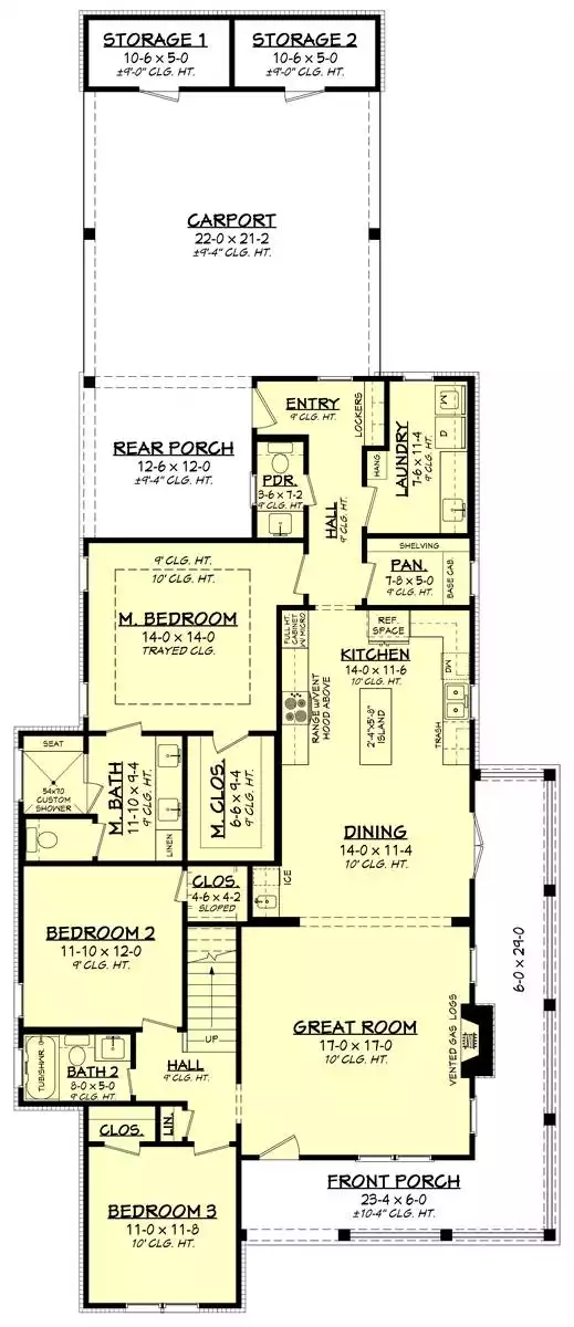 This inviting home features 2,200 square feet of heated living space with 4 bedrooms and 3.5 baths arranged across two comfortable levels. The open floor plan centers around a spacious great room with a fireplace, creating a natural gathering place for family living. A U-shaped kitchen includes a central island and walk-in pantry, offering generous workspace and storage for everyday meals and entertaining. The primary bedroom is located on the main floor and includes a walk-in closet and a well-appointed bath with double vanities. A first-floor laundry room and mud room add practical convenience near the rear-entry garage and carport. Wraparound porch spaces extend the living area outdoors while enhancing the home’s welcoming presence. This thoughtfully designed plan blends everyday function with warm, livable charm.