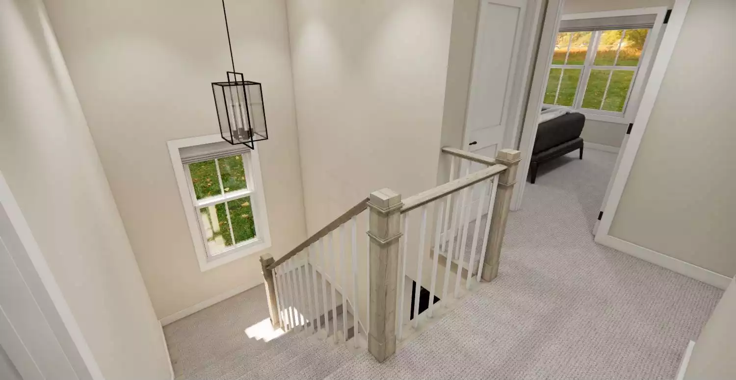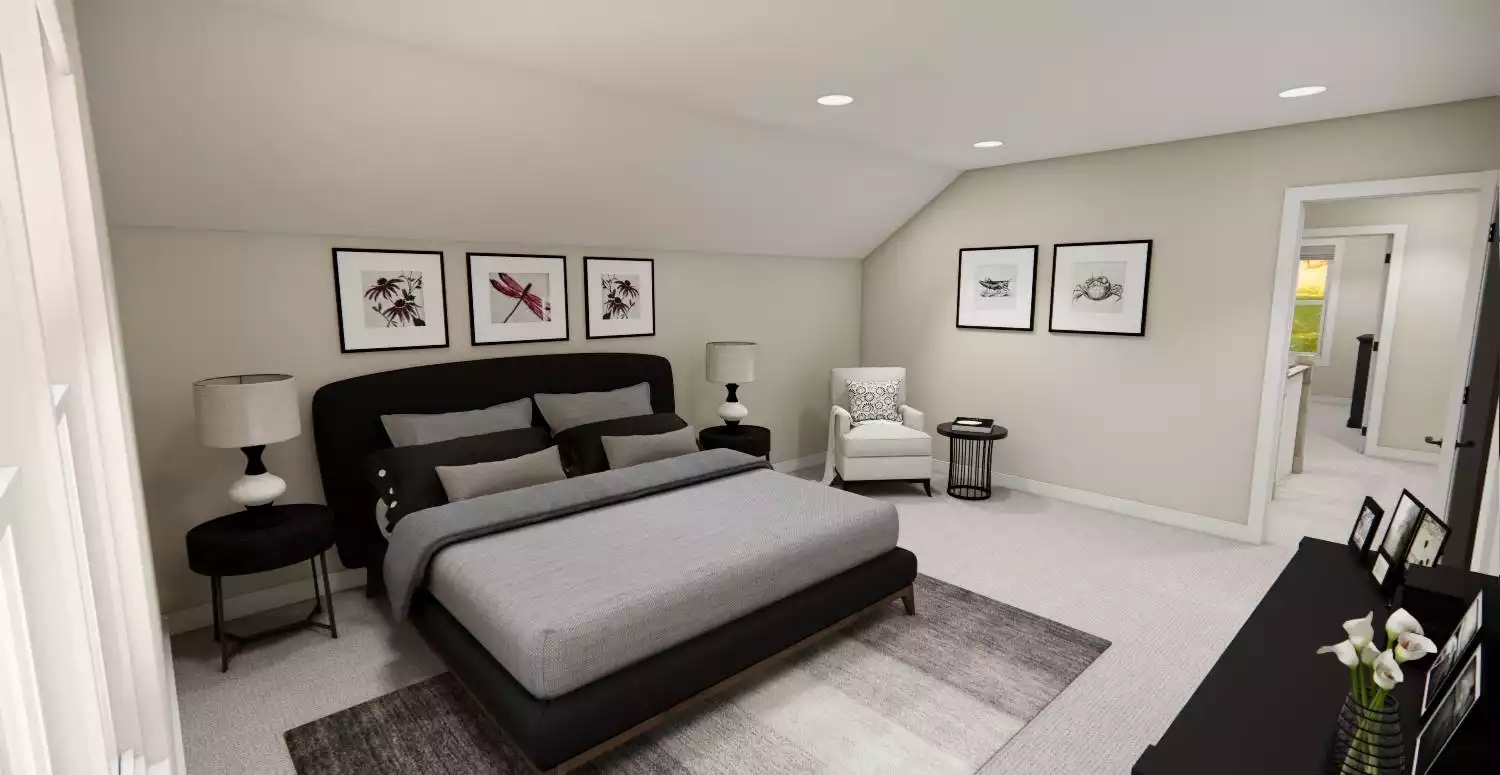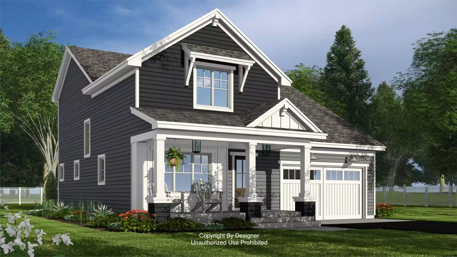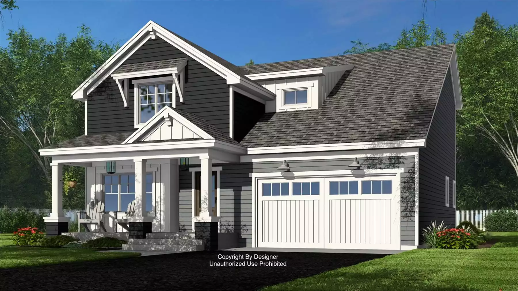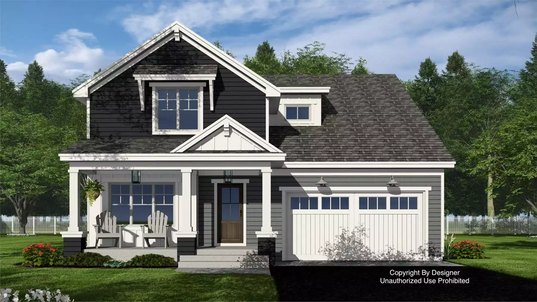 The Greenwood is a two-story family farmhouse with striking gabled rooflines and a charming shingled exterior. Its open floor plan features vaulted ceilings in the great room and dining area, a U-shaped kitchen with an island, and a split bedroom design for privacy. A versatile bonus room adds extra space, making this home perfect for modern family living.