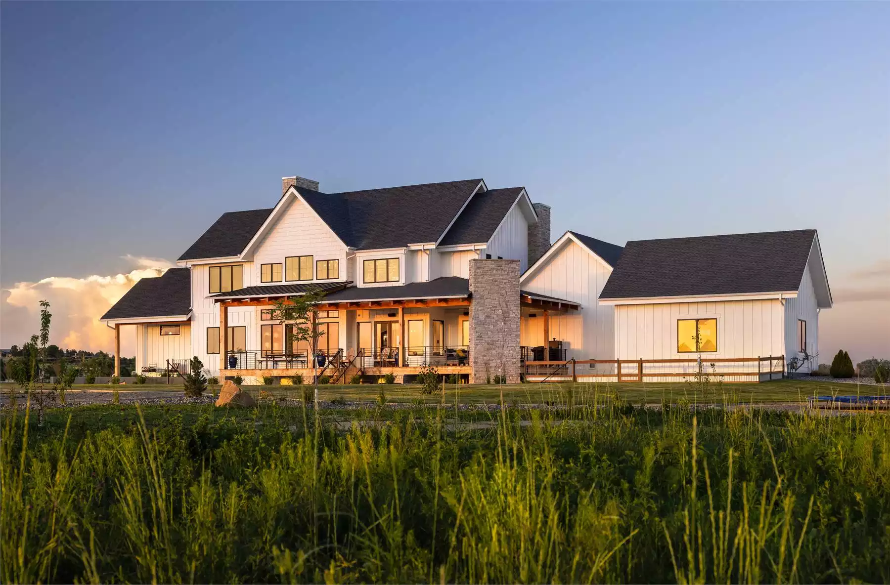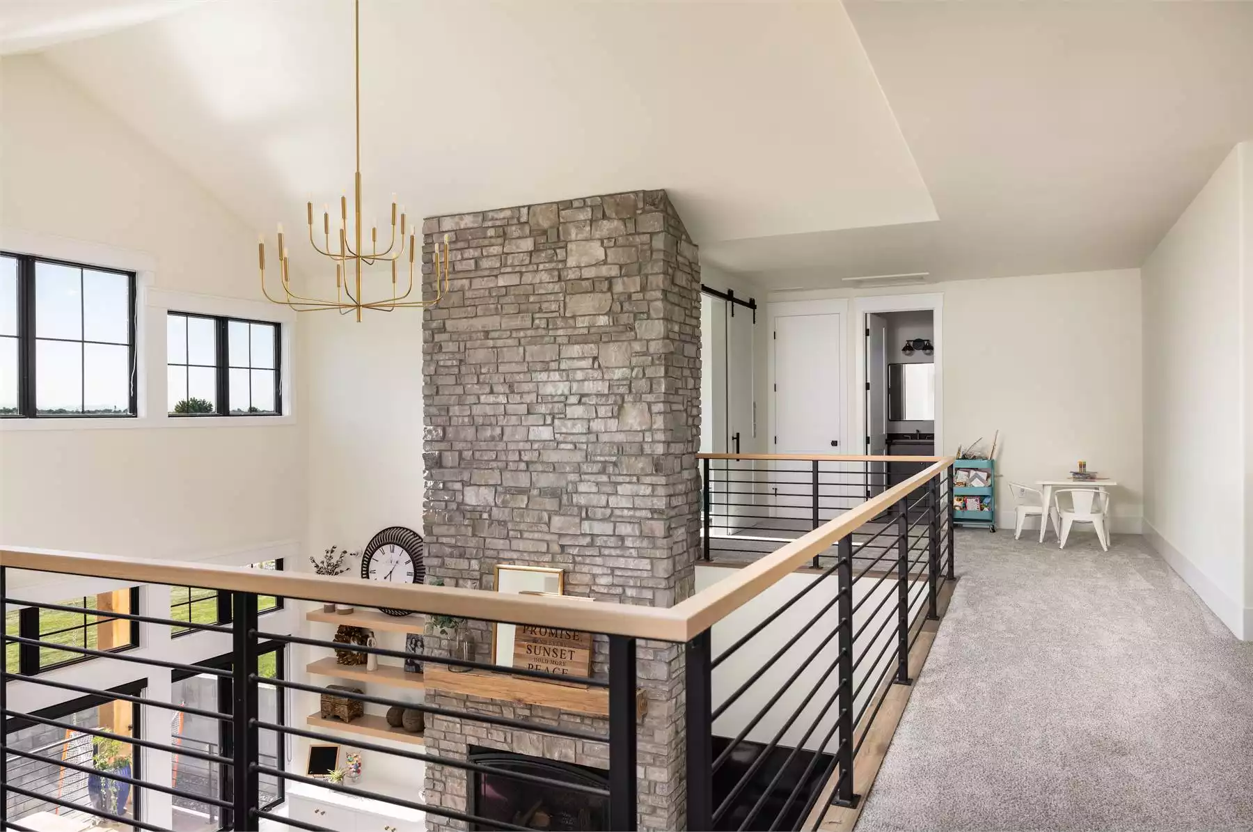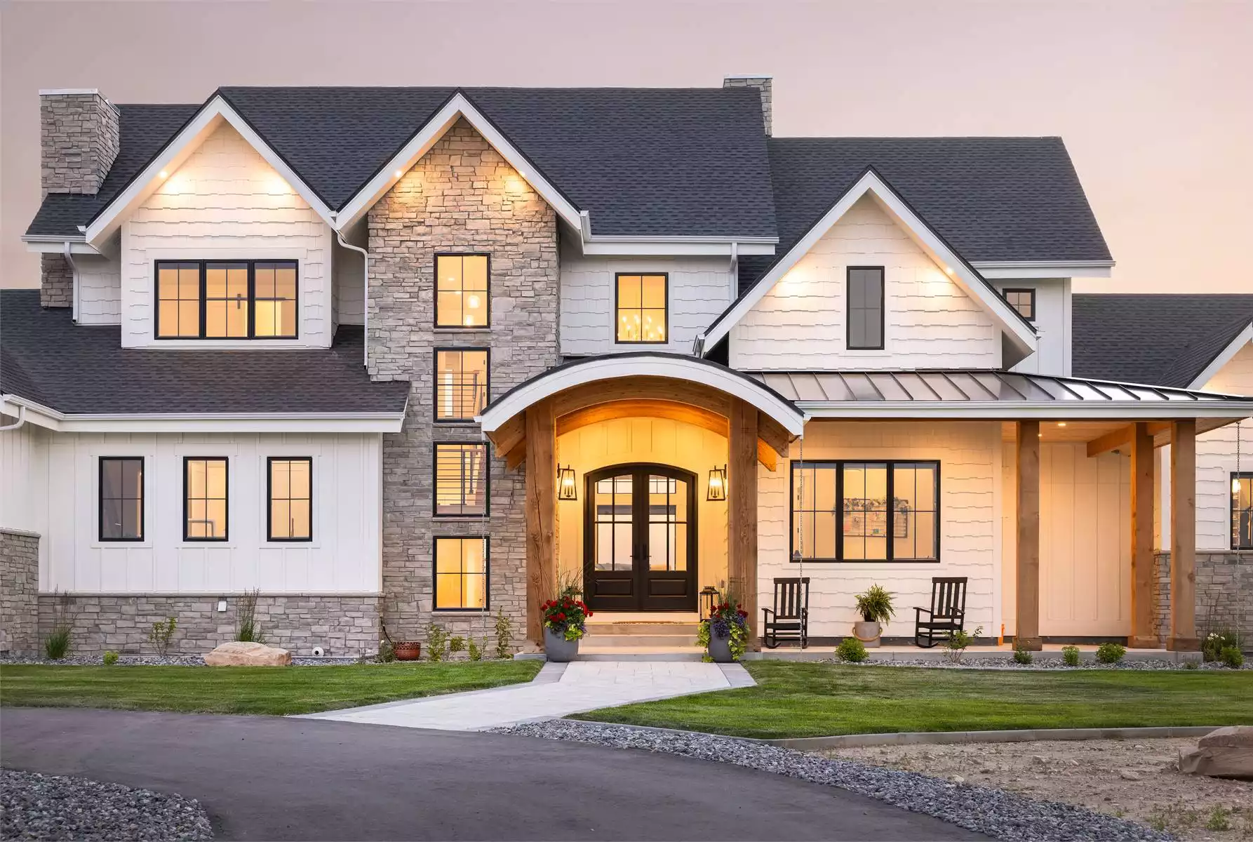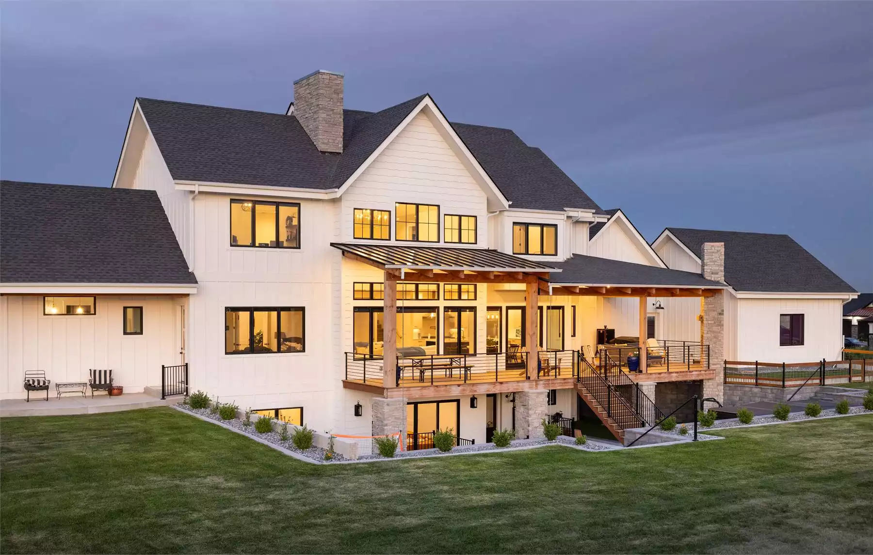 Elderbrook is a stunning 3,638 square foot modern farmhouse designed for families who crave space, comfort, and style. With 4 bedrooms and 4 bathrooms across three levels, this two-story home offers thoughtful living zones and generous room to grow. A large covered front porch welcomes you into a vaulted great room that opens to an L-shaped kitchen with a spacious island and adjoining dining area—perfect for hosting or enjoying family meals with a view. Step outside to the expansive covered deck with a cozy fireplace, ideal for relaxing evenings in any season.