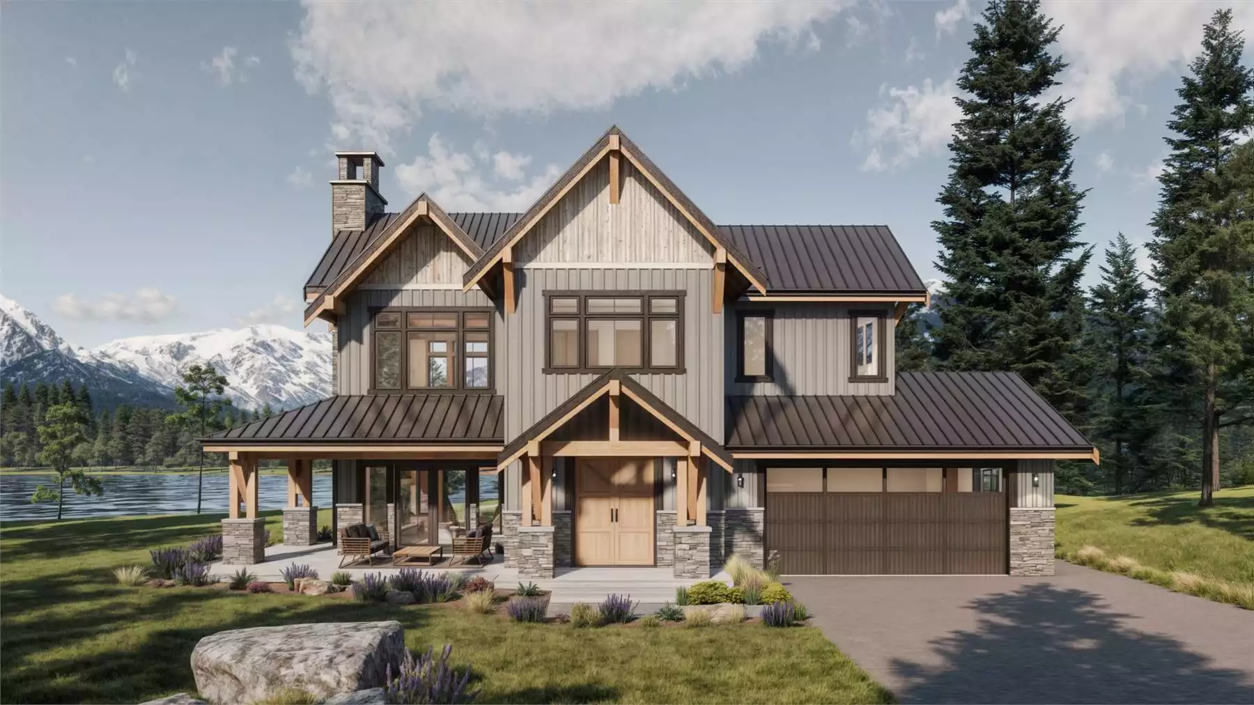 The Halfmoon Bay is a 2,125 square foot Craftsman-style lake house that blends charm and comfort across two thoughtfully designed stories. A large wraparound front porch sets a welcoming tone, leading into a spacious foyer and an expansive kitchen with a generous island and bar seating—perfect for casual gatherings. The heart of the home is the dramatic great room, with soaring 20-foot ceilings, a cozy fireplace, and access to the covered rear patio. A window-lined dining area invites natural light and scenic views. A flexible main-floor space offers the option for a home office or guest room, complete with a full bath. Upstairs, you’ll find three bedrooms, including a stunning primary suite with a warm, inviting ensuite and walk-in closet. The second floor also houses a convenient laundry room, making everyday living a breeze. A two-car garage rounds out this beautiful family-friendly layout designed for lakeside living.