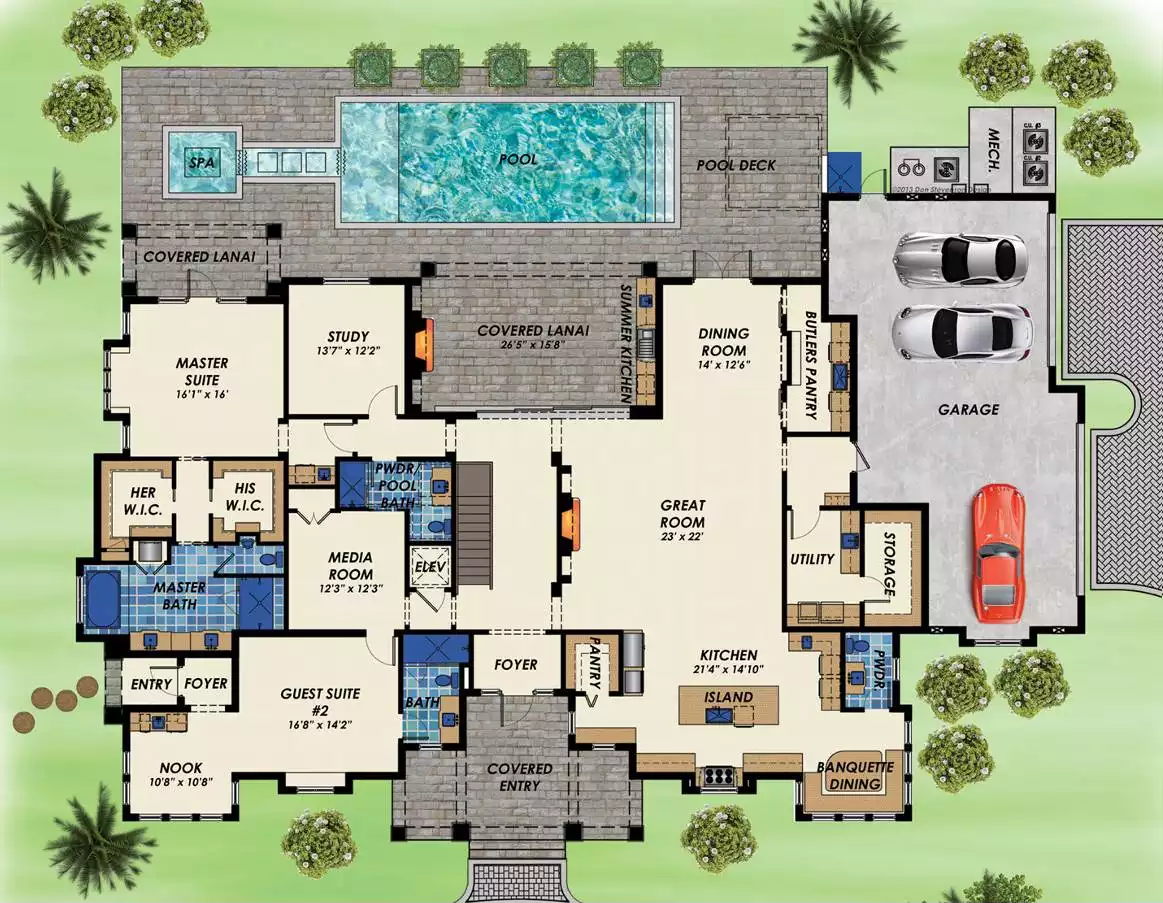 Looking for an amazing lake house with tons to appreciate? You may be lost for words when you see what House Plan 9431 has to offer! With 4,395 square feet across two stories, there's plenty of room for a family to spread out. The layout includes spacious living areas, with a huge island kitchen with banquette seating, a great room with a fireplace, and a dining room with a butler's pantry adjacent. The three-car garage connects to this side of the house while you'll find the study, luxurious five-piece primary suite, media room, and guest suite with its own exterior access on the opposite side. Upstairs, three more suites are spread around a central loft. This home has an elevator in addition to the stairs to increase accessibility. Perhaps you'd like to spend more time outside enjoying your whole property? It'll be a snap with the covered lanai complete with a summer kitchen. Just imagine the hosting potential in this beautiful design!