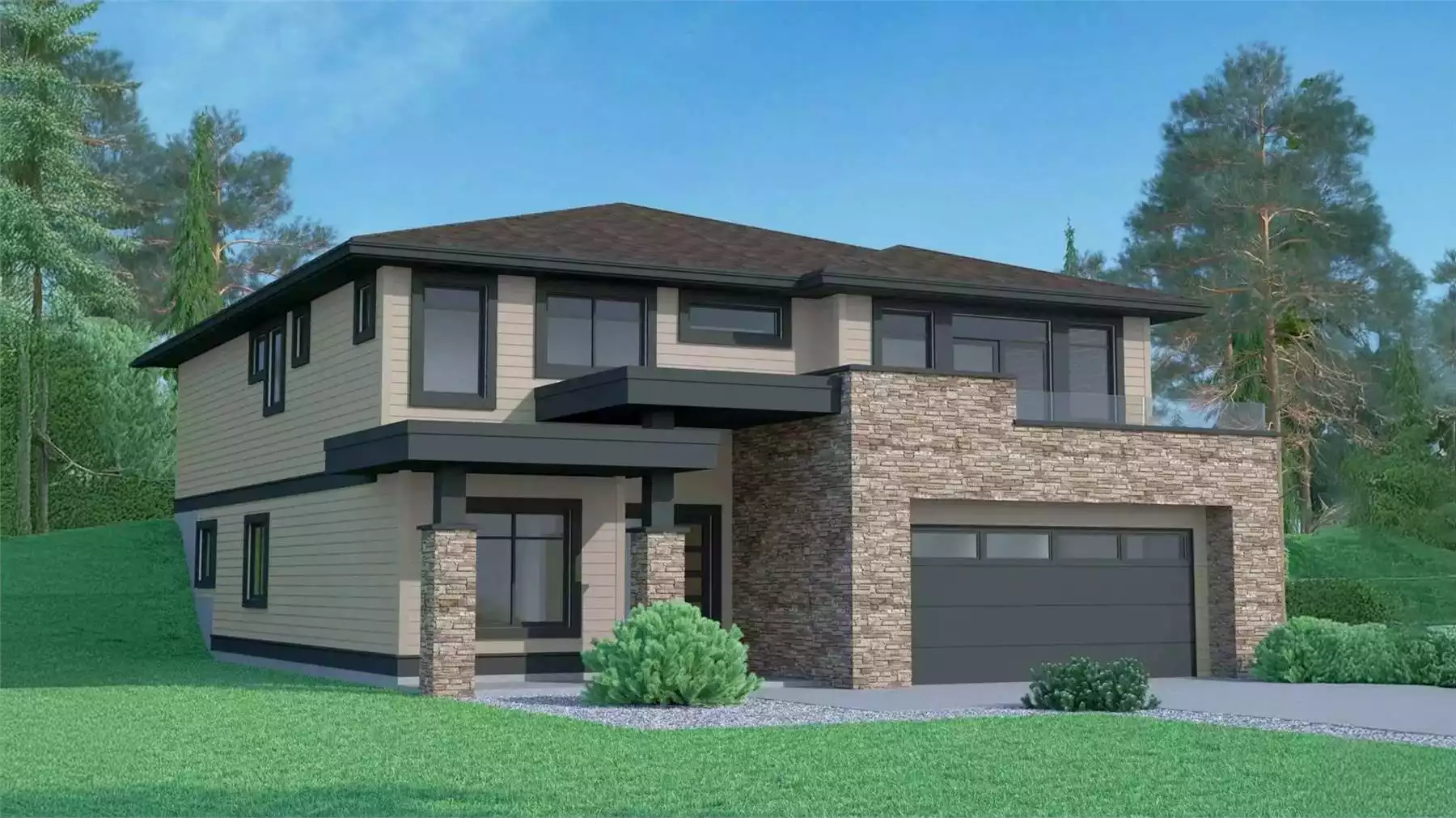 Monet Villa is an inviting two storey family home designed with flexibility in mind, offering three bedrooms on the upper floor and two roughed in bedrooms below, along with a future secondary suite that makes it ideal for multi generational living or a smart mortgage helper. A covered entry opens to a welcoming foyer with a private den to the left and an L shaped staircase leading up. The open plan great room stretches the depth of the home, placing the living room with a cozy gas fireplace and French doors to the front sundeck opposite the kitchen at the rear. Between them, the dining area is brightened by tall, narrow windows overlooking the side garden. The kitchen is anchored by an efficient L shaped counter layout and a rectangular prep island that keeps the cook connected to family and guests, with a corner pantry and direct access to a covered patio for easy outdoor dining. Upstairs, the primary suite overlooks the front garden and features a generous walk in closet and a well appointed ensuite with double basins, a soaker tub, and a separate shower. Two additional bedrooms share a three piece bath, with thoughtfully placed linen storage throughout. The lower level includes the roughed in secondary suite, two future bedrooms, a three piece bath, storage space, and convenient access from the double garage to both the foyer and mechanical room. Finished in a blend of stucco, wood siding, painted trim, and brick accents beneath a shingled roof, this home measures 40 feet wide by 58 feet, two inches deep and offers 1,665 square feet of upper floor living space with nine foot ceilings throughout.