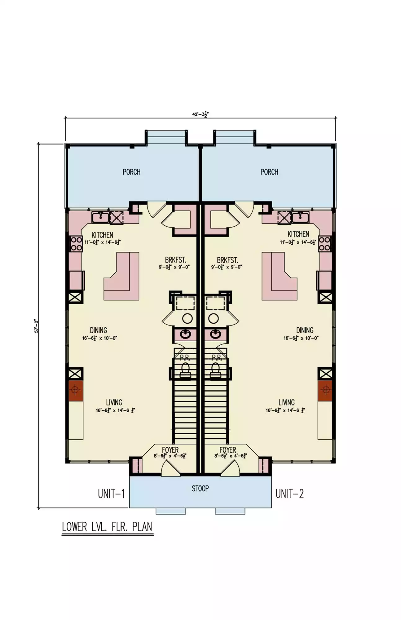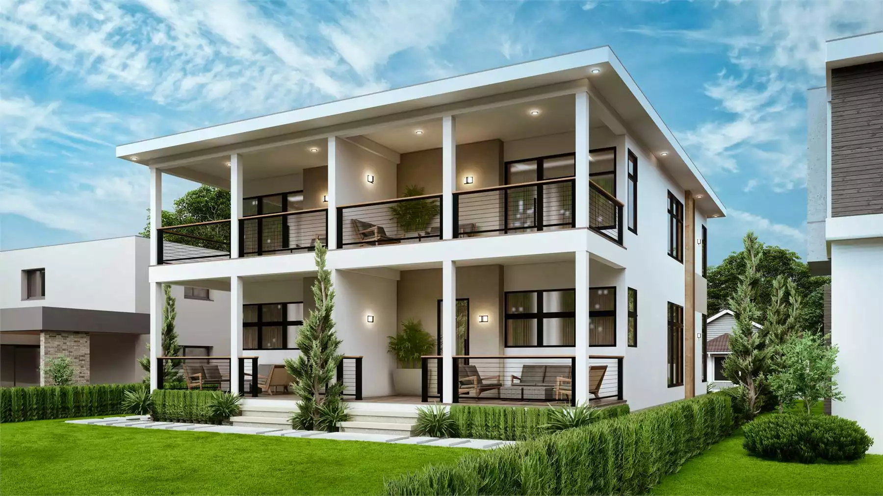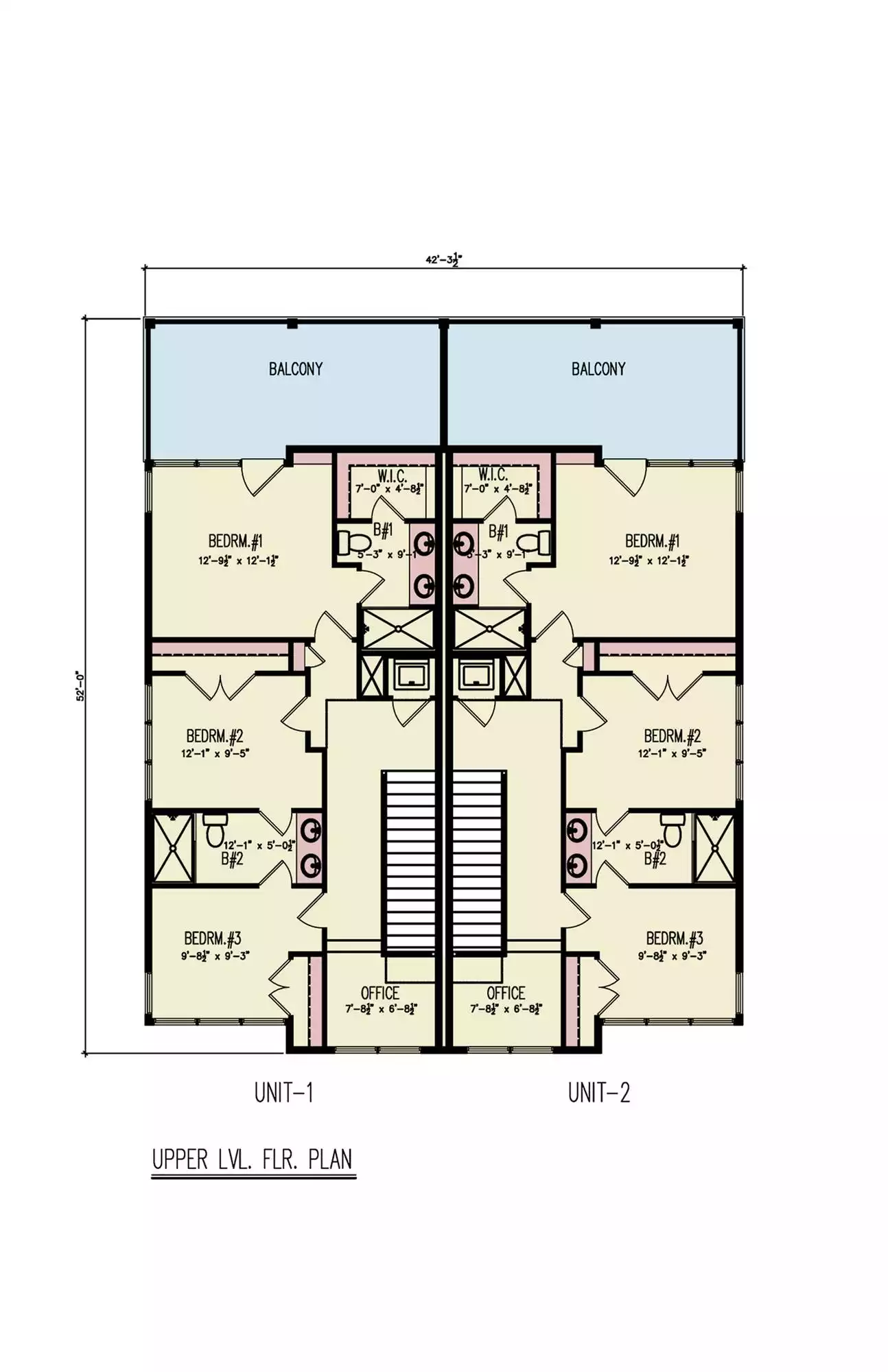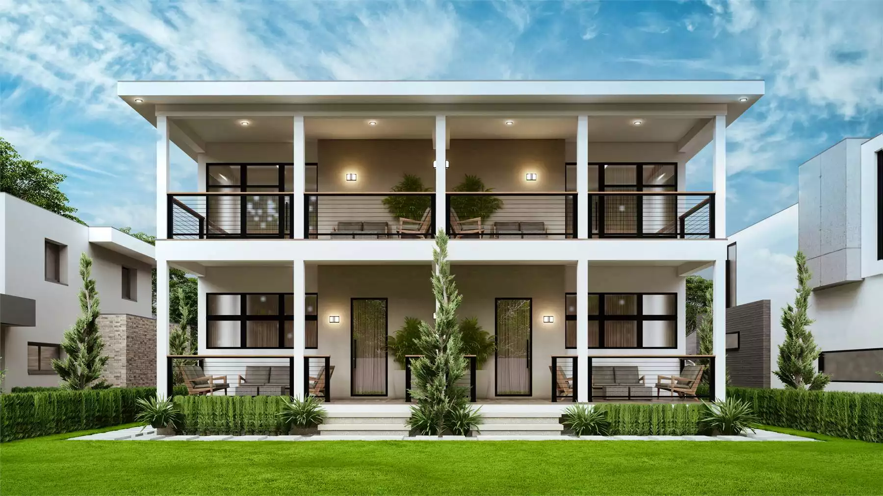 Olivia Heights is a contemporary two-story duplex townhouse designed for practical living with a modern edge. Each unit provides 1,701 square feet of heated living space, including an open-concept main floor with 10-foot ceilings and large windows that invite natural light throughout the day. The kitchen sits at the heart of the home with a spacious island and easy flow to both dining and living spaces, creating an inviting setting for daily routines or entertaining guests. A covered porch expands the living area outdoors and enhances everyday comfort. Upstairs, 9-foot ceilings continue the bright, airy atmosphere across three well-sized bedrooms. The primary suite includes a walk-in closet and private balcony, offering a quiet place to start or end the day. A shared Jack and Jill bathroom connects the secondary bedrooms, and the dedicated laundry room adds convenience. Each unit is carefully arranged to maximize privacy with no shared interior walls. Exterior finishes feature vertical siding, flat rooflines, and durable PVC/TPO roofing supported by strong 2x6 framing. With a total building width of 42 feet 4 inches and a depth of 57 feet, this design is ideal for narrow lots, investment properties, or owner-occupied setups.