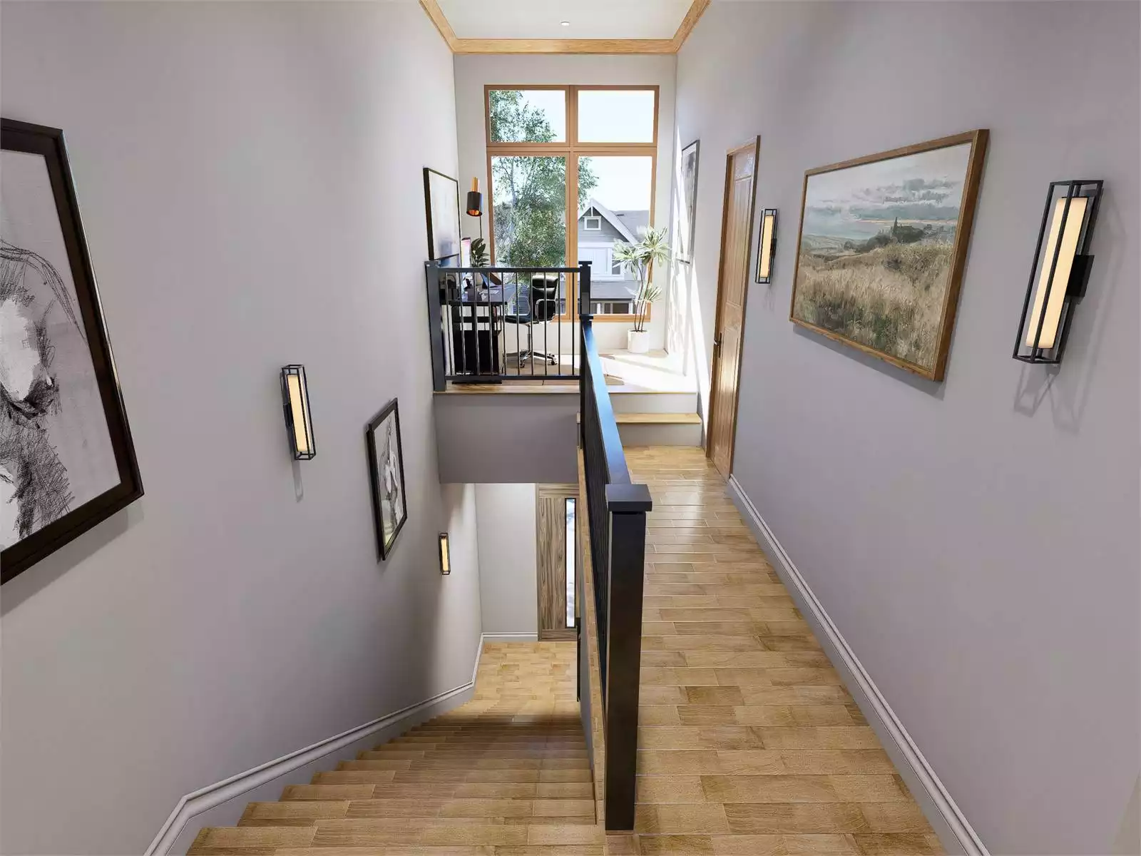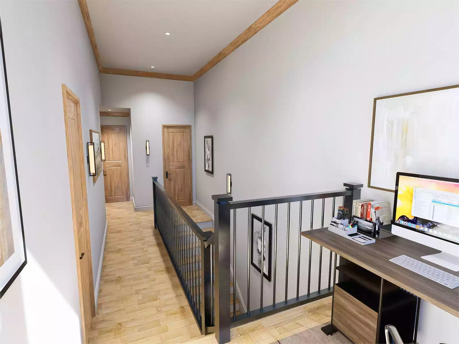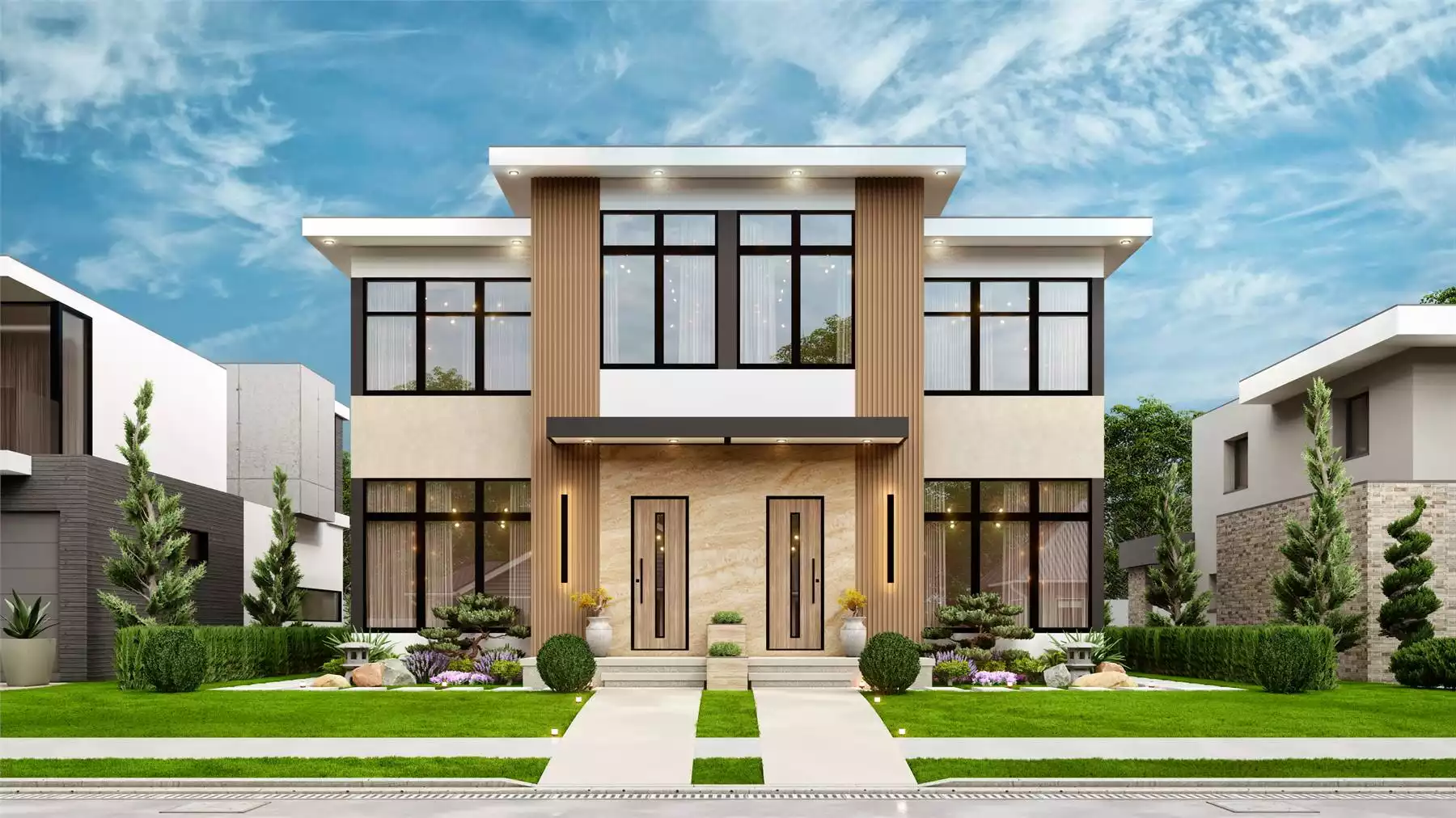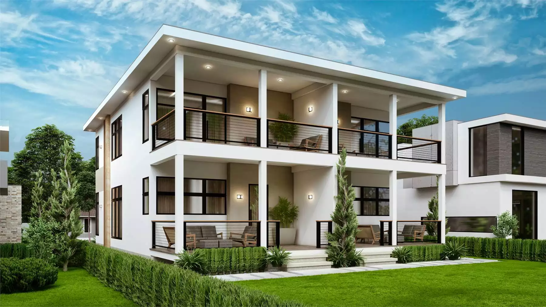 Olivia Heights is a contemporary two-story duplex townhouse designed for practical living with a modern edge. Each unit provides 1,701 square feet of heated living space, including an open-concept main floor with 10-foot ceilings and large windows that invite natural light throughout the day. The kitchen sits at the heart of the home with a spacious island and easy flow to both dining and living spaces, creating an inviting setting for daily routines or entertaining guests. A covered porch expands the living area outdoors and enhances everyday comfort. Upstairs, 9-foot ceilings continue the bright, airy atmosphere across three well-sized bedrooms. The primary suite includes a walk-in closet and private balcony, offering a quiet place to start or end the day. A shared Jack and Jill bathroom connects the secondary bedrooms, and the dedicated laundry room adds convenience. Each unit is carefully arranged to maximize privacy with no shared interior walls. Exterior finishes feature vertical siding, flat rooflines, and durable PVC/TPO roofing supported by strong 2x6 framing. With a total building width of 42 feet 4 inches and a depth of 57 feet, this design is ideal for narrow lots, investment properties, or owner-occupied setups.