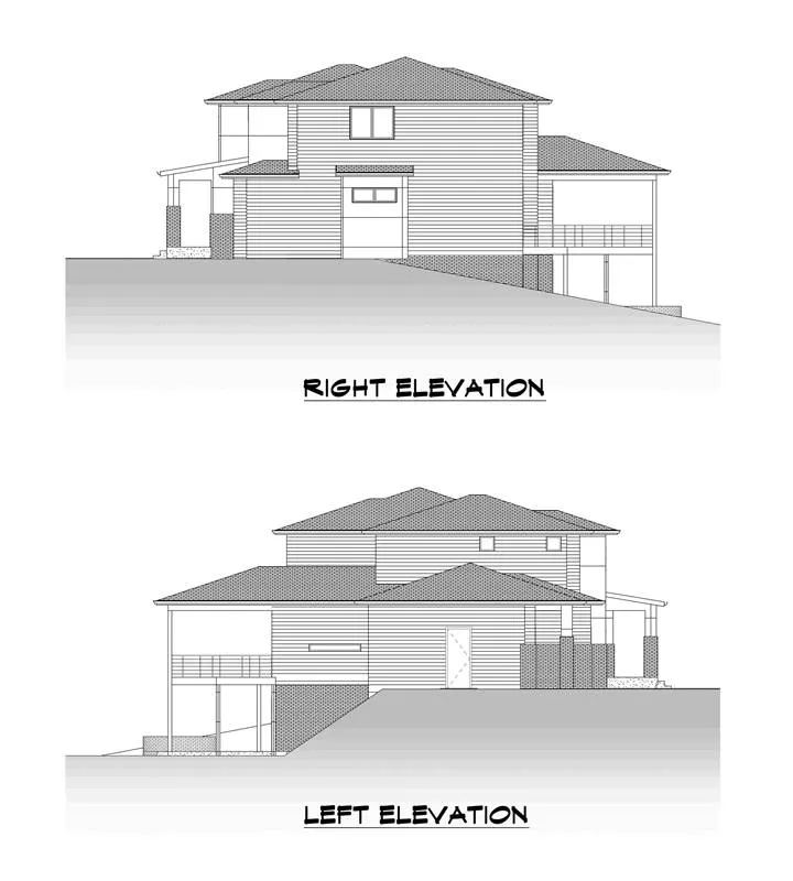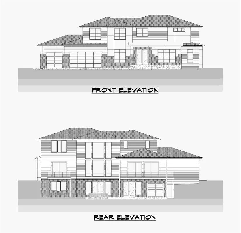 If you're looking for a luxury contemporary home for a lot that slopes back from the street, consider the possibilities afforded by House Plan 1452. It offers 5,382 square feet across two stories and the finished basement level. On the main level, you'll find open, voluminous living, a kitchen with an eating bar, a formal dining room, a den, and a primary suite with a four-piece bath and two walk-in closets. Head upstairs and there's another primary suite with a five-piece bath and two more bedrooms that share a divided hall bath. Head down to the basement to discover a guest suite with its own four-piece bath along with a rec room with its own fireplace and bar and a dedicated exercise space that connects to a full bathroom and sauna. House Plan 1452 is perfect for multigenerational households and anybody who likes to host with this unique layout! It also makes the most of a slope with the outdoor living spaces--the decks off the main level and the patios off the basement. And don't overlook the extra rear-facing garage bay that's perfect for storing outdoor toys and tools!