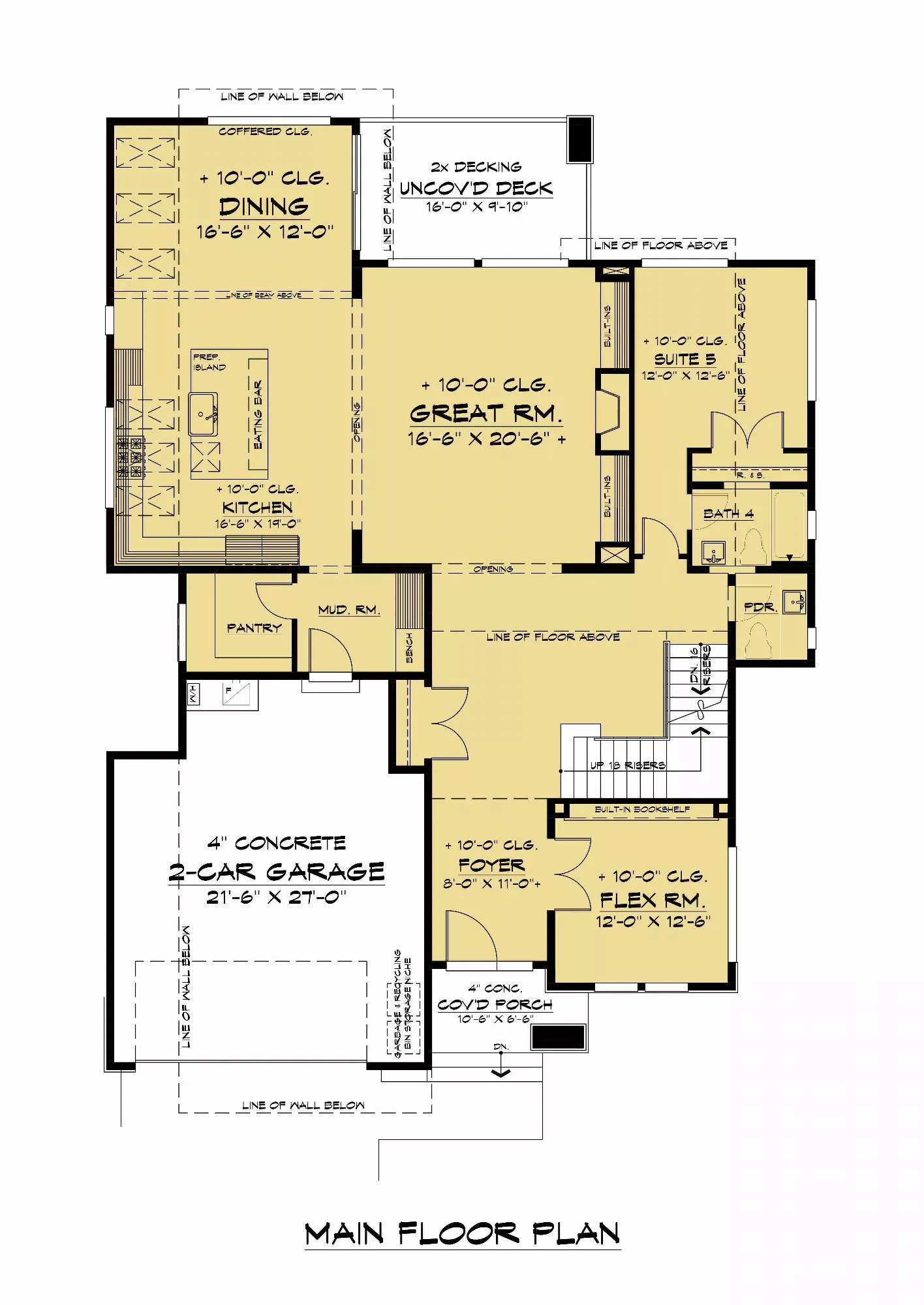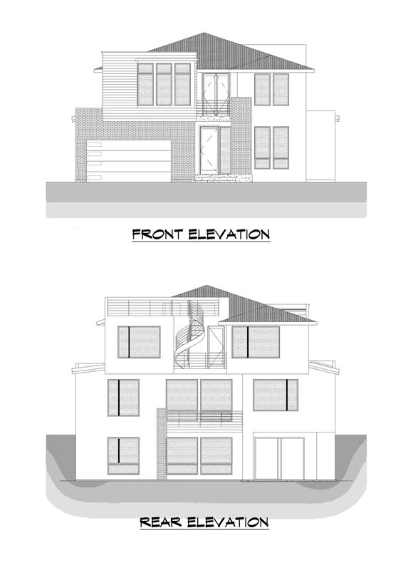 This modern home plan is a stunning two-story house with a walkout basement and a rooftop deck. Featuring 5,717 square feet of living space with 5 bedrooms, 5.5 bathrooms, and a 2-car garage this luxury design is perfect for a large family. The great room, dining area, and kitchen seamlessly flow into each other, creating a perfect space for entertaining guests. The L-shaped kitchen is equipped with a large center island with an eating bar and plenty of storage space. On the second level, you will find the master suite, 2 additional bedrooms, large loft, bonus room and laundry room. The basement level of the house provides additional living space with a spacious rec room and media room, perfect for hosting gatherings. The basement also includes a guest suite. A highlight of this home is the rooftop deck which provides panoramic views of the rear property.