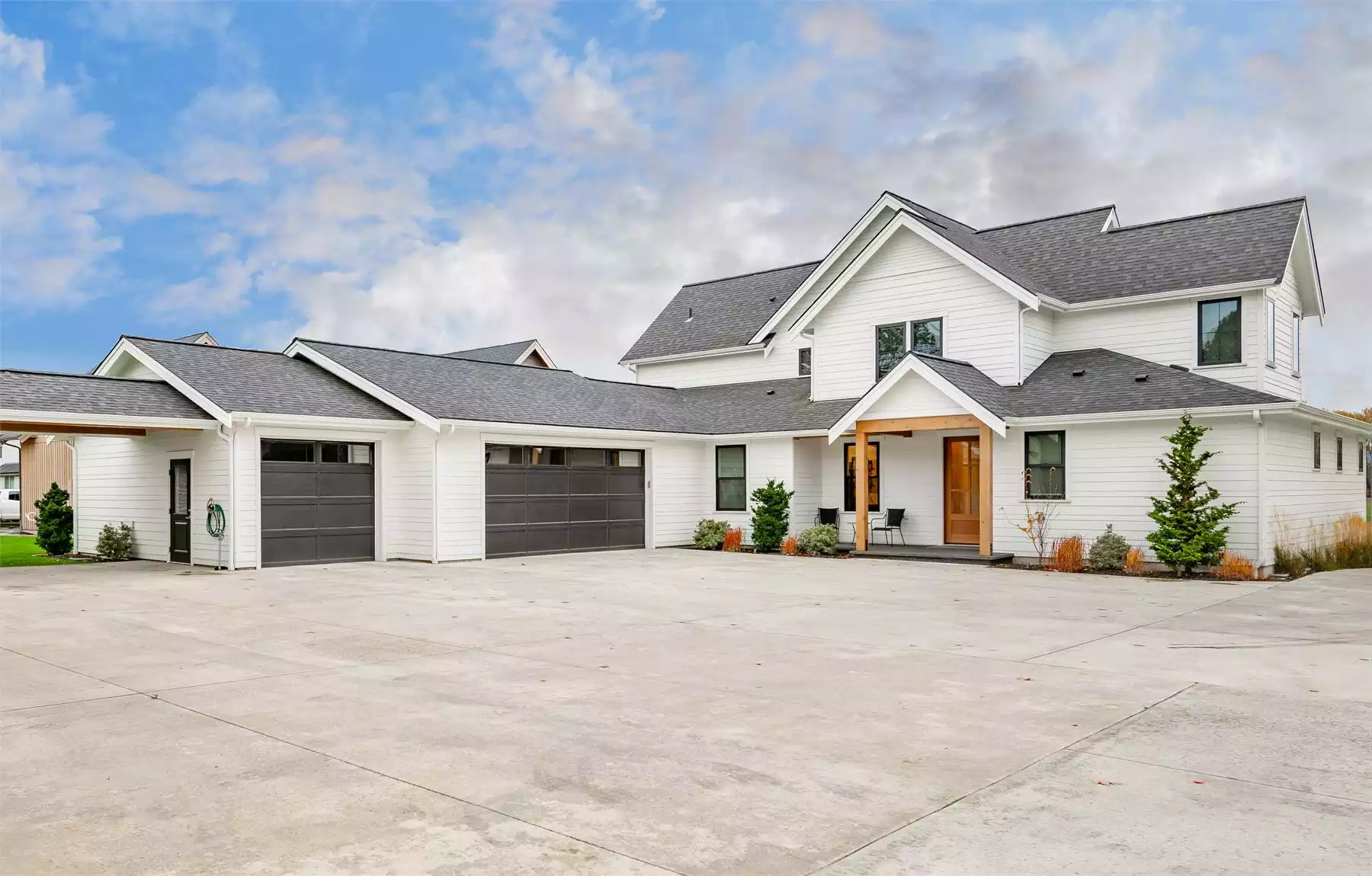 You will love the number of windows that grace the front of this beautiful 3,275 square foot 2-story farmhouse plan with three outdoor living spaces. Take a peek inside and you’ll see all the sweet modern farmhouse vibes. Off the foyer is a private front office and powder room, then a wide open floor plan where the living room, L-shaped kitchen and dining room enjoy the fireplace and wall of windows. Conveniently located behind the kitchen is the laundry room, mud room and casual family room.  The first floor plan also features the master suite, which is complete with double bowl vanity and walk-in closet. The second floor features three bedrooms and one full bath and some flexible space for the children.
