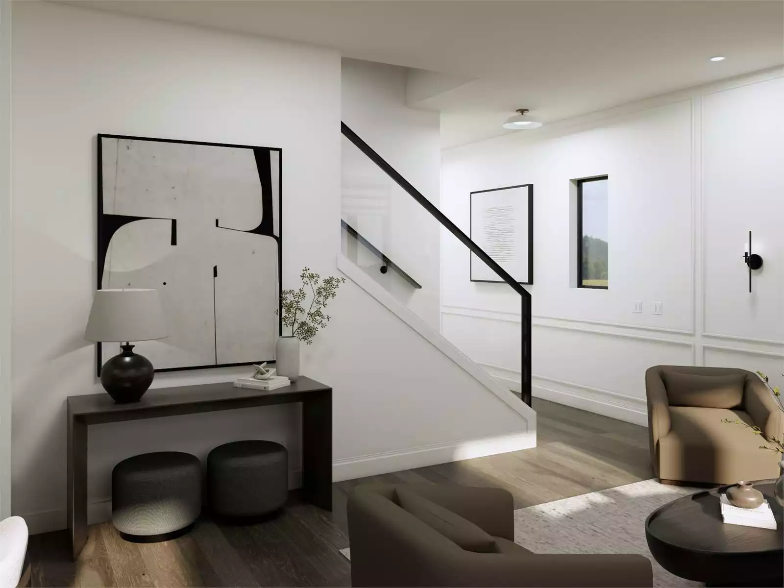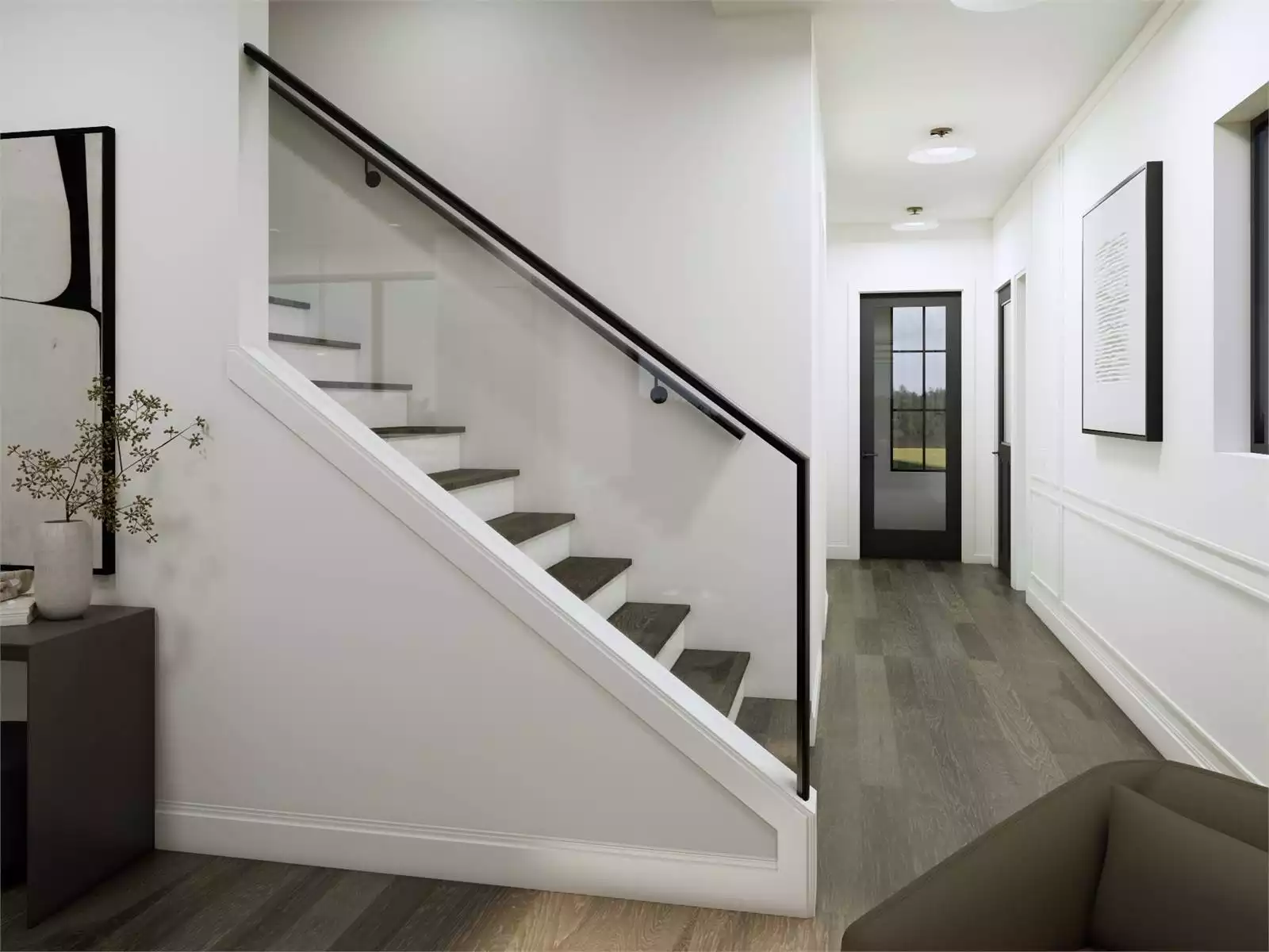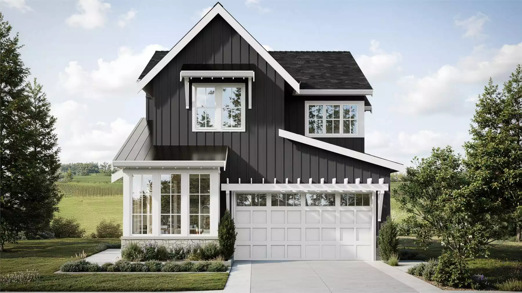 This charming 1,968-square-foot Modern Farmhouse home blends sleek contemporary touches with timeless comfort. The main level showcases an open-concept layout where the kitchen, dining, and living areas flow together seamlessly beneath soaring 10-foot ceilings. A private home office near the entry creates the perfect space for work or study, while a mudroom and main-level laundry keep things organized. Upstairs, the primary suite offers vaulted ceilings, a large walk-in closet, and a spa-inspired ensuite, while three additional bedrooms provide bright, inviting spaces for family or guests. The optional lower level expands living possibilities with a rec room, bedroom, full bath, and secondary kitchen, ideal for guests or multi-generational living. Thoughtful design details throughout make this plan as functional as it is beautiful. This inviting home captures the essence of modern family living with a warm and practical twist.