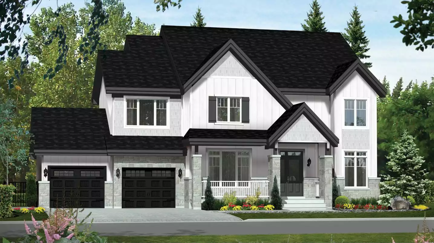 Need room to spread out, but still prefer a floor plan with defined living and sleeping quarters? House Plan 10483 could be the perfect fit! This two-story modern farmhouse boasts 3,096 square feet with four bedrooms and three-and-a-half baths along with totally open living space. When you step inside, the airlock foyer invites you to drop your coat before entering the house through French doors. You'll find the office and powder room on one side of the entry and the dining area on the other. The large island kitchen is in the middle of this floor's depth--and it seats six all in a row! The living area with a fireplace fills out a corner at the back of the house. The mudroom connecting to the garage is on the other side, and it sits conveniently beside the walk-in pantry to offload groceries with ease. Head upstairs to find all the bedrooms. The primary suite enjoys rear views and a walk-through closet to its five-piece bath. The other three bedrooms with front views include a smaller private suite and two that share a hall bath. The laundry room is centrally located up here as well!