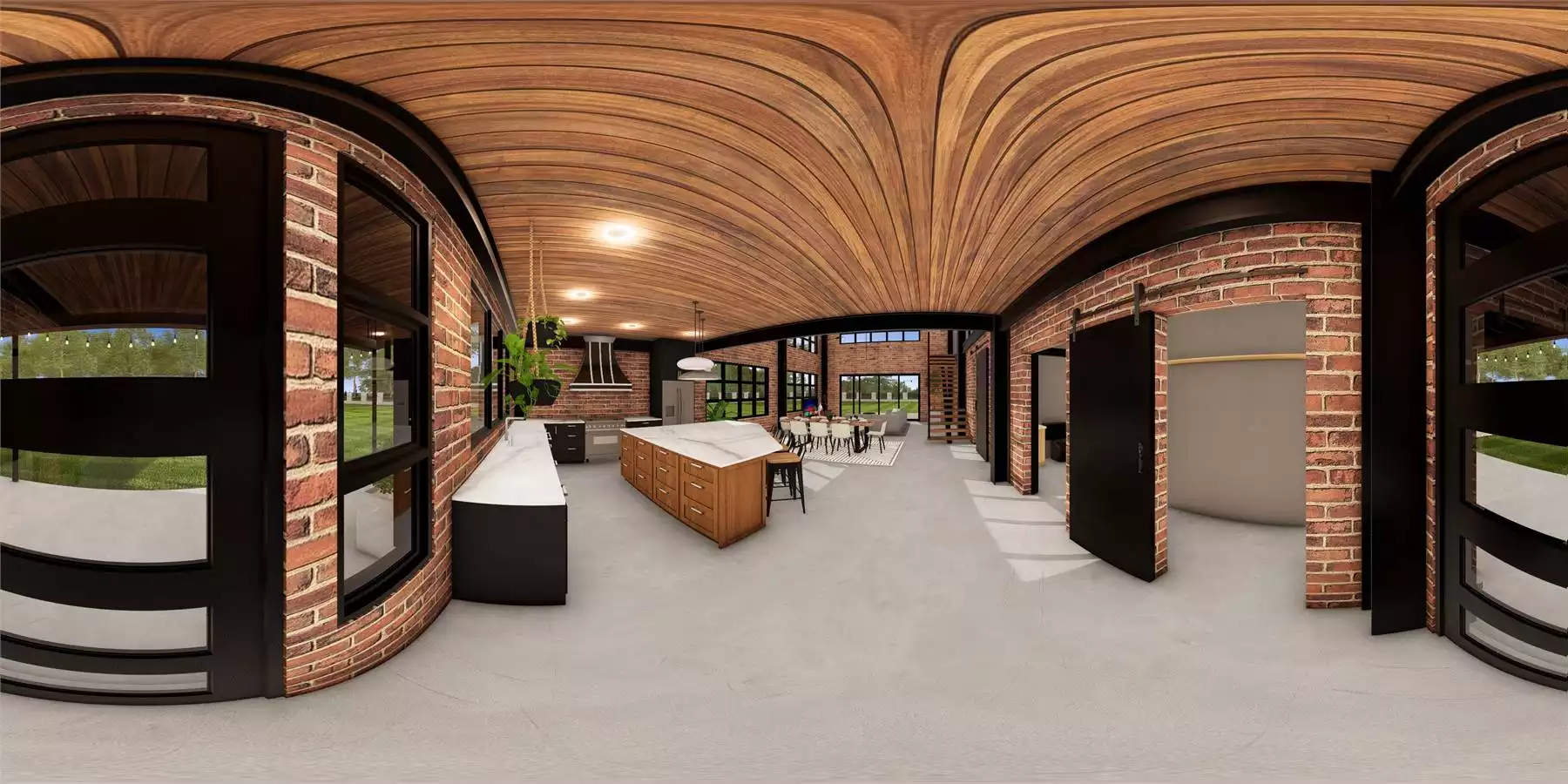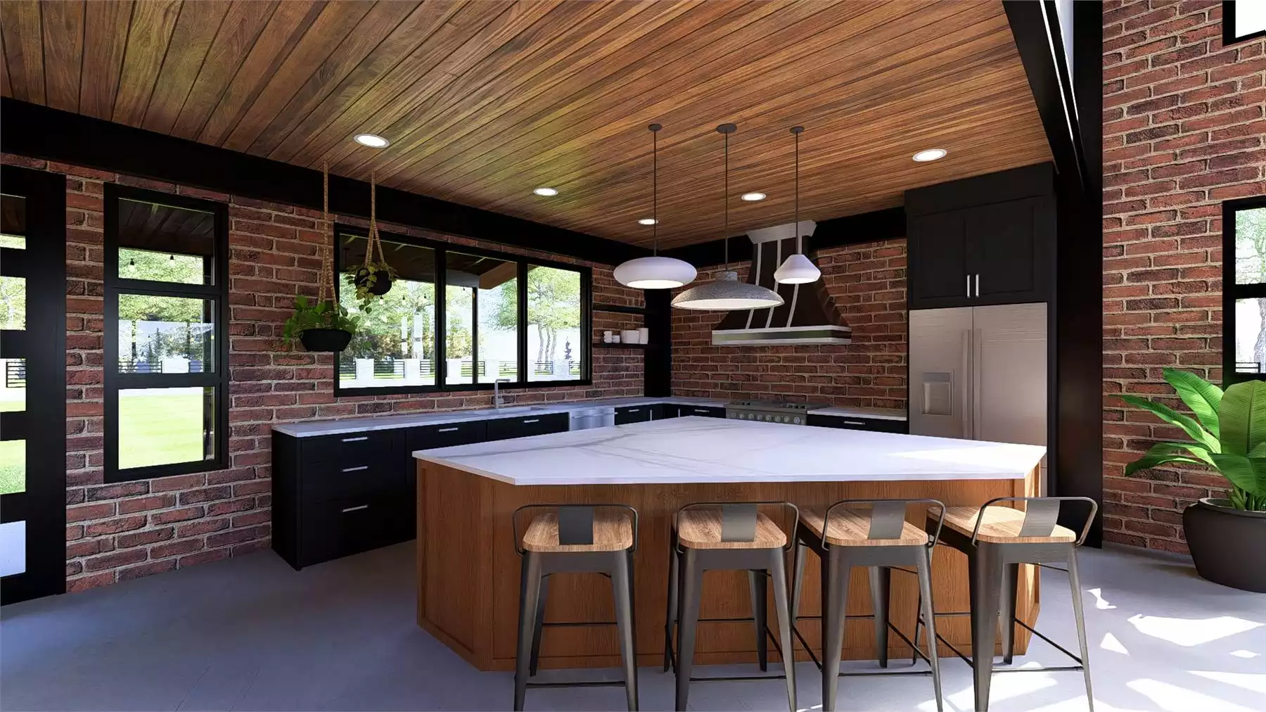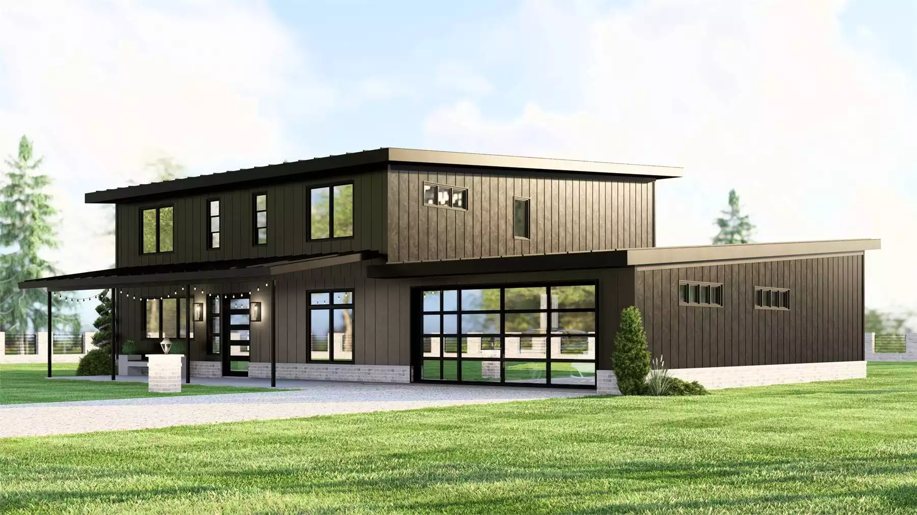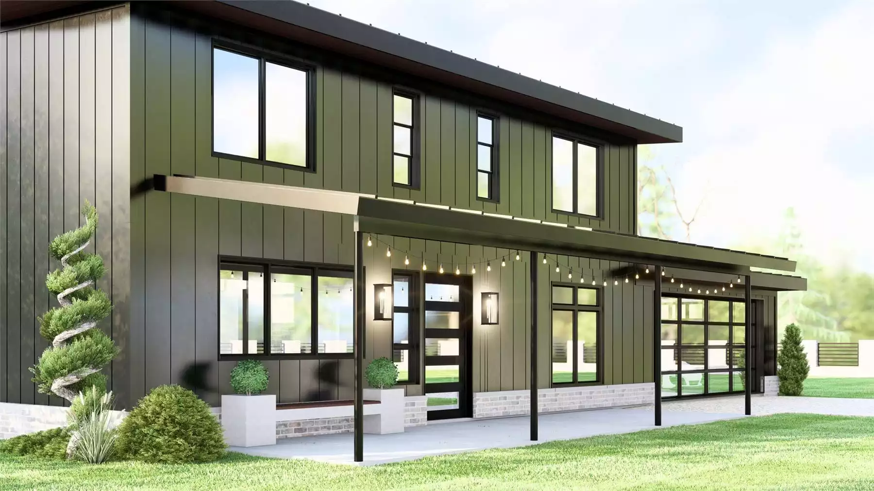 Andersonville is a refined contemporary-transitional house plan featuring 3,147 square feet of thoughtfully designed living space. The main level highlights a two-story great room and dining area that fill the home with natural light, creating an inviting atmosphere. A stylish kitchen with a large island and walk-in pantry makes cooking and entertaining effortless. The primary suite sits privately on the main floor, complete with a spa-inspired bathroom and an oversized walk-in closet. Upstairs, a spacious loft connects to two additional bedrooms, each with its own walk-in closet. Outdoor living shines with a wide covered porch and dual patios, perfect for year-round enjoyment. A dedicated home office, mudroom with built-in lockers, and a 2-car garage ensure functionality for everyday life.