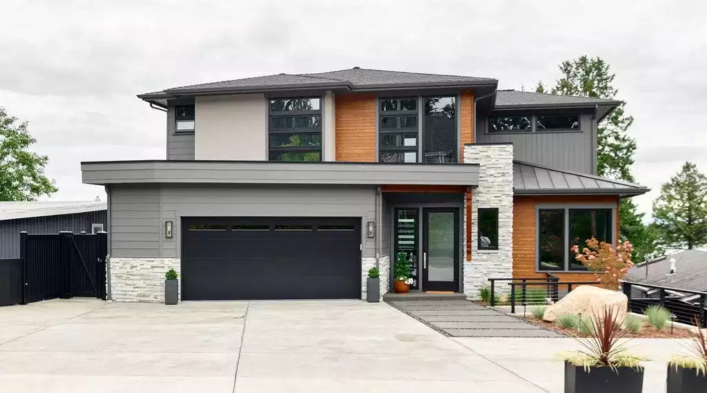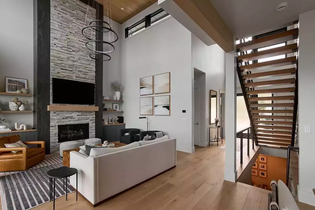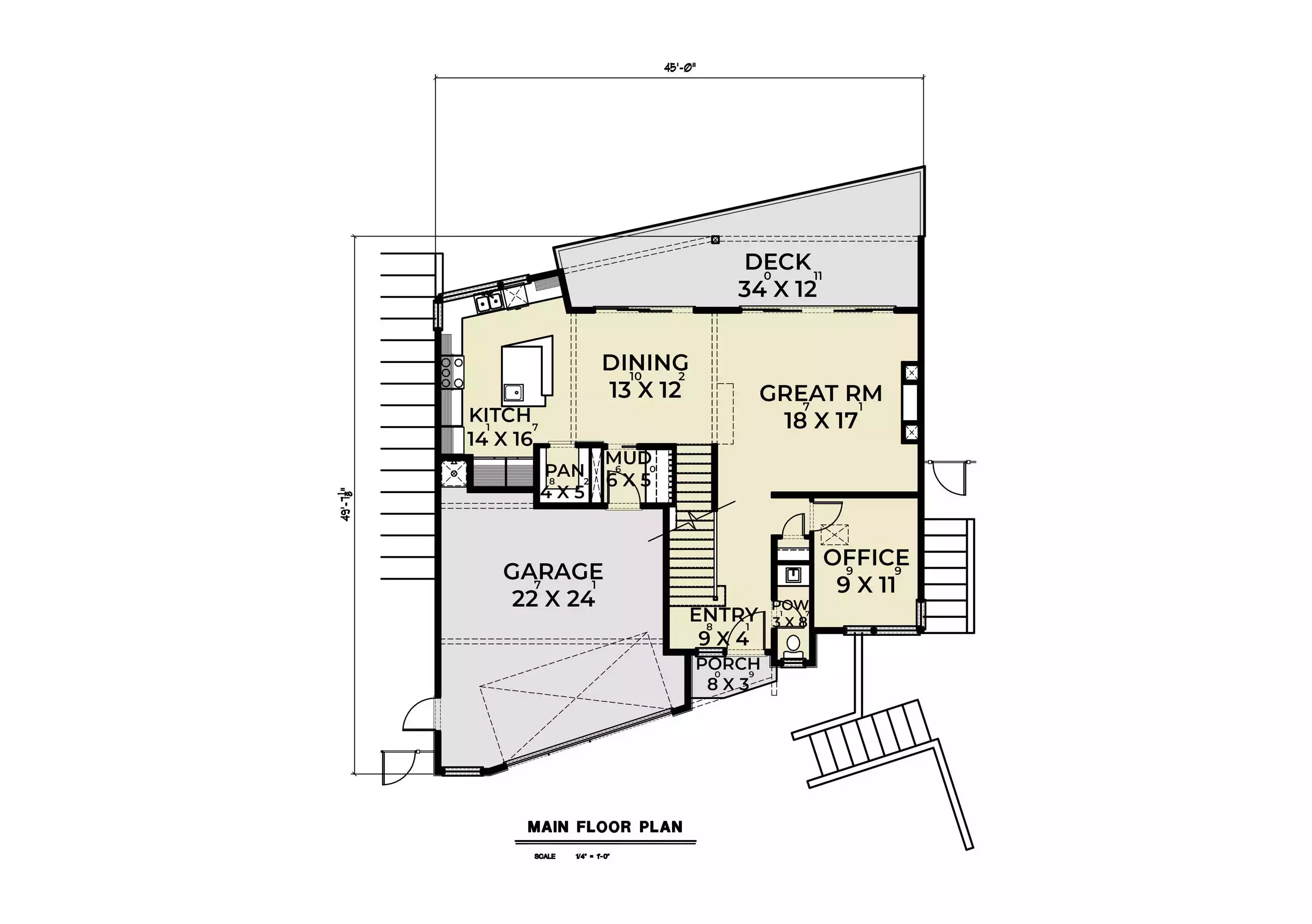 Azaleia is a thoughtfully designed modern house plan that blends bold exterior architecture with highly livable interior spaces. The main floor centers around an open great room, dining area, and kitchen that flow seamlessly together and extend outdoors to a generous deck, creating a strong indoor–outdoor connection. A dedicated home office and attached two-car garage add everyday convenience to the layout.