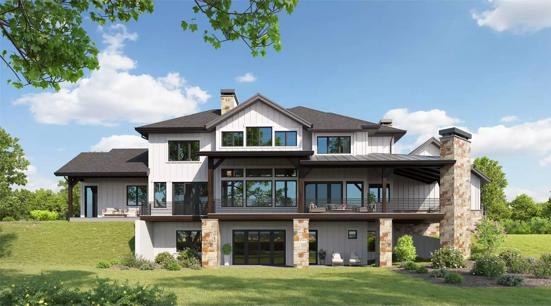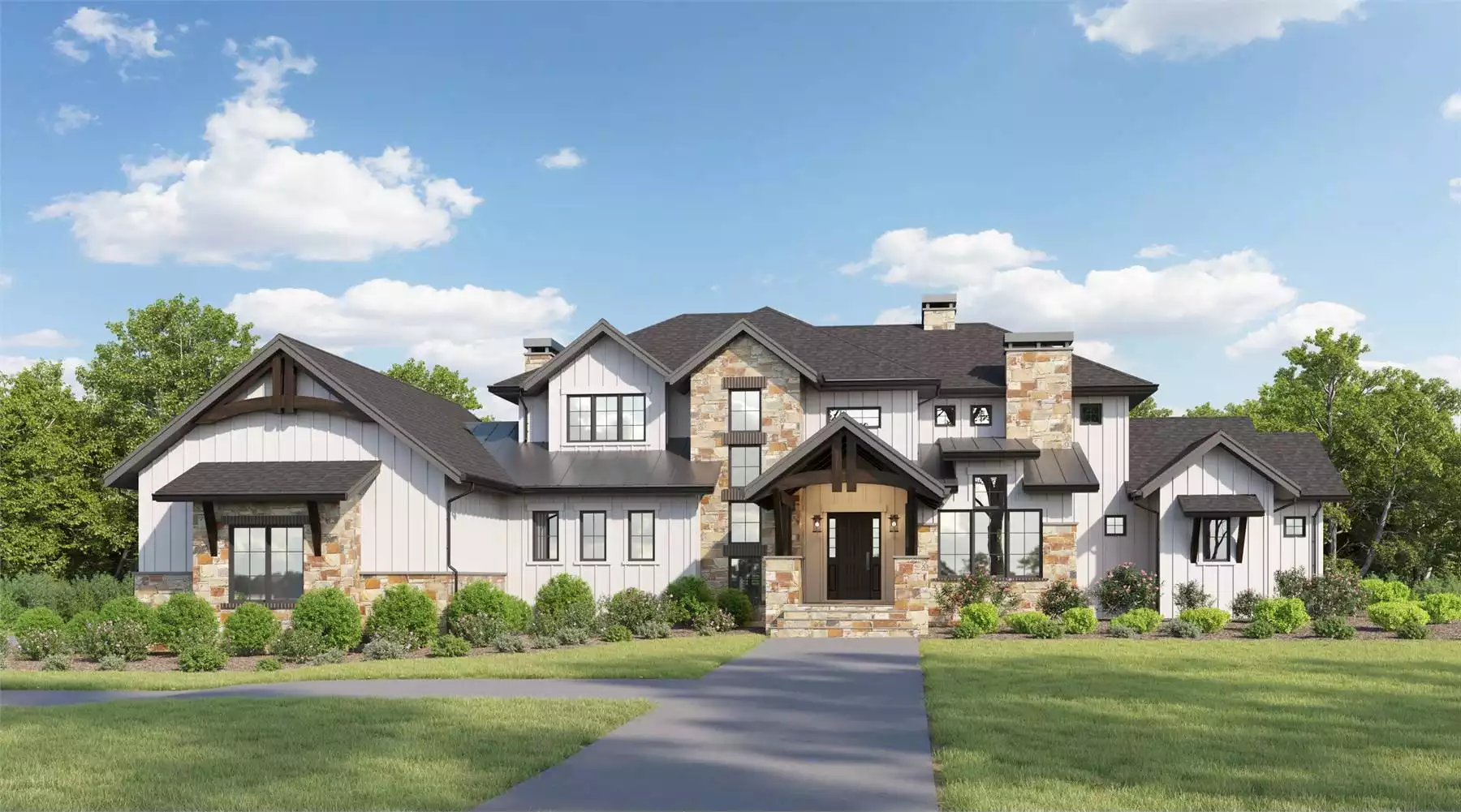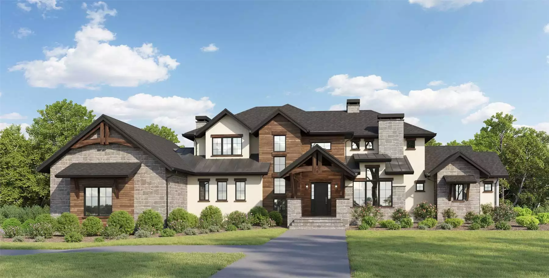If you're looking for a grand family home with rustic appeal, give House Plan 10819 a try! This 3,612-square-foot design spreads four bedrooms and three-and-a-half bathrooms across two levels. Step inside and you'll notice an office beside the foyer with unique corner barn door while the great room fills out the back. There's a large island kitchen beside the dining area and living space with a voluminous vaulted ceiling and a fireplace. Make sure not to miss the wraparound back porch, which also has a fireplace for cozy evenings outside. The primary suite is located on the main level and features a two-sided fireplace, a five-piece bath, and dual walk-in closets. Finally, a large mudroom that connects to the laundry room, walk-in pantry, and the three-car garage completes this story. Head upstairs to find the secondary bedrooms, with two sharing a Jack-and-Jill bath on one side of the bridge and one having its own private bath on the other. If you'd like to expand, this home's included walkout basement adds two more bedroom suites, another full bath, a family room, a home theater, and even an additional laundry closet!