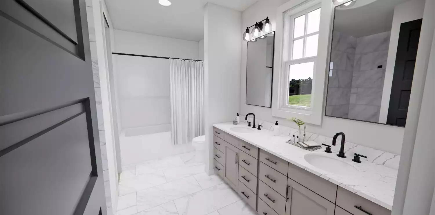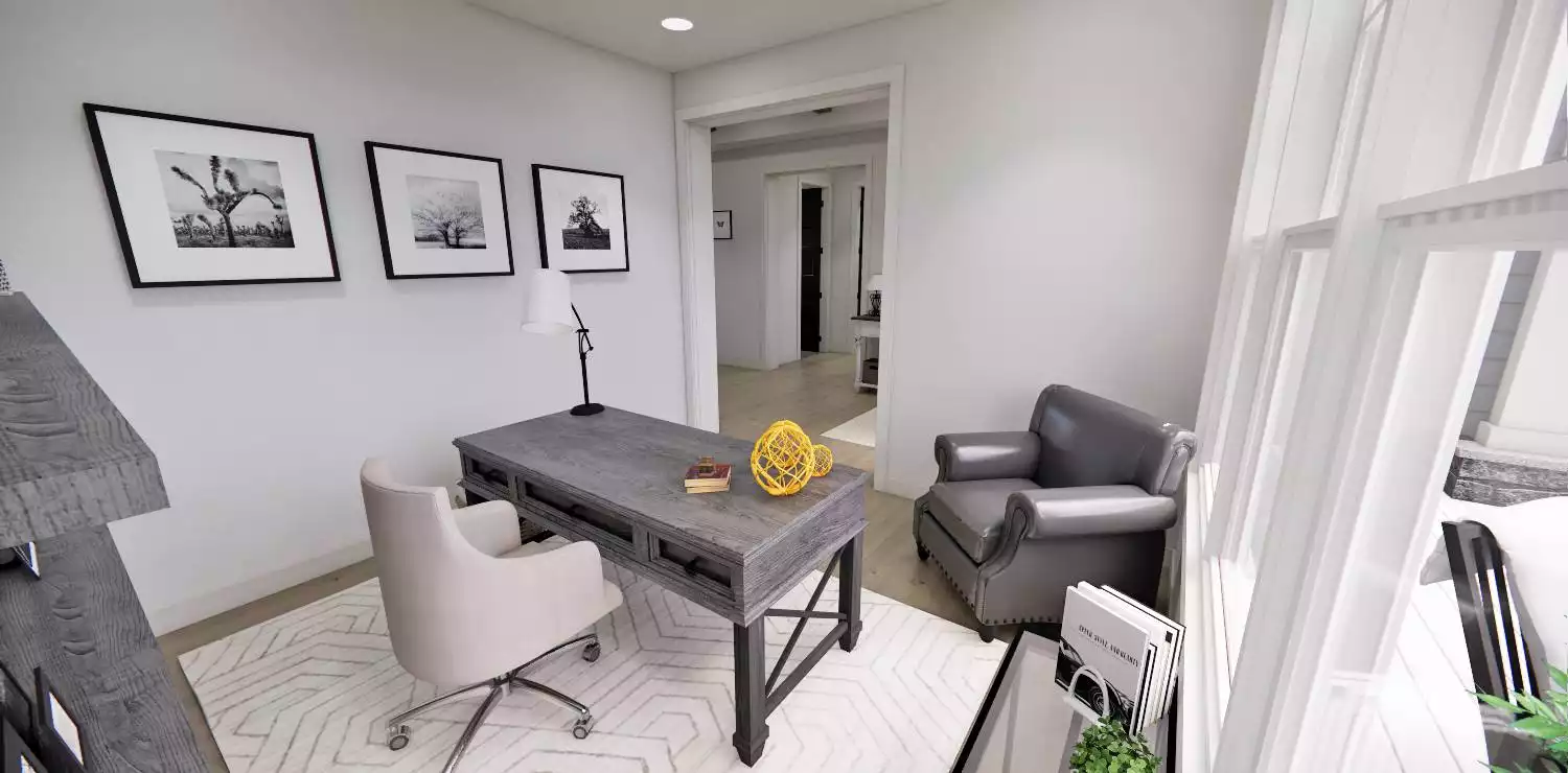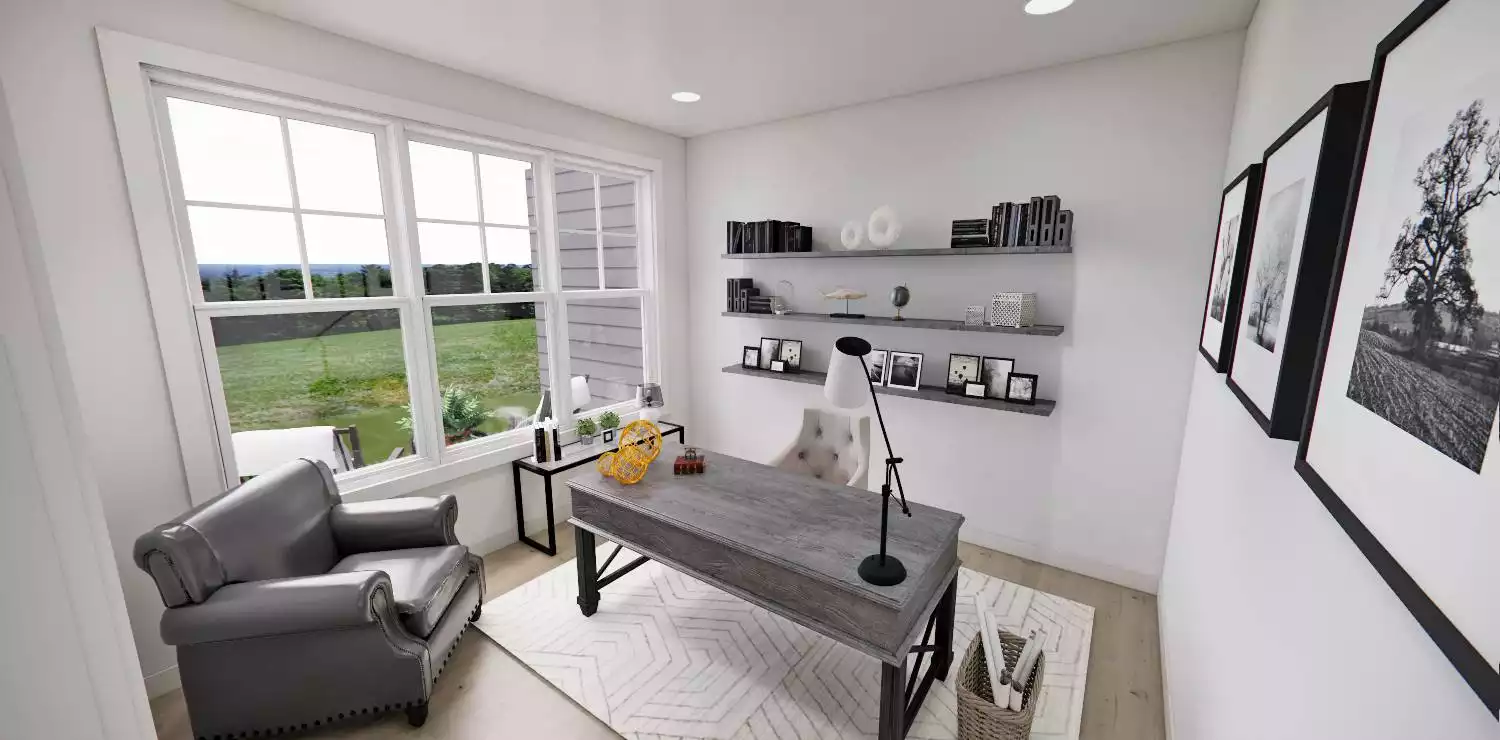 This welcoming home offers 2,381 square feet of heated living space with 3 bedrooms and 2 baths arranged on a single level. The open floor plan centers around a vaulted great room that creates a bright and spacious gathering area for everyday living and entertaining. The kitchen features an L-shaped layout with a center island, peninsula eating bar, and walk-in pantry for both function and flow. The primary bedroom is privately located on the main floor and includes a walk-in closet along with a bath featuring a double vanity, separate tub, and shower. Split bedrooms provide added privacy for family or guests, while a home office adds flexible workspace. A covered front porch completes the design with inviting curb appeal and comfortable outdoor living.