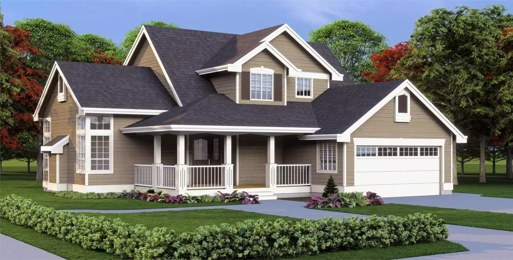 The Oakridge is a charming traditional family home offering 1,735 square feet of comfortable living space. Its inviting wraparound front veranda sets the tone for a warm and welcoming interior, featuring a spacious main floor with a vaulted great room and cozy fireplace, a separate dining room, and a well-appointed kitchen with ample counter space and a central island. The main-floor primary suite includes a large walk-in closet, ensuite, and convenient laundry access. Upstairs, you'll find three additional bedrooms and a full bath, making this 1.5-story design perfect for families. A two-car garage completes this thoughtfully designed home.