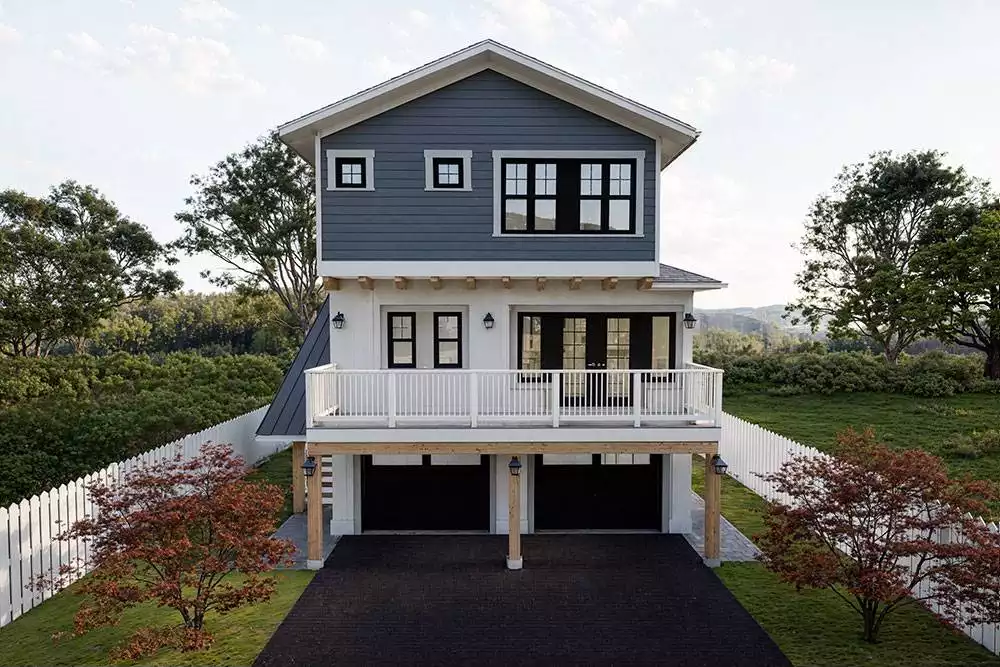 Need a home that really condenses its footprint and offers a boosted layout perfect for capturing views? That's just what you'll get with House Plan 11198! This beachy transitional house features a two-story design of 1,562 square feet over a drive-under garage level to make the most of a smaller lot or minimize your lot coverage. In addition to two bays, you'll find a workshop area and a storage room in back! Head up the exterior staircase to come to the main floor with the foyer on the side. The main areas line up with the dining space in front, a unique U-shaped peninsula kitchen in the middle, and the sunny living space with a fireplace in back. There's also a powder room and the laundry room along the front of the house, and a front deck, too! The covered rear deck beside the living area is accessible through the patio door in the foyer, and it also offers and outdoor fireplace and stairs down to the backyard. Upstairs, all three bedrooms are grouped family-style. The primary suite enjoys its own private three-piece bath, a walk-in closet, and another reach-in closet while the secondary bedrooms share a four-piece hall bath. Make sure to appreciate all the windows in this lovely home!