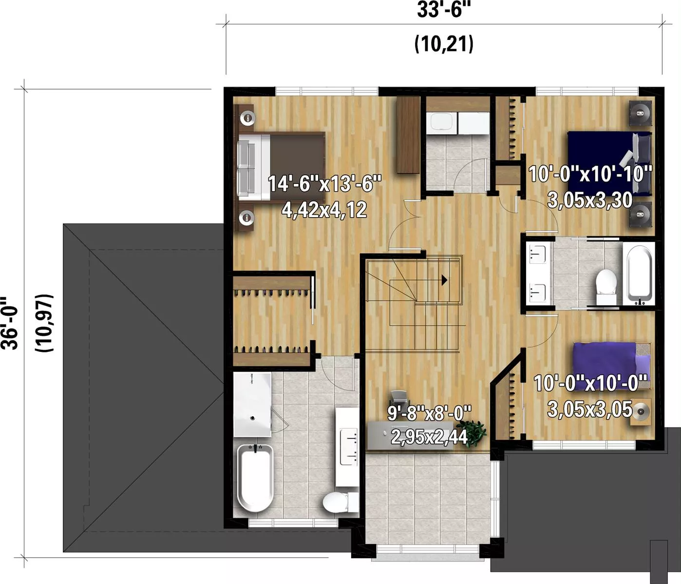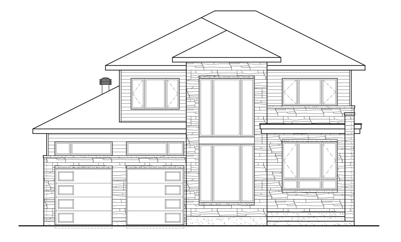 This stunning two story modern contemporary shouts luxury from the curb with its dramatic windows and use of stacked stone and glass. Sitting at an affordable 1,966 square feet, this plan is perfect for a growing family or young adults wanting to invest in their first home and build smart equity.