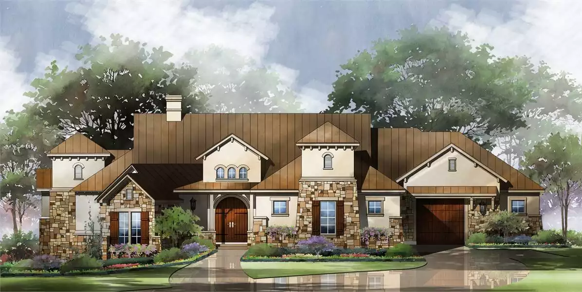 Imagine driving up to your new European one-story house plan! You'll love the stone accents and graceful arches of this home plan. Double doors open to the elegant foyer and the fantastic great room beyond. The island kitchen serves the dining area with ease. A sizable rear porch is perfect for summer meals. A fun game room with wet bar flows into a media room with bunk beds. The secluded master suite boasts a peaceful sitting area and an opulent bath. Private baths and walk-in closets are featured in the three secondary bedrooms; one bedroom could be used as a study or home office.